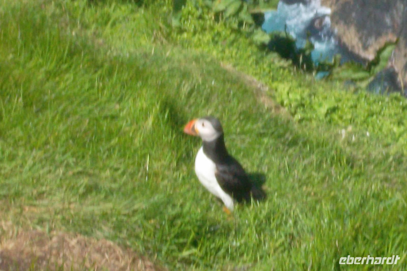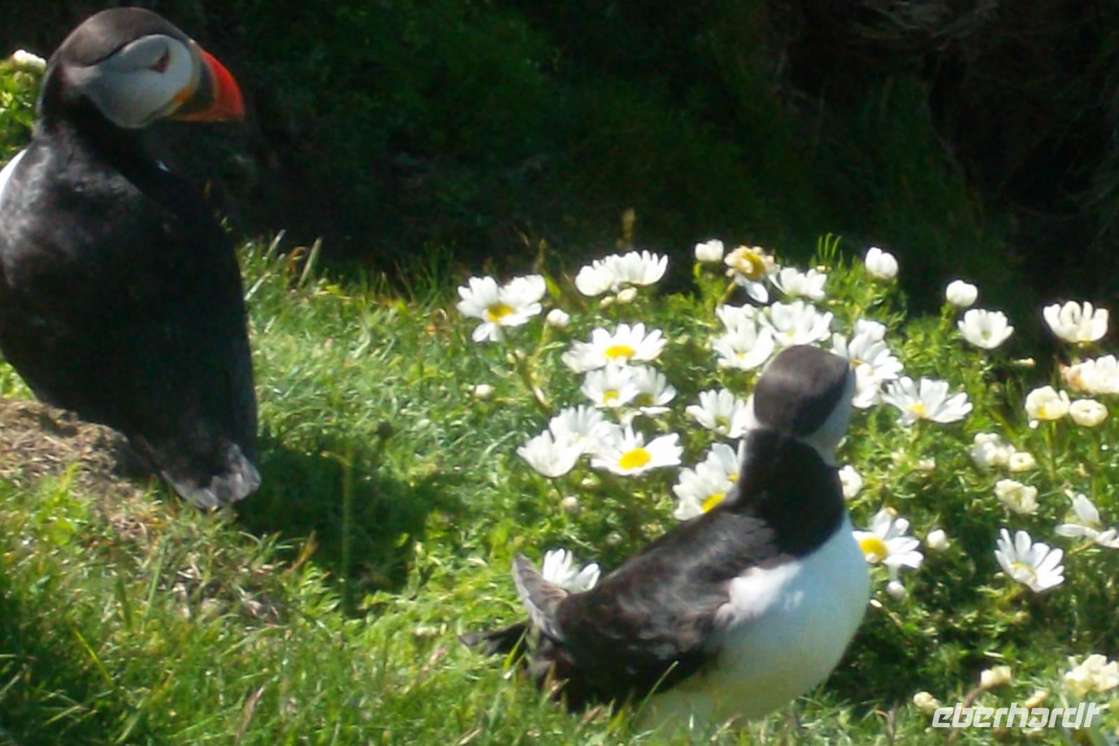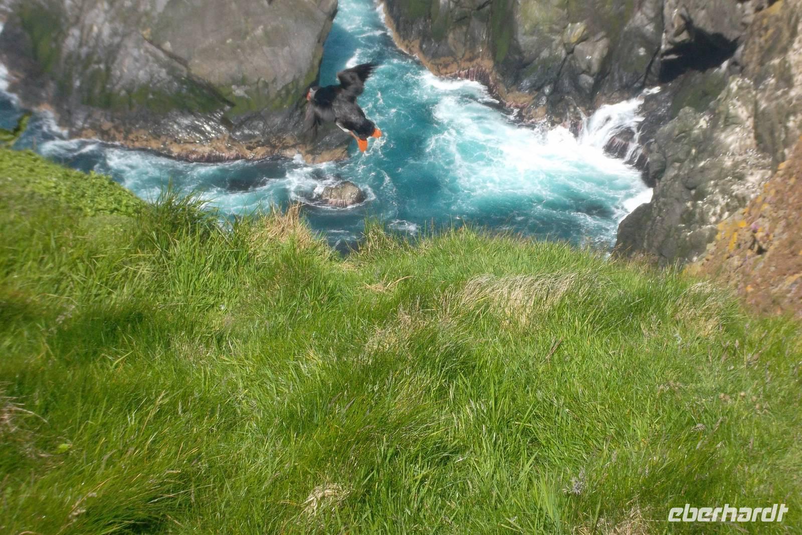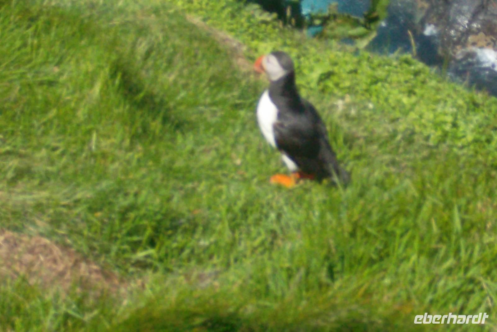 Das was aber alle als besonderen Höhepunkt empfanden, kam erst danach: während der Bus auf dem südlichsten Parkplatz der Shetlands stand, wanderten wir zu den Aussichtspunkten von Sumburgh Head. Hier kann man nicht nur tausende Seevögel nisten und brüten sehen, die fotogenen und putzigen Papageientaucher agieren hier in wenigen Metern Entfernung vom Betrachter. Alle von uns haben die hübschen Vögel und ihre teilweise sehr komischen Flugübungen beobachtet und konnten sich kaum trennen von diesen Vögeln, die man fast nirgends aus so kurzer Distanz beobachten kann.