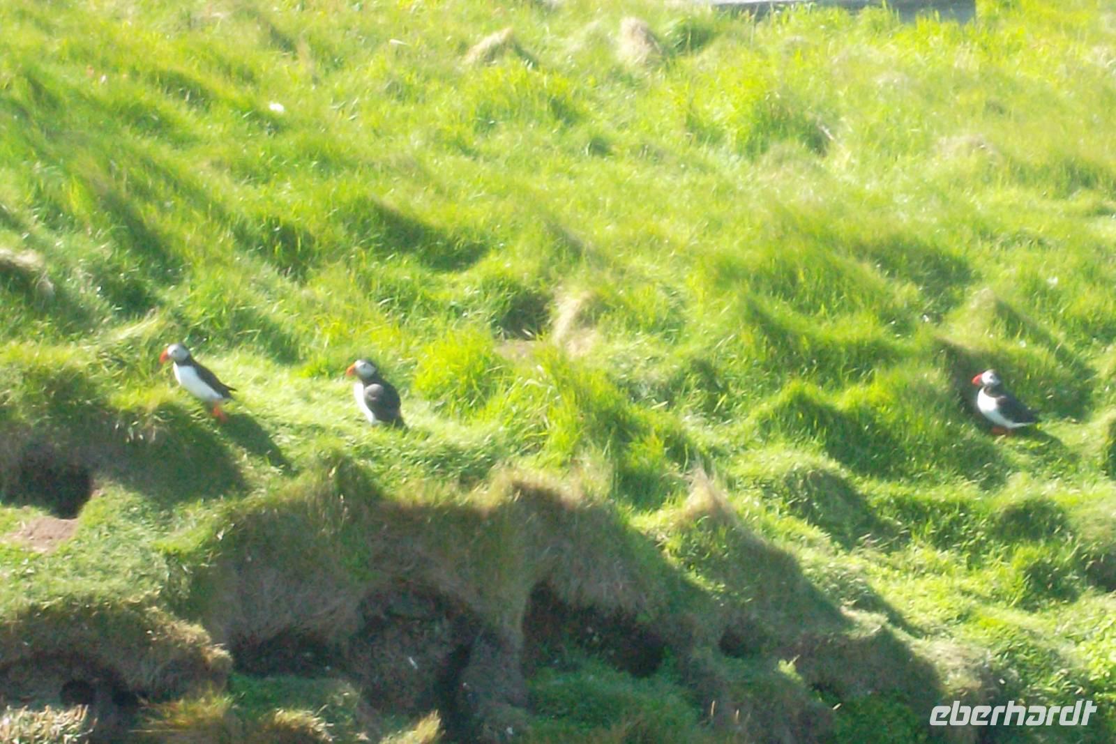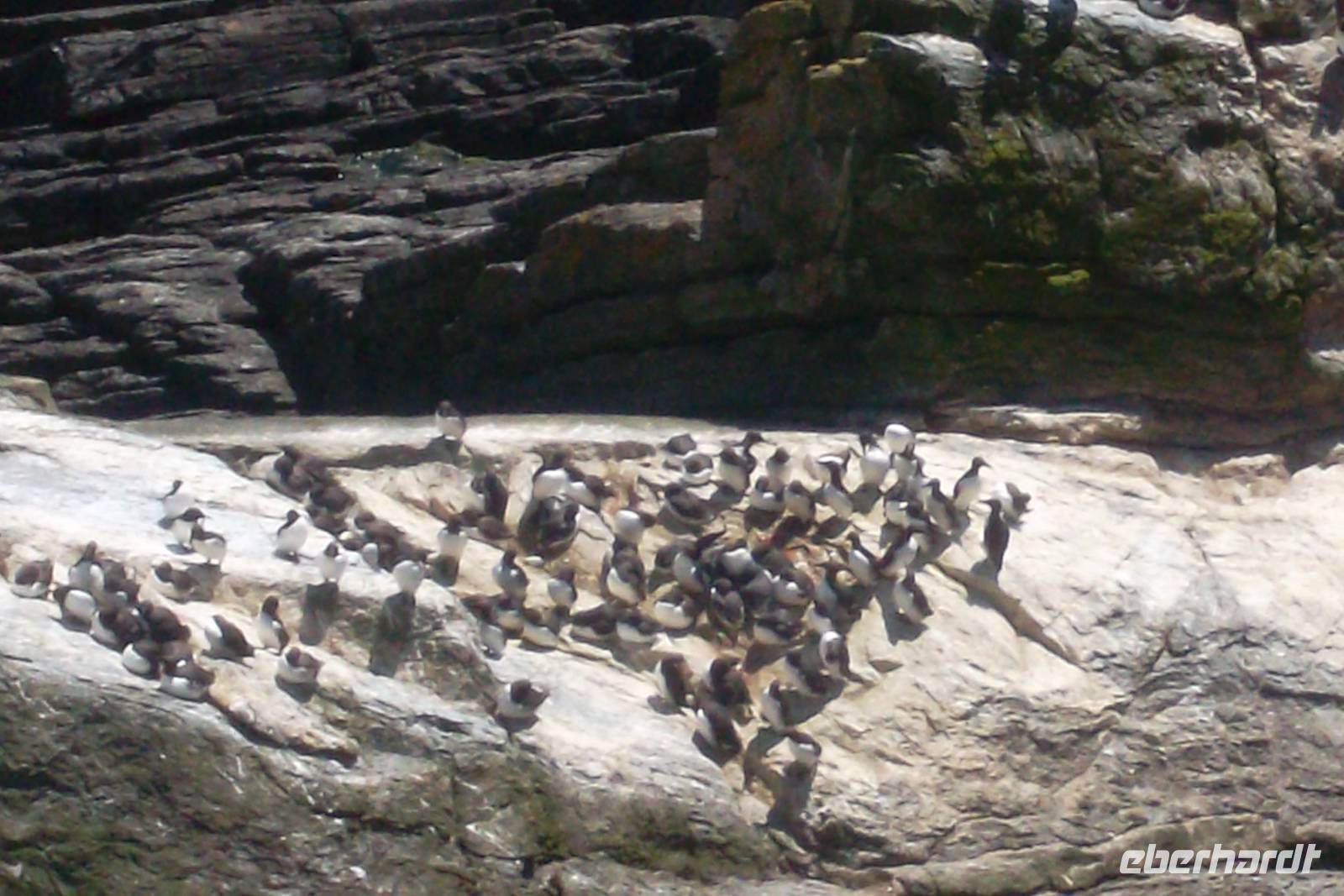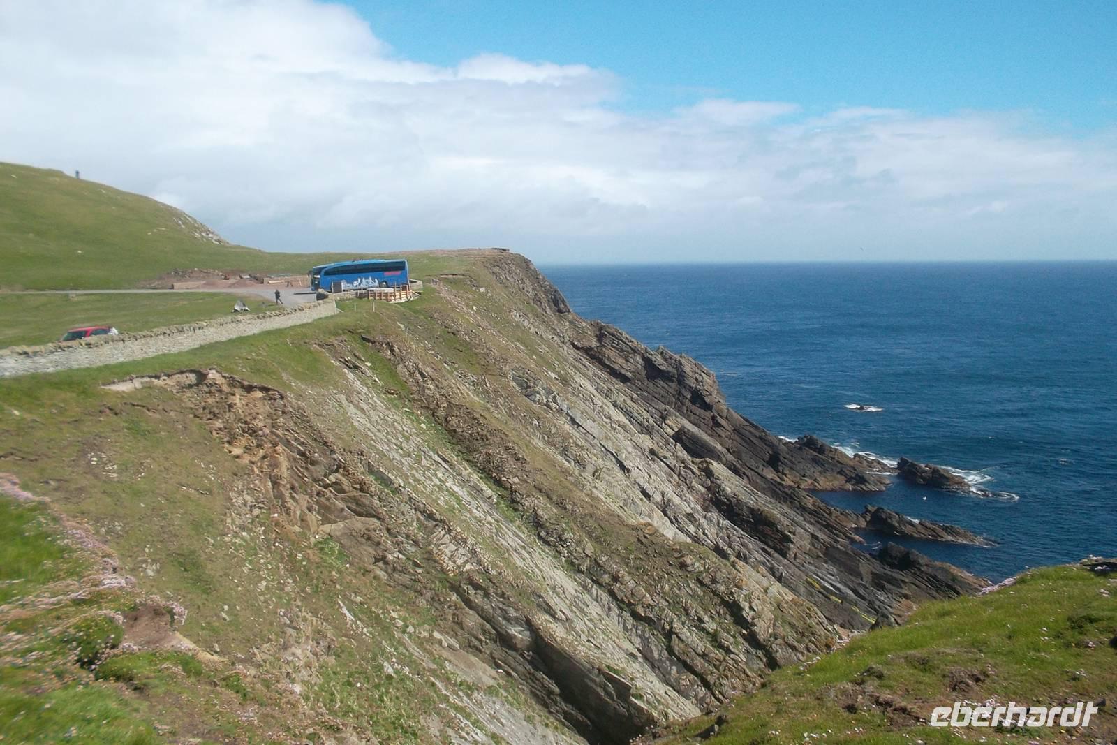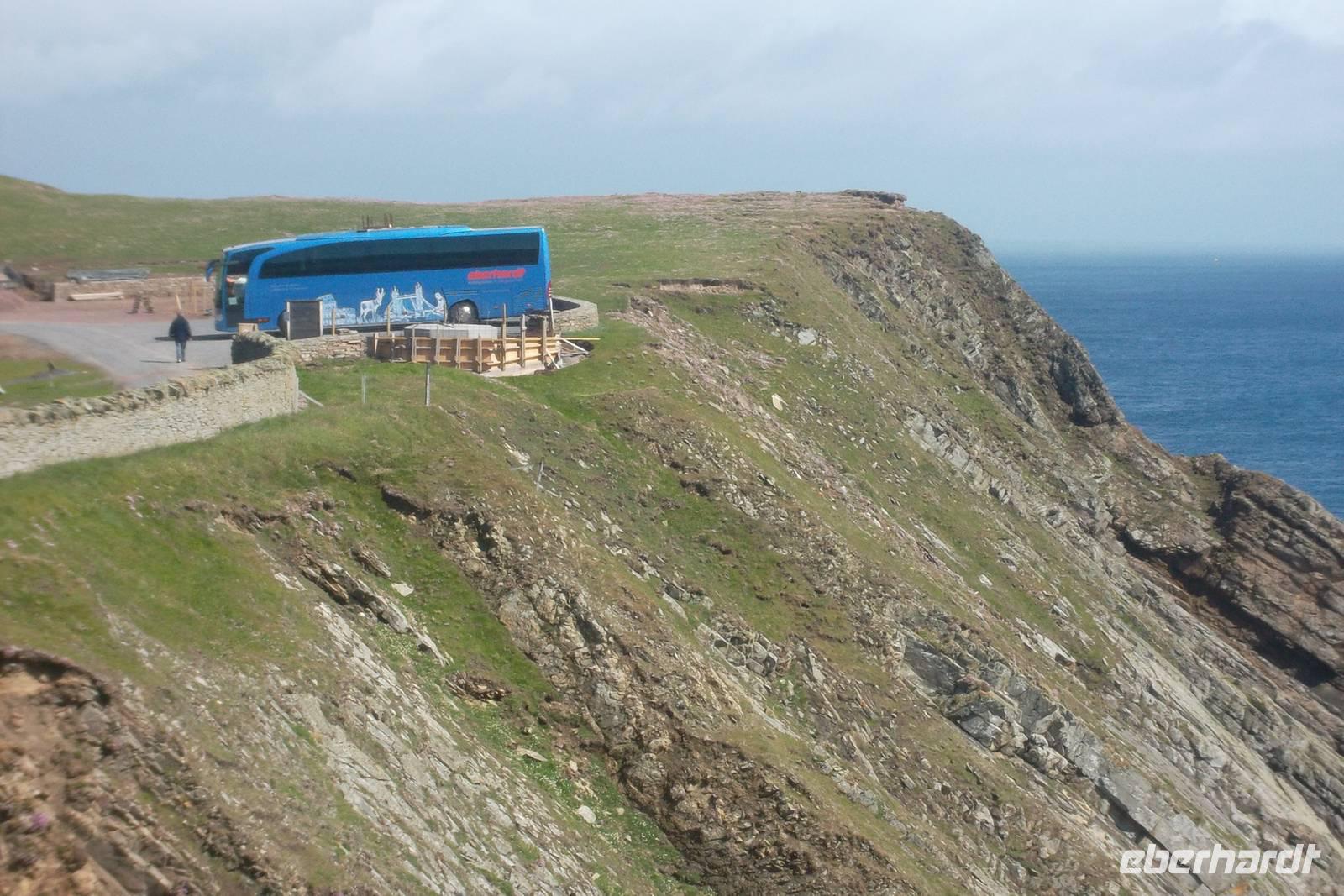 Das was aber alle als besonderen Höhepunkt empfanden, kam erst danach: während der Bus auf dem südlichsten Parkplatz der Shetlands stand, wanderten wir zu den Aussichtspunkten von Sumburgh Head. Hier kann man nicht nur tausende Seevögel nisten und brüten sehen, die fotogenen und putzigen Papageientaucher agieren hier in wenigen Metern Entfernung vom Betrachter. Alle von uns haben die hübschen Vögel und ihre teilweise sehr komischen Flugübungen beobachtet und konnten sich kaum trennen von diesen Vögeln, die man fast nirgends aus so kurzer Distanz beobachten kann.