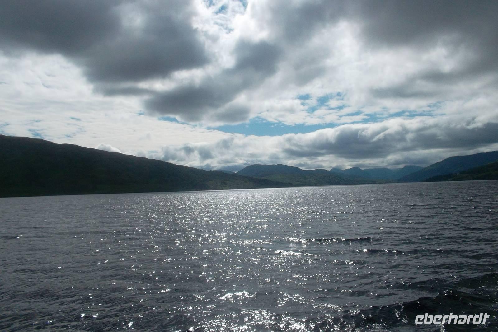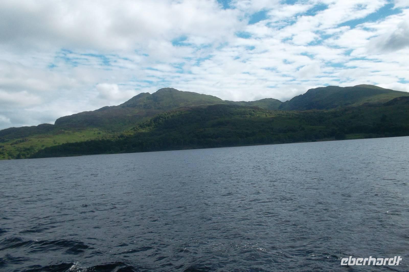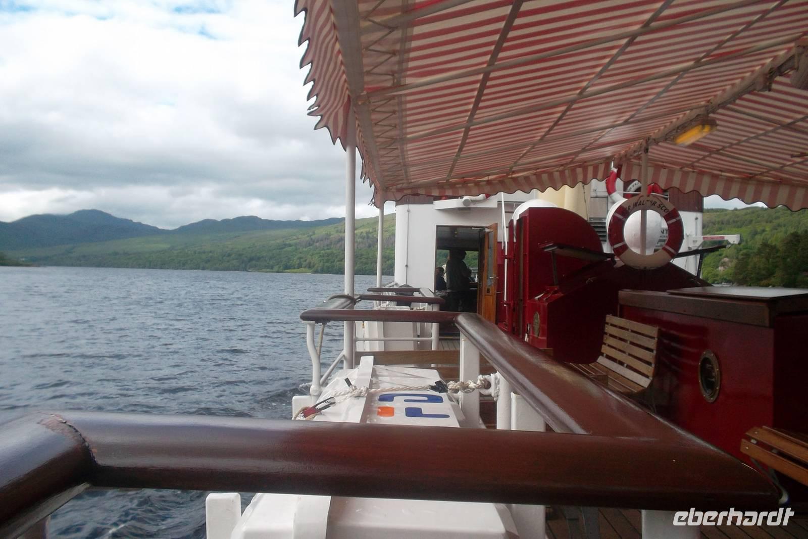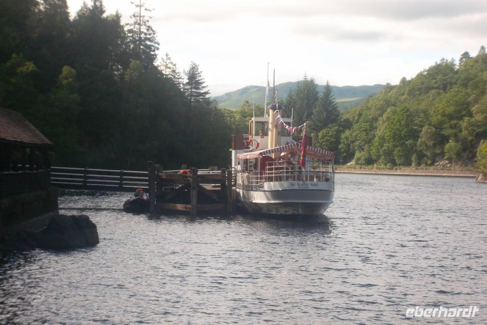 Nach dem Besuch der Brennerei folgte noch ein kleiner Abstecher mit etwas Freizeit in den Kurort Pitlochry und weiter ging es am Loch Tay vorbei bis zum Städtchen Killin, wo sich die reizvollen Dochart-Wasserfälle befinden. Nach einem Fotostopp hier setzten wir die Fahrt fort durch die Wälder, die zu den Trossachs gehören. Einst lebte hier Rob Roy, ein Gesetzloser, der in Schottland etwa den Ruf des englischen Robin Hood hat. Er ist auch eine bedeutende Romangestalt bei dem schottischen Nationaldichter Sir Walter Scott, und viele kennen die berühmte Verfilmung seiner Lebensgeschichte mit Liam Neeson. Im Herz der Trossachs liegt der glasklare See Loch Katrine. Er bildet den schönsten Teil jener Landschaft, die als eine der ersten schottischen Gegenden Touristen angezogen hatte. Hier ist auch der Schauplatz von Scotts Verserzählung „Lady of the Lake", einer der „Bestseller" im frühen 19. Jahrhundert, der tausende Besucher anlockte. Eine Dampferfahrt auf dem wundervoll gelegenen See, gleichzeitig das Trinkwasserreservoir von Glasgow, bildete den abschließenden Höhepunkt des Tages. Von zauberhafter Landschaft umgeben, konnten wir auf dem historischen Dampfschiff „Sir Walther Scott", das schon weit über hundert Jahre im Dienst ist, in toller Natur von Schottland träumen.