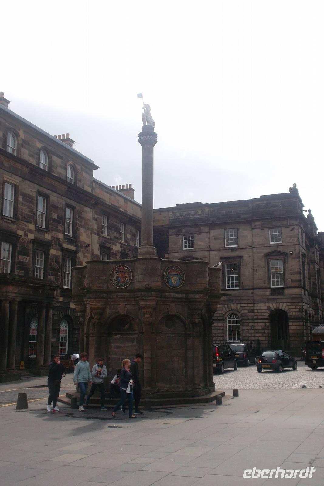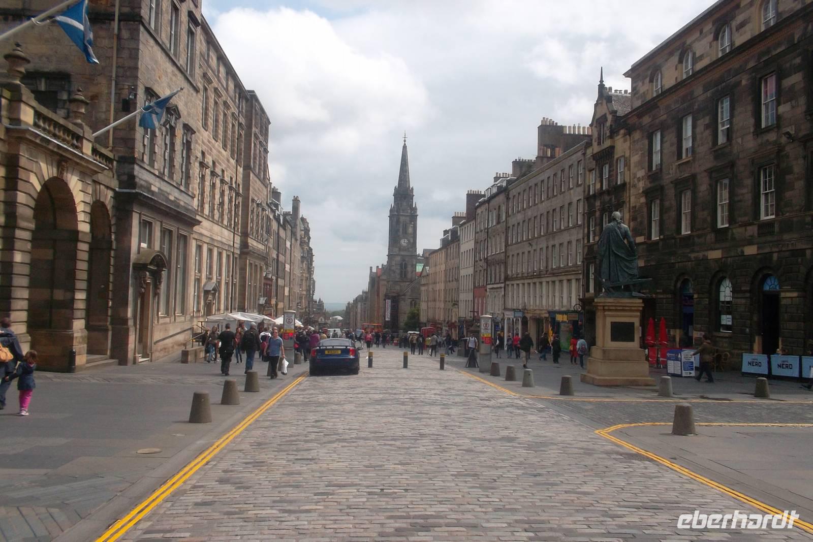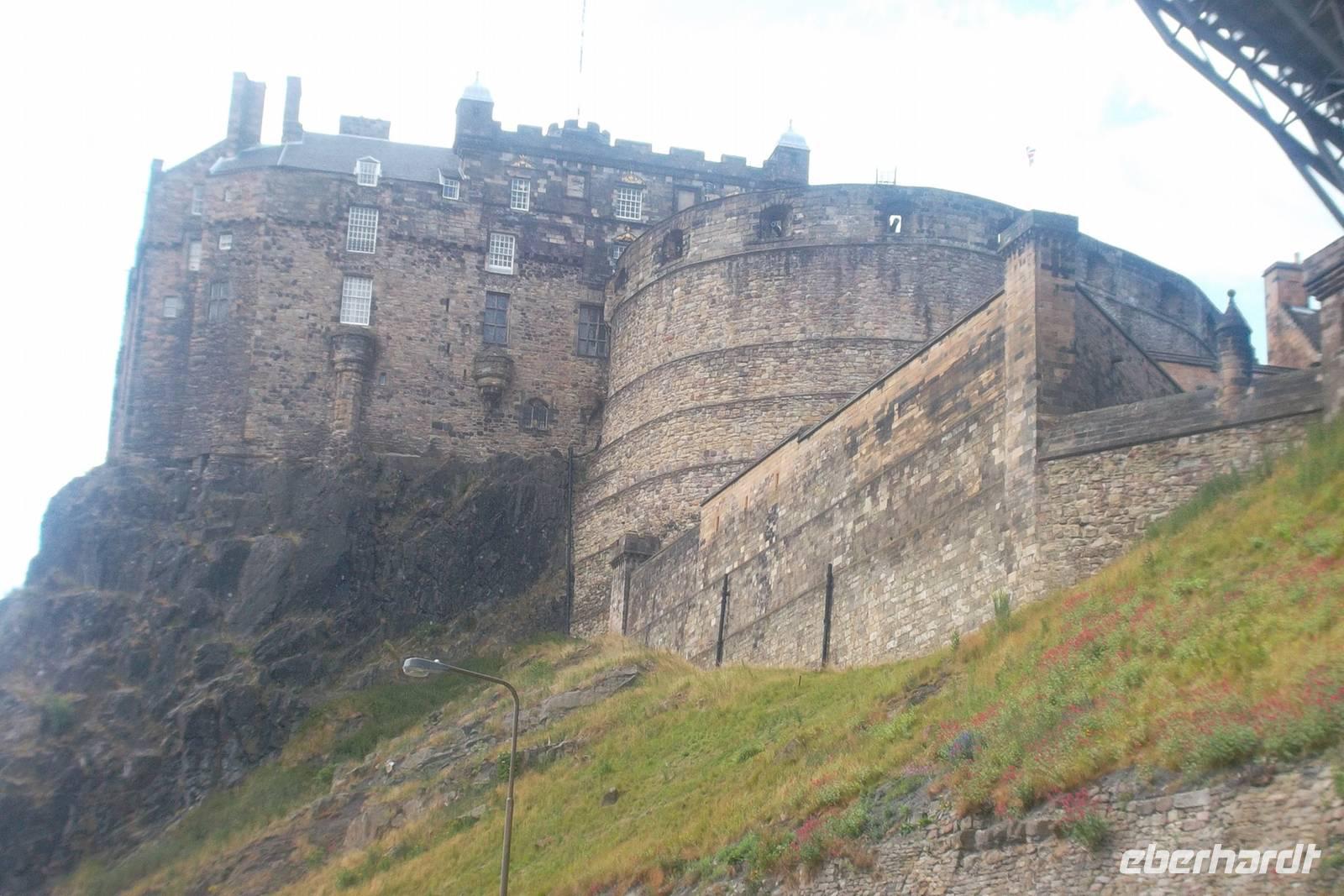Heute war die Besichtigung der schottischen Hauptstadt geplant. Die Stadtrundfahrt mit Stadtführerin Helen begann mit einer ausführlichen Tour durch die Neustadt. Dieser - größere! - Teil Edinburghs wurde im 18.Jahrhundert in georgianischem Stil erbaut, als die total überfüllte Altstadt mit ihren mangelnden Hygiene-Einrichtungen und unsicheren Hochhäusern erweitert werden musste. Es entstanden kleine und große Stadtpaläste mit d gusseisernen Balustraden vor den winzigen Balkonen und eisernen Gitterzäunen mit Fackellöschern und Stiefel-Abtretern rund um das Haus - charakteristisch für das Edinburgh des 18. Und 19. Jahrhunderts. Da es ausgiebig regnete, haben wir Fotos vor allem durch die Busfenster gemacht. Und weil gerade die britische Königin derzeit in Edinburgh weilte und vor Touristen geschützt werden musste, war dieses Mal leider kein Halt am Palast von Holyroodhouse möglich. Dieser ist nämlich neben Windsor und dem Schloss Balmoral nahe Braemar in den Grampian Mountains eine der offiziellen königlichen Residenzen. So fuhren wir hier nur langsam vorbei und nahmen auf der Weiterfahrt den Blick auf das neue Parlamentsgebäude mit, bevor wir die „Royal Mile" erreichten. Diese Innenstadtstraße zieht sich längs durch Edinburghs Altstadt und verbindet den Holyroodhouse Palast und das Edinburgh Castle miteinander - angeblich soll sie wirklich genau eine Meile lang sein- soll. Wir passierten viele „kleinere" Sehenswürdigkeiten wie die beliebte Hunde-Statue von „Greyfriars Bobby" oder das Standbild von Sherlock Holmes und erreichten dann - bei heftigem Regen - die Johnston Terrace gleich neben dem Aufgang zum Castle, wo der Bus parken konnte. Bei einer kleinen Führung durch die Burg (genau genommen noch heute Militärgelände) sahen wir die Mittagskanone neben den von Königin Victoria als „Dekoration" gespendeten Schiffskanonen und die verschiedenen Kasernen auf der Burg, sowie den ältesten Teil der Burg mit der Margarethen-Kapelle. Die Führung endete auf dem Platz vor dem Haus der Kronjuwelen - und wir hatten nun drei Stunden Freizeit für individuelles Kennenlernen der Burg und der Innenstadt von Edinburgh!