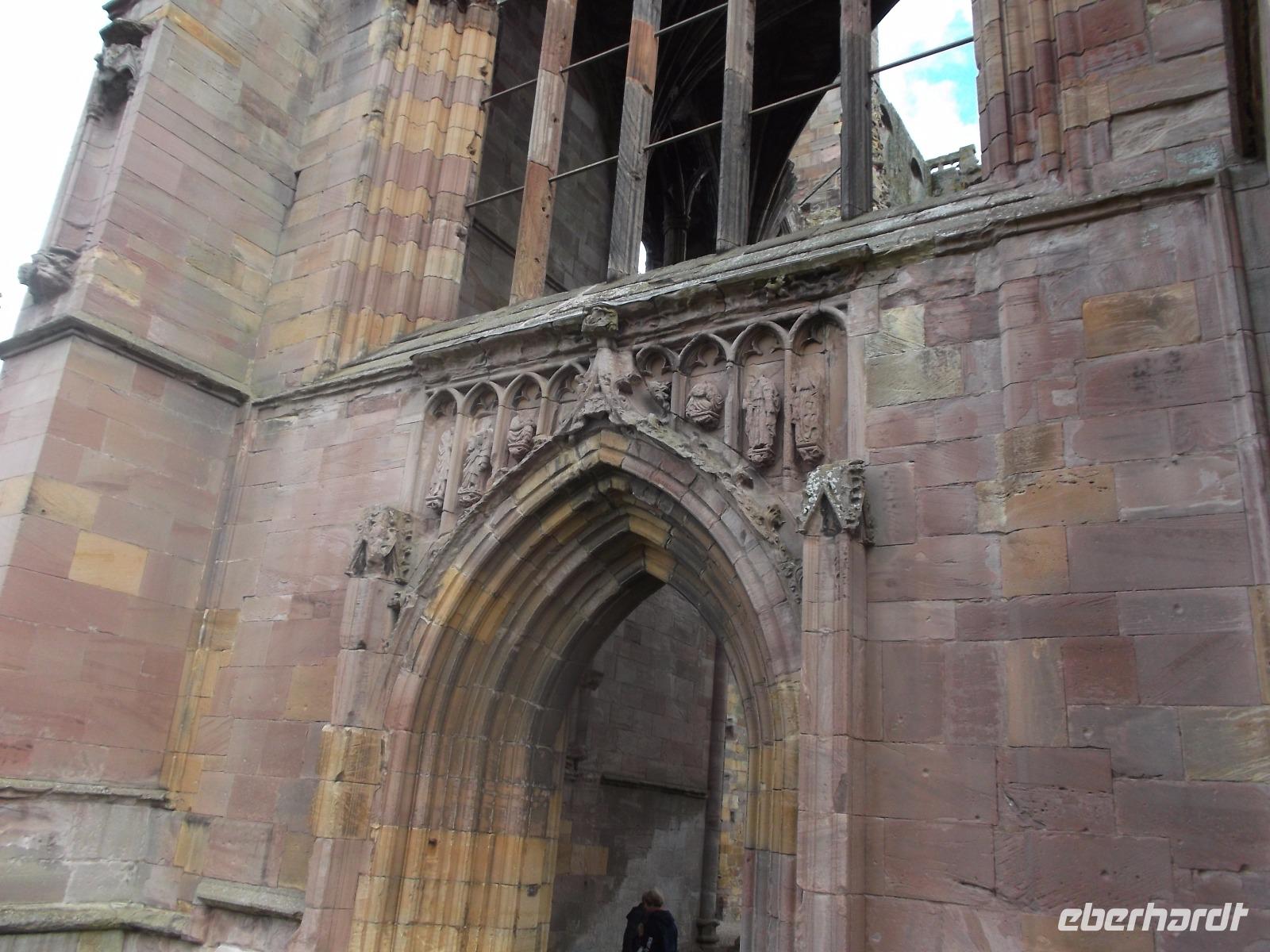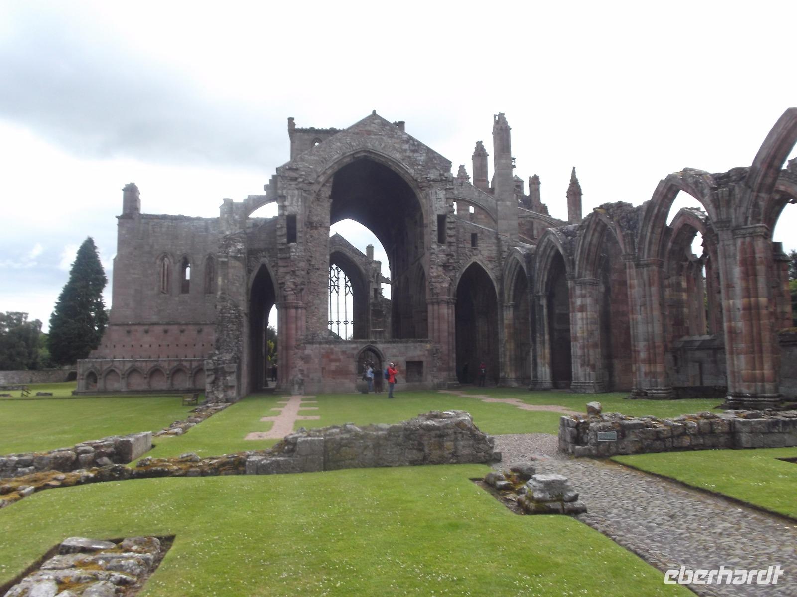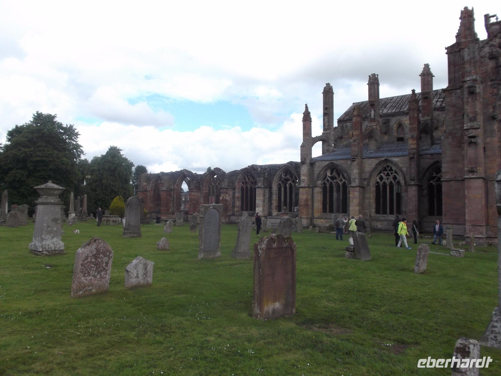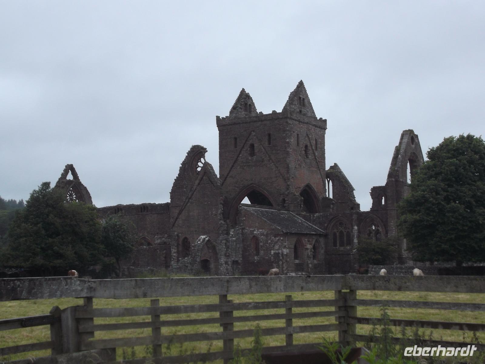 Der letzte Schottland-Tag dieser Reise war angebrochen! Heute hieß es Abschied nehmen, denn unser Tagesziel war die DFDS-Fähre im Hafen von Newcastle. Unser Weg führte durch die Hügellandschaft der „Borders", wie der breite Grenzstreifen zwischen Schottland und England seit Jahrhunderten genannt wird. Gleichzeitig ist die Gegend eine historische Kulturlandschaft, deren Besonderheiten unter anderem mehrere alte Abteien aus dem 12. Und 13. Jh. bilden. Die überaus malerische Ruinen sind recht gut erhalten und finden in der Literatur mehrfach Erwähnung, beispielsweise in den Werken des bekannten schottischen Schriftstellers Sir Walther Scott aber auch im Büchlein „Jenseit des Tweed" des von dieser Gegend begeisterten deutschen Dichters Theodor Fontane. Besonders Melrose Abbey, bei der Theodor Fontane empfahl, sie „im Mondenschein" zu besuchen, hatte es dem Romancier angetan. Das teilweise gut erhaltene Maßwerk und der noch gut erkennbare Gesamtaufbau der roten Sandstein-Ruine und einige Besonderheiten wie die Figur eines Dudelsack spielenden Schweines an der Dachtraufe lassen den Besuch der Abtei Melrose zu einem Erlebnis werden.