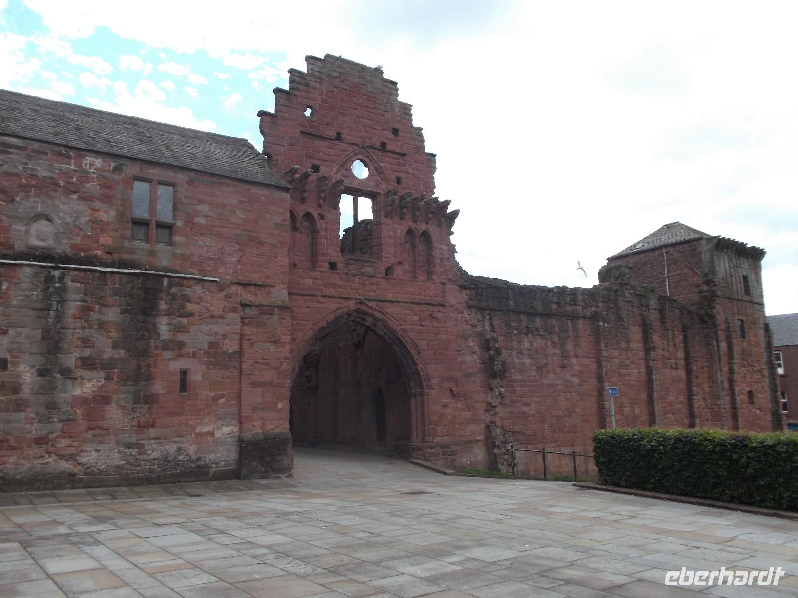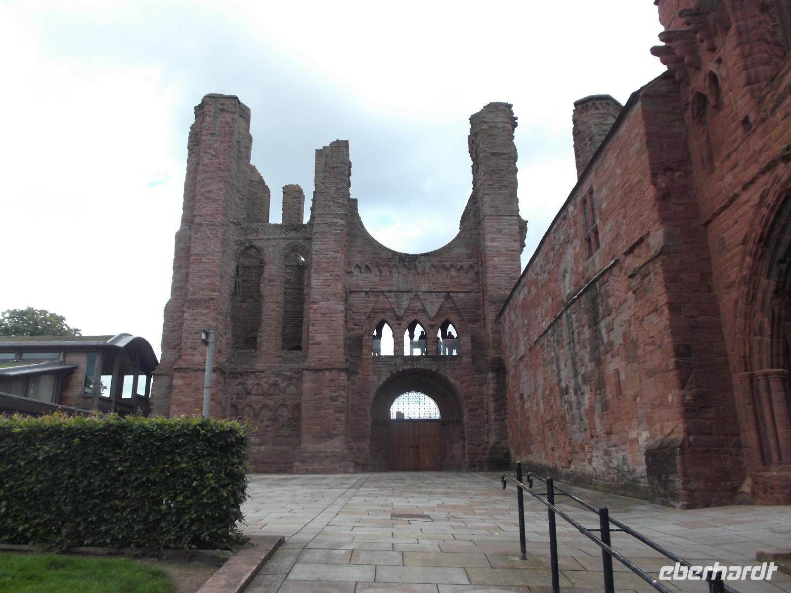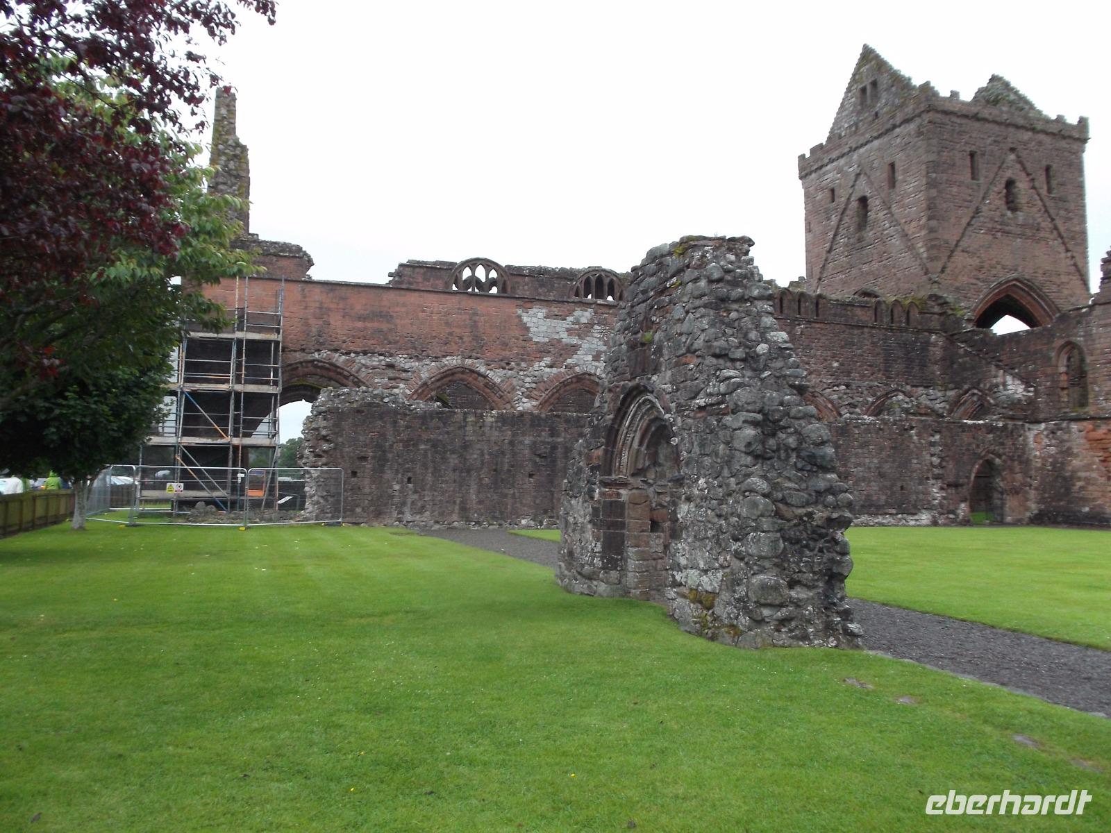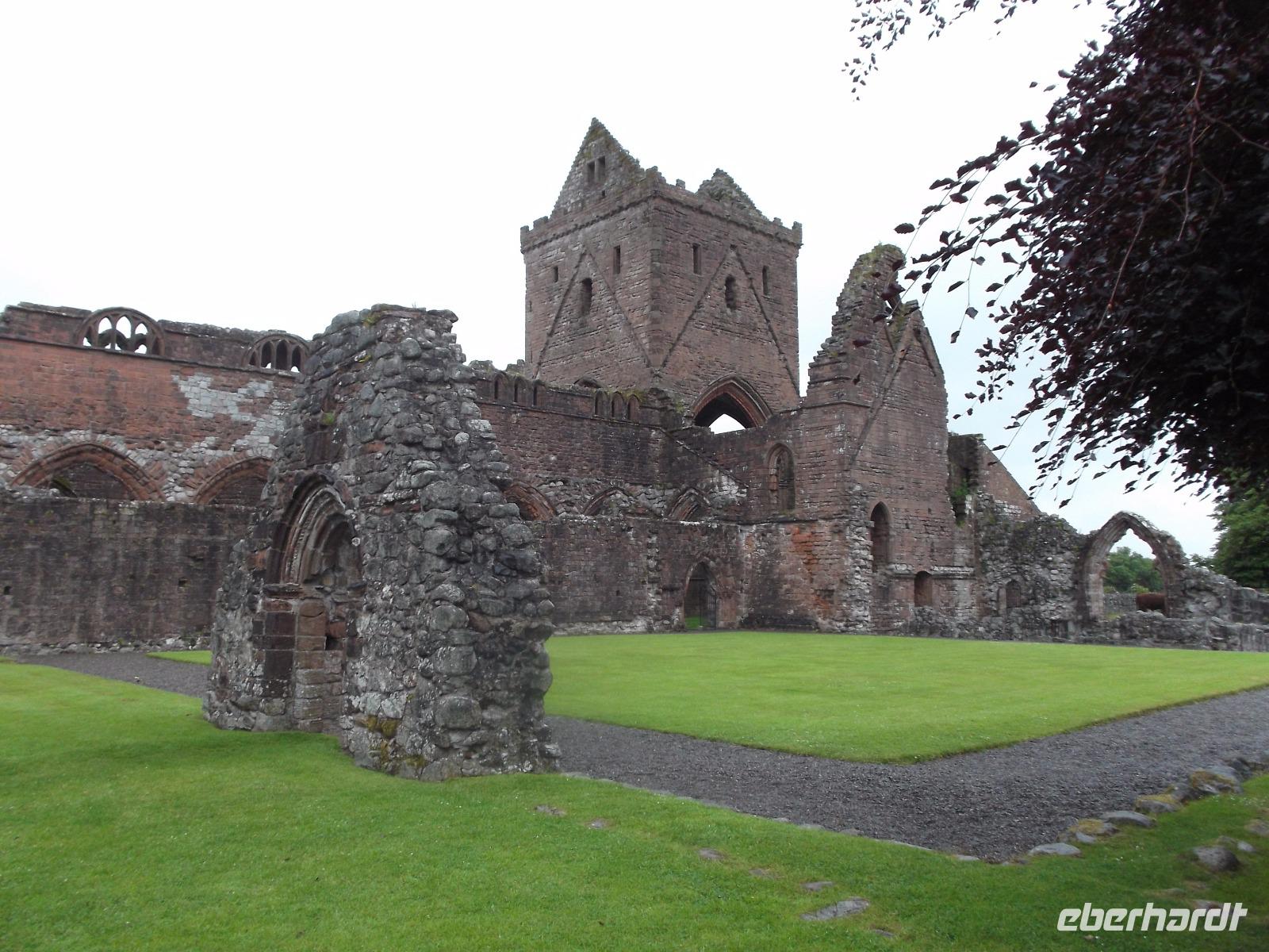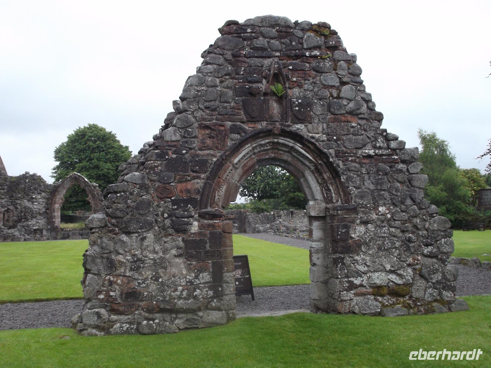 Nach einem Stopp an diesem traditionsträchtien Ort waren wir schon auf dem Weg zum Tagesziel Dumfries, konnten aber noch ein „Richtig Reisen"-Extra einbauen: im kleinen Ort New Abby, kurz hinter Dumfries abseits von den befahrenen Touristenrouten, finden sich die beeindruckenden Ruinen der Sweetheart Abbey. Ein Fotostopp zeigte uns die fotogenen Reste der alten Zisterzienserabtei aus dem 13. Jh., die ihren seltsamen Namen der Tatsache verdankt, dass eine lokale Adelige das Kloster als Grablege für das einbalsamierte Herz ihres geliebten Ehemannes gestiftet hatte.
