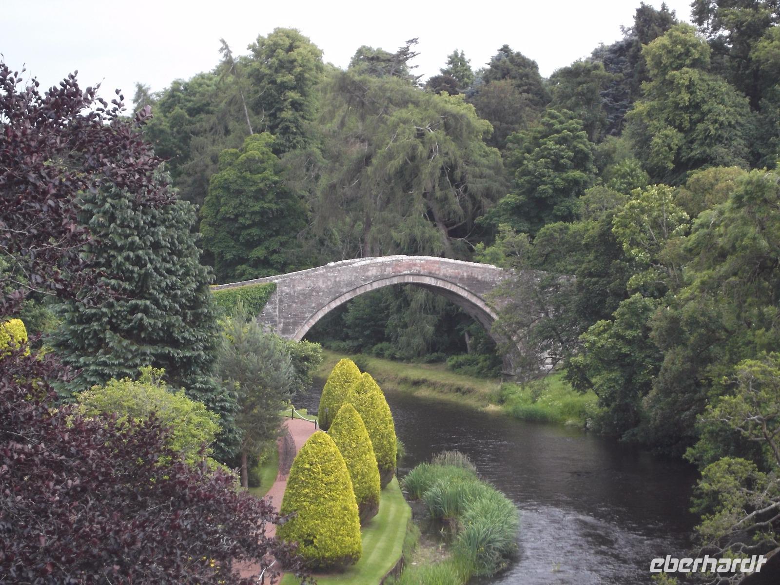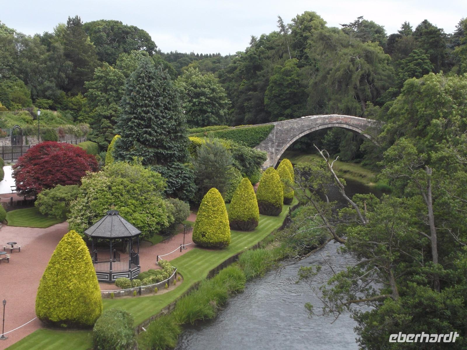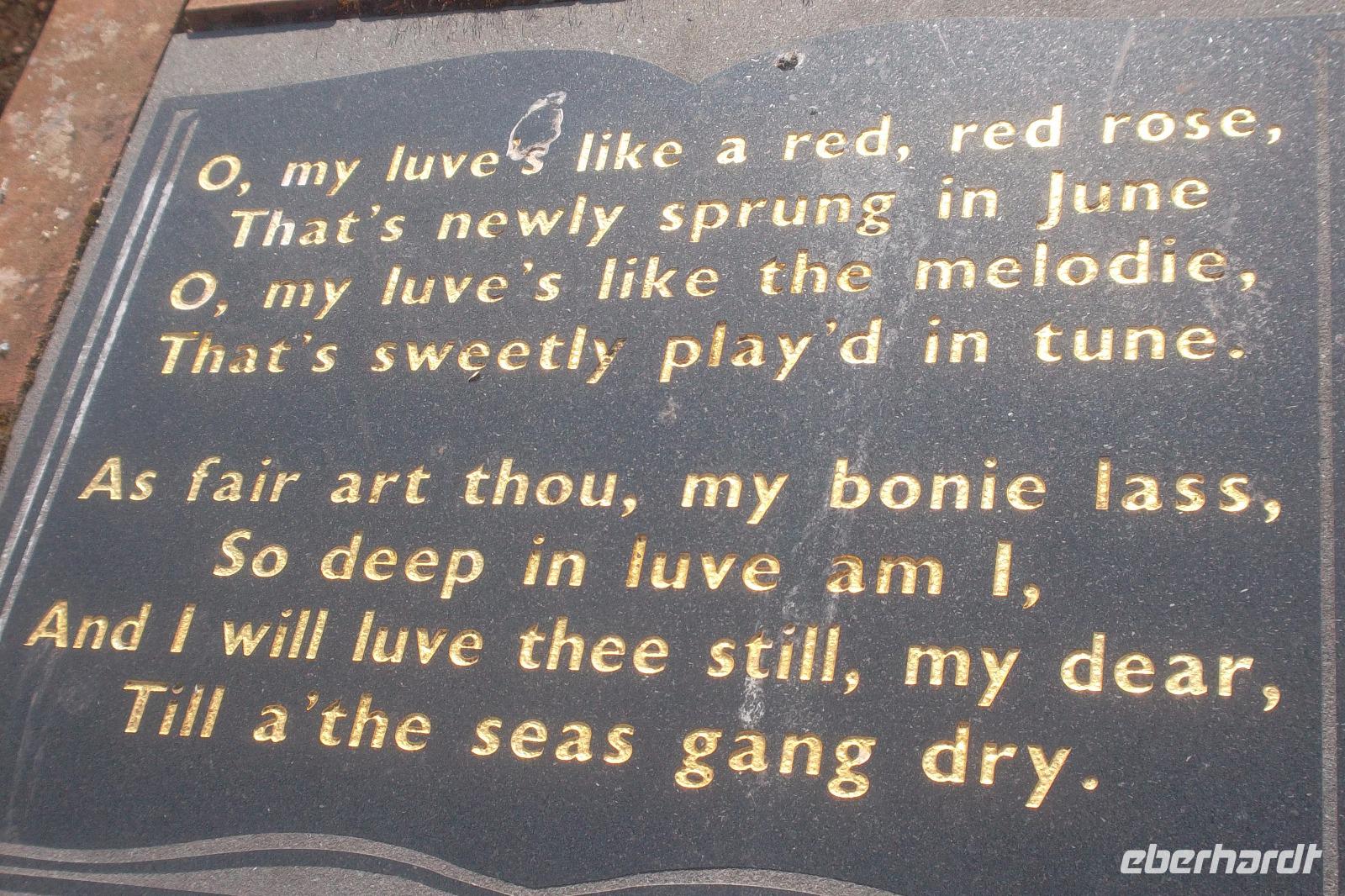 Von „Burns Cottage" führt der hübsch gestaltete „Poetenweg" mit Darstellungen seines berühmtesten Werkes zum großen Burns-Zentrum, in dem man viel Wissenswertes über den Dichter und die Besonderheiten seiner Werke erfahren kann. Das vermutlich weit über die Landesgrenzen bekannteste und vertonte Gedicht aus seiner Feder ist „Auld lang syne", das weltweit als DAS Abschiedslied schlechthin gilt. In Schottland selbst wird der Dichter aber vor allem für sein augenzwinkernd-ironisches dramatisches Versepos „Tam O' Shanter" verehrt. Dessen Handlung spielt sich in der unmittelbarem Umgebung seines Geburtshauses ab, und wer will, kann sich alle Schauplätze des „Dramas" innerhalb weniger Minuten anschauen. Ein Blick auf die alte Kirchenruine, des Flusstal und die historische Bogenbrücke „Brig o Doon" versetzen den Betrachter gut in die Handlung des Poems hinein.