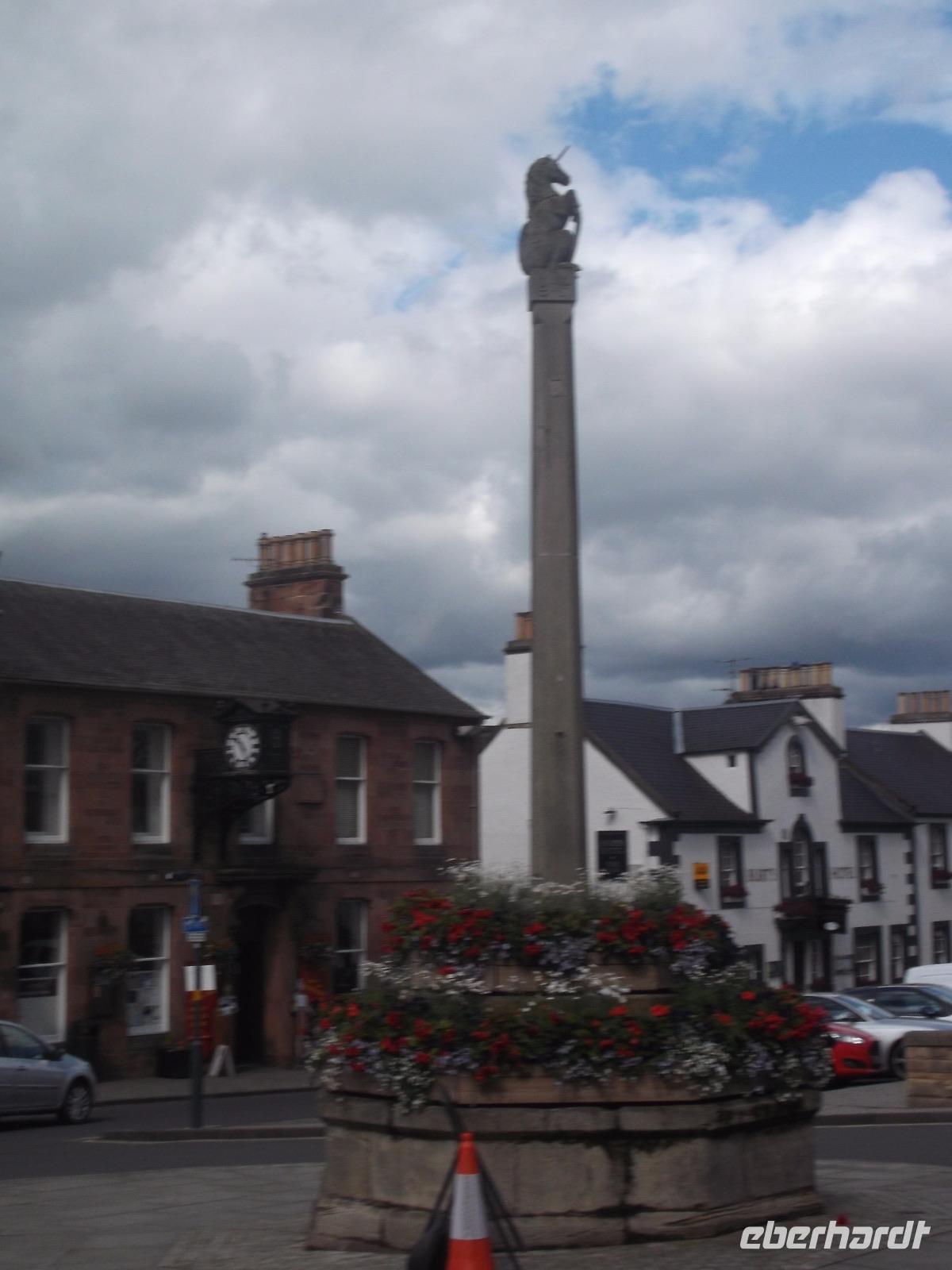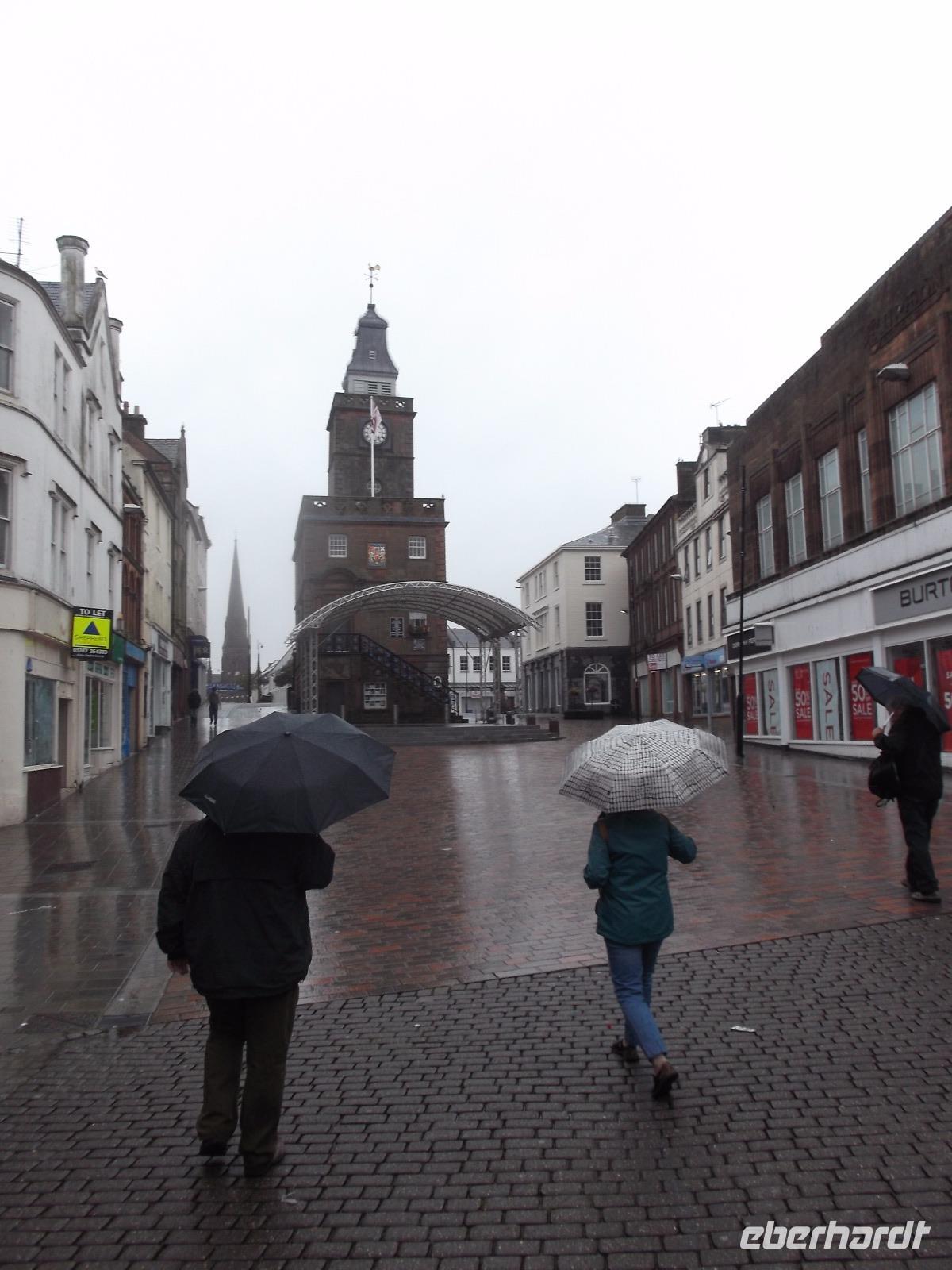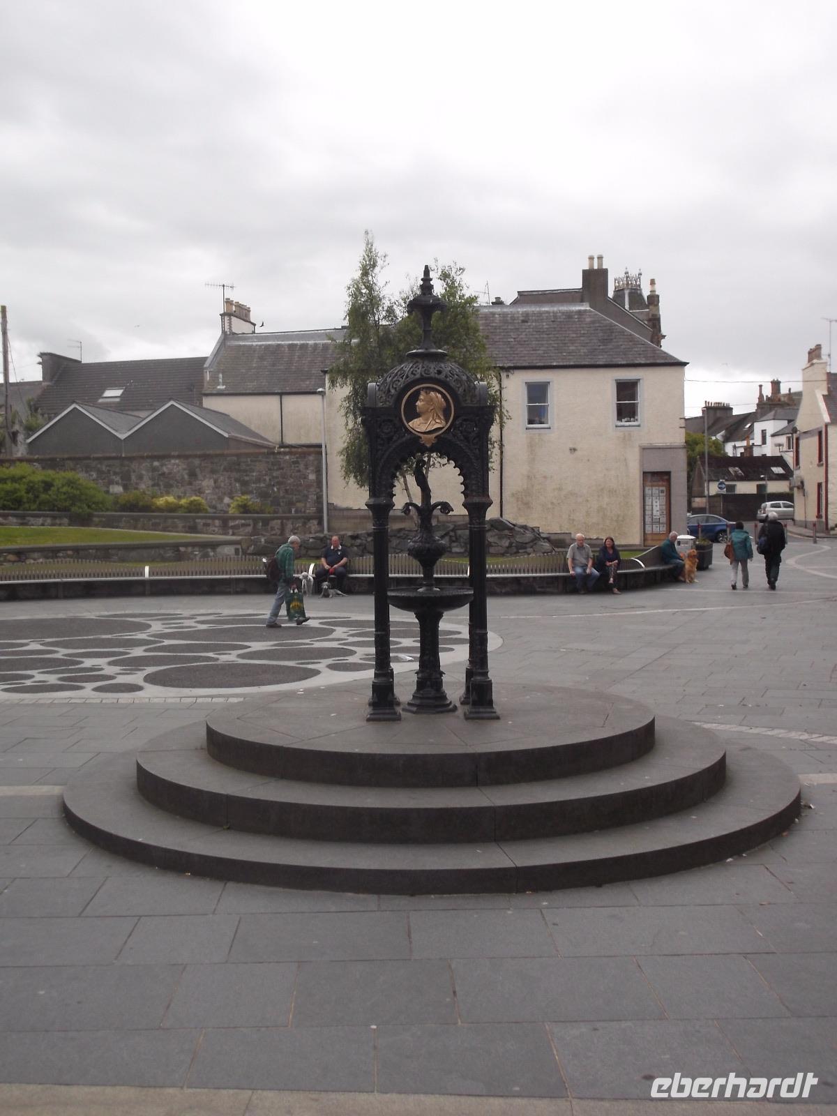 Dann fuhren wir nach Dumfries, dem Hauptort der Grafschaft Dumfries und Galloway. Recht malerisch am Flüsschen Nith gelegen, ist er vor allem als Wohn- und Sterbeort des schottischen Nationaldichters Robert Burns bekannt. Auch wenn das regnerische Wetter nicht gerade für Spaziergänge geeignet schien, drehten wir eine kleine „Runde" im Städtchen und besuchten den Friedhof mit dem Burns-Mausoleum, kamen an seinem Wohn- und Sterbehaus vorbei und durchquerten die Innenstadt vorbei an verschiedenen historischen Sehenswürdigkeiten - worunter sich übrigens auch die bevorzugten Pubs des Nationaldichters befanden - bis zu seinem Denkmal vor der Pfarrkirche.