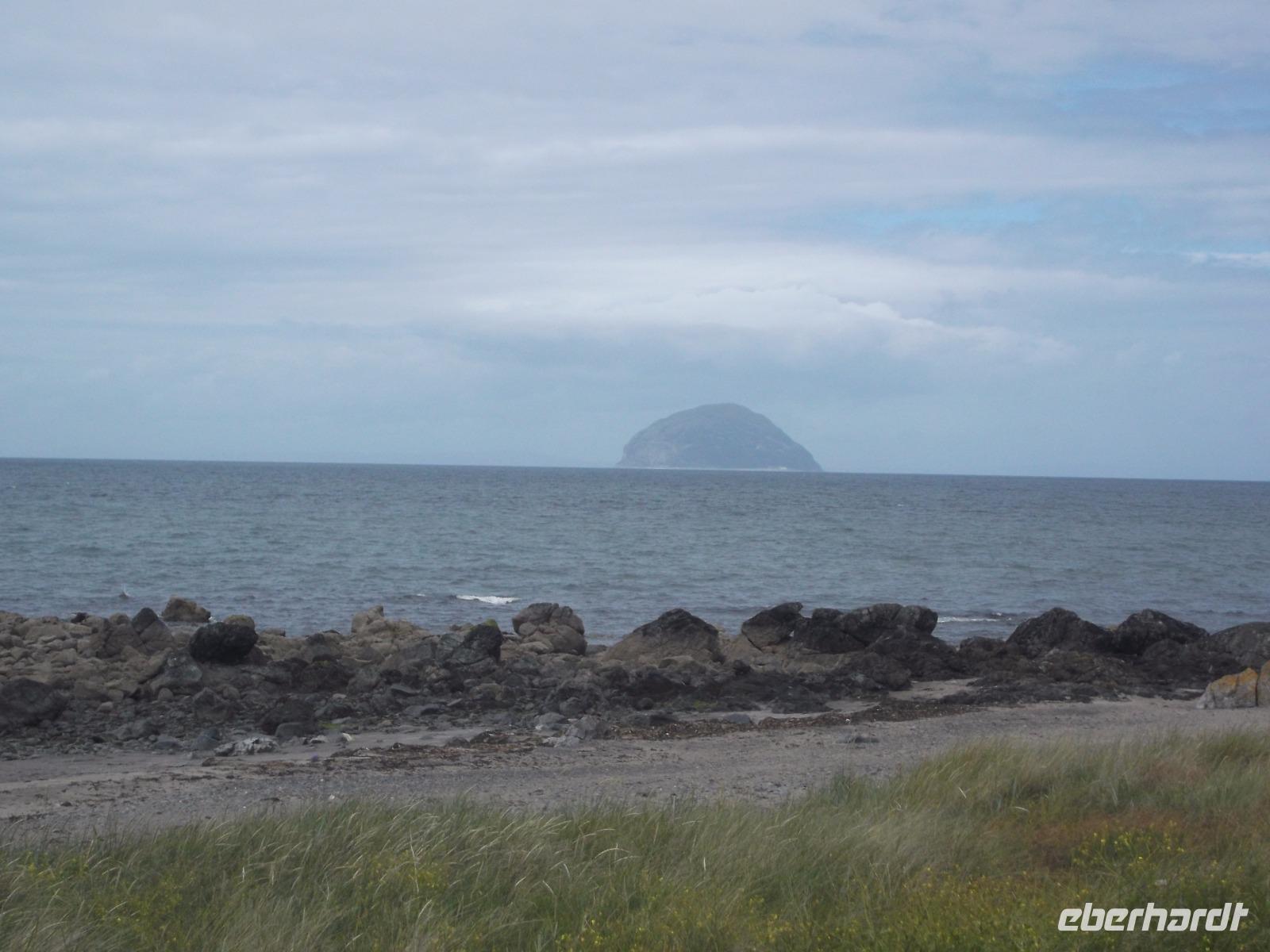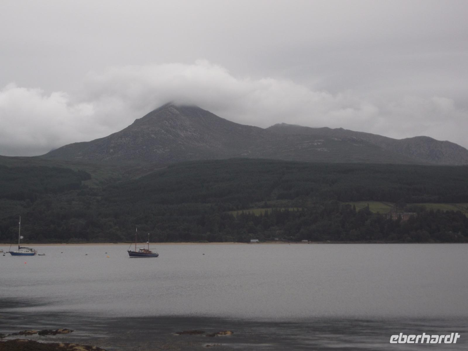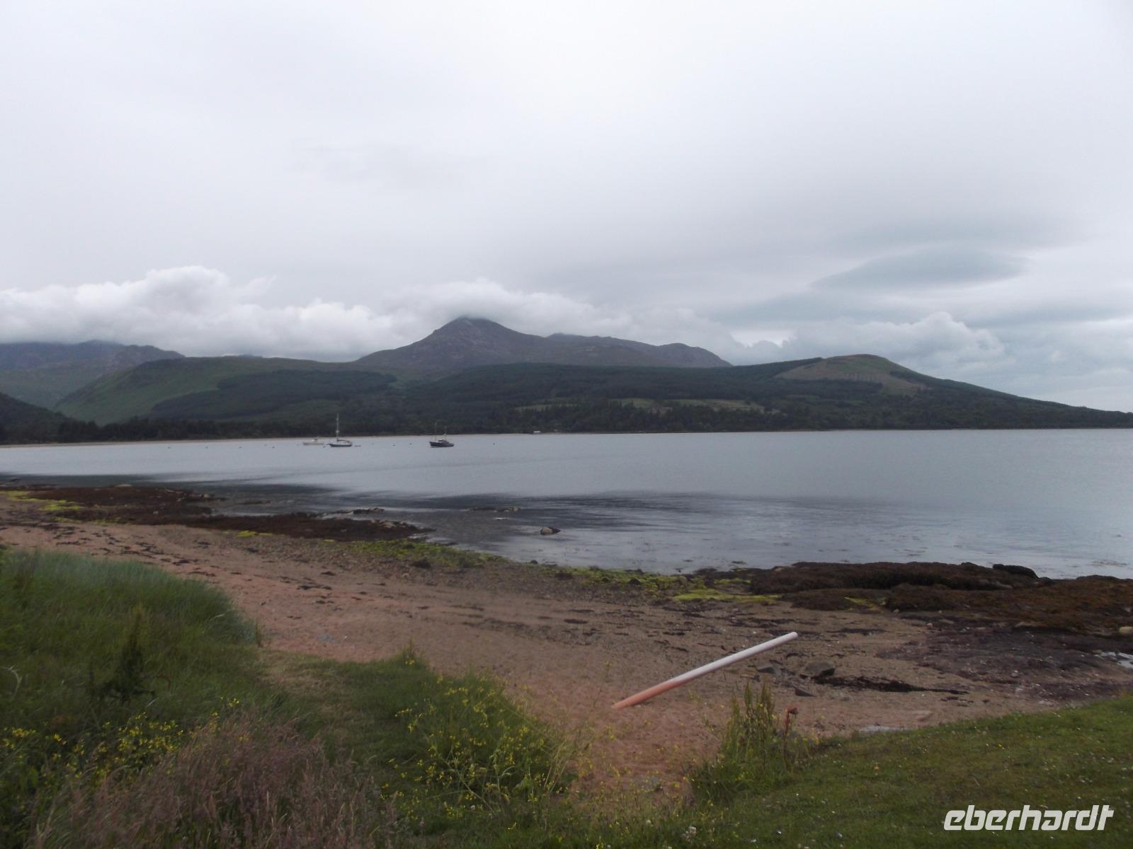 Tagesziel für heute war die Insel Arran. Sie liegt ganz im Süden der Mündung des großen, durch Glasgow fließenden Flusses Clyde im Atlantik zwischen dem schottischen Hauptland und der riesigen Halbinsel Kintyre. Das über 400 km² große Eiland ist ungefähr so groß wie die Urlaubsinsel Usedom, wirkt aber mit ihrem fast 900 m hoch aufragenden Berg Goatfell recht gewaltig. Aufgrund der landschaftlichen Vielfalt wird die Insel manchmal auch „Mini-Schottland" genannt, denn man findet hier fast alle Landschaften, für die Schottland ansonsten bekannt ist. Zunächst fuhren wir in den Fähranleger des Hafenstädchens Ardrossan, von dem uns die Morgenfähre in den Hauptort von Arran, das Städtchen Brodick, brachte. Die Schiffe der größten schottischen Fährgesellschaft Caledonian McBrayne erreichen Arran nach etwa 50 Minuten Überfahrt. Wie vielfältig die Insel wirklich ist, konnten wir zunächst im Museum of Arran Life erfahren, das wir am Rand von Brodick nach wenigen Fahrminuten erreichten. In einem Bauerngehöft kann man sich mit Lebensweise und Traditionen der Insel bekannt machen. Der nächste Stopp ermöglichte uns zwei der drei bekanntesten Produkte von Arran zu erwerben: sehr leckeren Käse und besonders, hier hergestelltes Parfum. Für seinen Inselkäste mit seltenen Geschmacksrichtungen wie Whisky oder Rotweinist Arran bekannt. Auf dem Weiteren Weg entlang der Küstenstraße Richtung Norden erreichten wir die Gegend der Sandsteinfelsen zwischen den kleinen Dörfchen Corrie und Sannox. In der weit ins Land reichenden Felsbank aus überwiegend rotem Sandstein gab es einst einen riesigen Steinbruch, dessen Steine mit Booten zu vor der Küste ankernden Schiffen gebracht wurden. Zahlreicher Gebäude in Ayr, anderen Küstenorten und sogar Glasgow sind aus diesen Steinen errichtet.