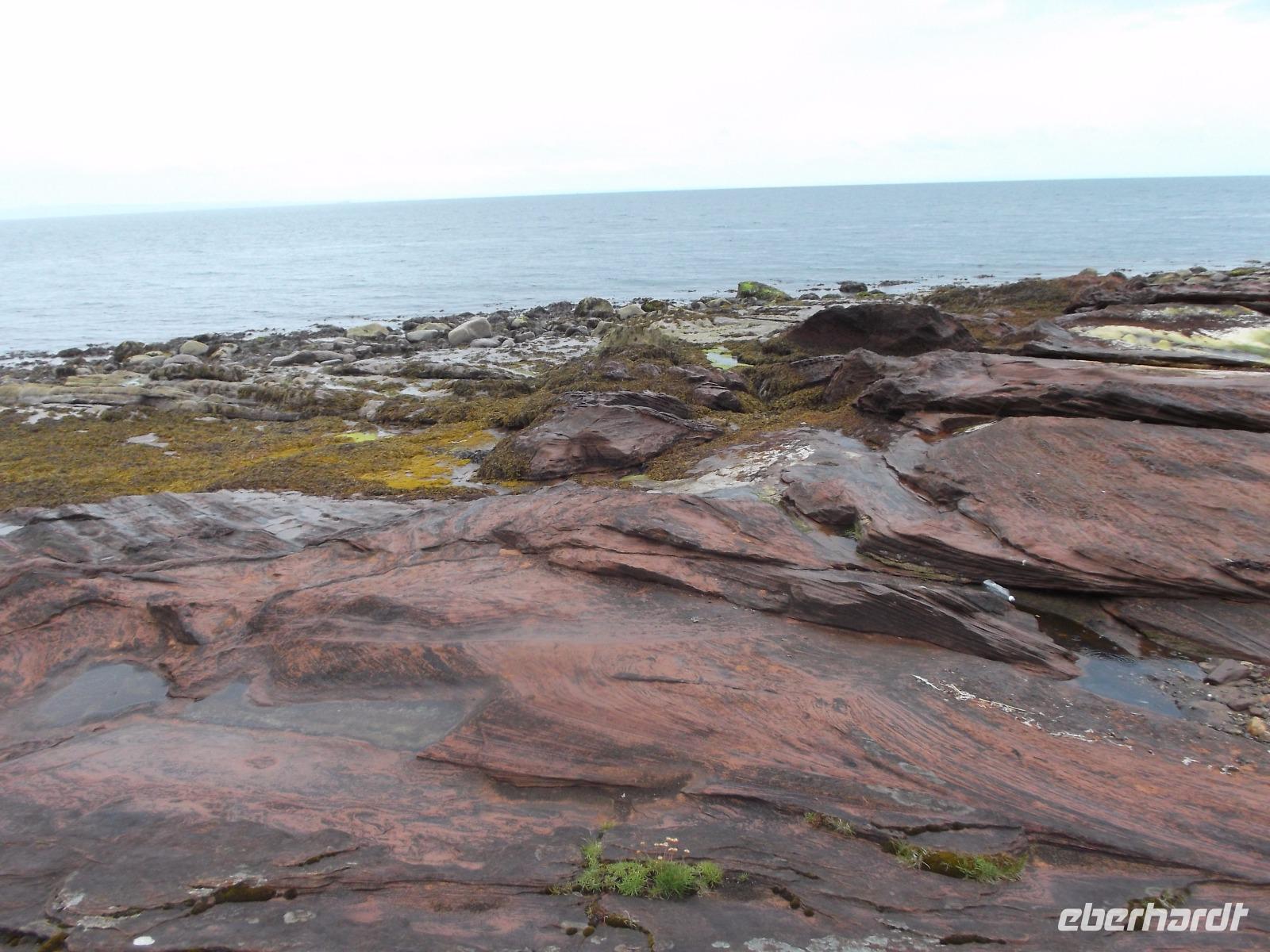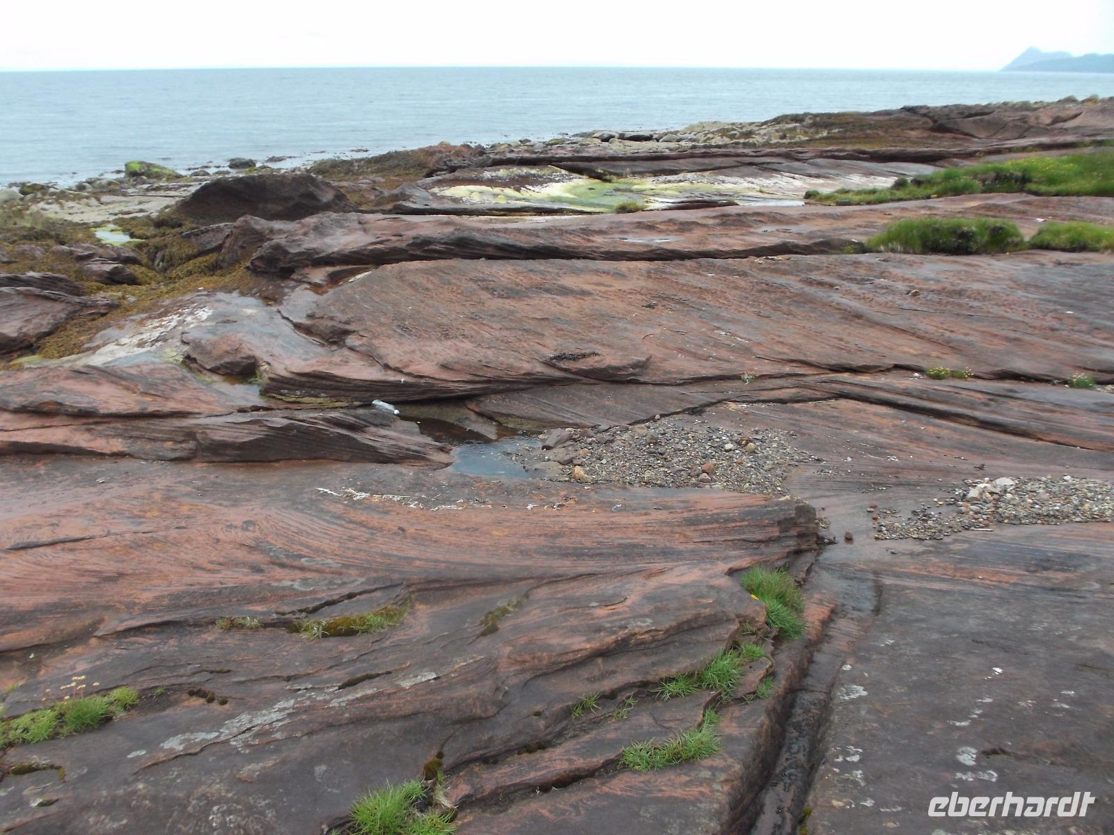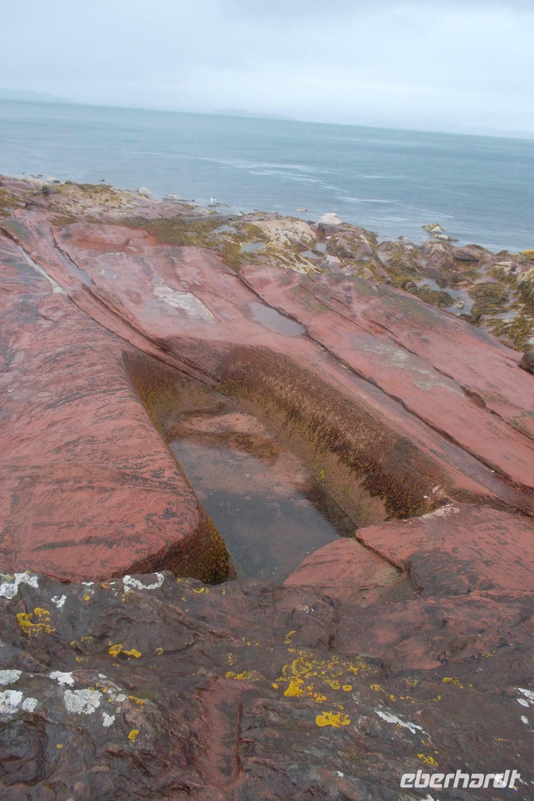 Tagesziel für heute war die Insel Arran. Sie liegt ganz im Süden der Mündung des großen, durch Glasgow fließenden Flusses Clyde im Atlantik zwischen dem schottischen Hauptland und der riesigen Halbinsel Kintyre. Das über 400 km² große Eiland ist ungefähr so groß wie die Urlaubsinsel Usedom, wirkt aber mit ihrem fast 900 m hoch aufragenden Berg Goatfell recht gewaltig. Aufgrund der landschaftlichen Vielfalt wird die Insel manchmal auch „Mini-Schottland" genannt, denn man findet hier fast alle Landschaften, für die Schottland ansonsten bekannt ist. Zunächst fuhren wir in den Fähranleger des Hafenstädchens Ardrossan, von dem uns die Morgenfähre in den Hauptort von Arran, das Städtchen Brodick, brachte. Die Schiffe der größten schottischen Fährgesellschaft Caledonian McBrayne erreichen Arran nach etwa 50 Minuten Überfahrt. Wie vielfältig die Insel wirklich ist, konnten wir zunächst im Museum of Arran Life erfahren, das wir am Rand von Brodick nach wenigen Fahrminuten erreichten. In einem Bauerngehöft kann man sich mit Lebensweise und Traditionen der Insel bekannt machen. Der nächste Stopp ermöglichte uns zwei der drei bekanntesten Produkte von Arran zu erwerben: sehr leckeren Käse und besonders, hier hergestelltes Parfum. Für seinen Inselkäste mit seltenen Geschmacksrichtungen wie Whisky oder Rotweinist Arran bekannt. Auf dem Weiteren Weg entlang der Küstenstraße Richtung Norden erreichten wir die Gegend der Sandsteinfelsen zwischen den kleinen Dörfchen Corrie und Sannox. In der weit ins Land reichenden Felsbank aus überwiegend rotem Sandstein gab es einst einen riesigen Steinbruch, dessen Steine mit Booten zu vor der Küste ankernden Schiffen gebracht wurden. Zahlreicher Gebäude in Ayr, anderen Küstenorten und sogar Glasgow sind aus diesen Steinen errichtet.