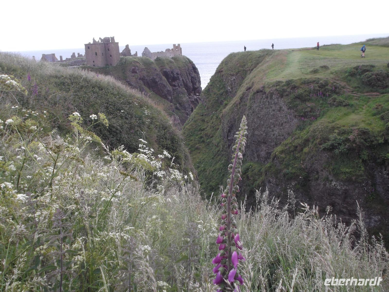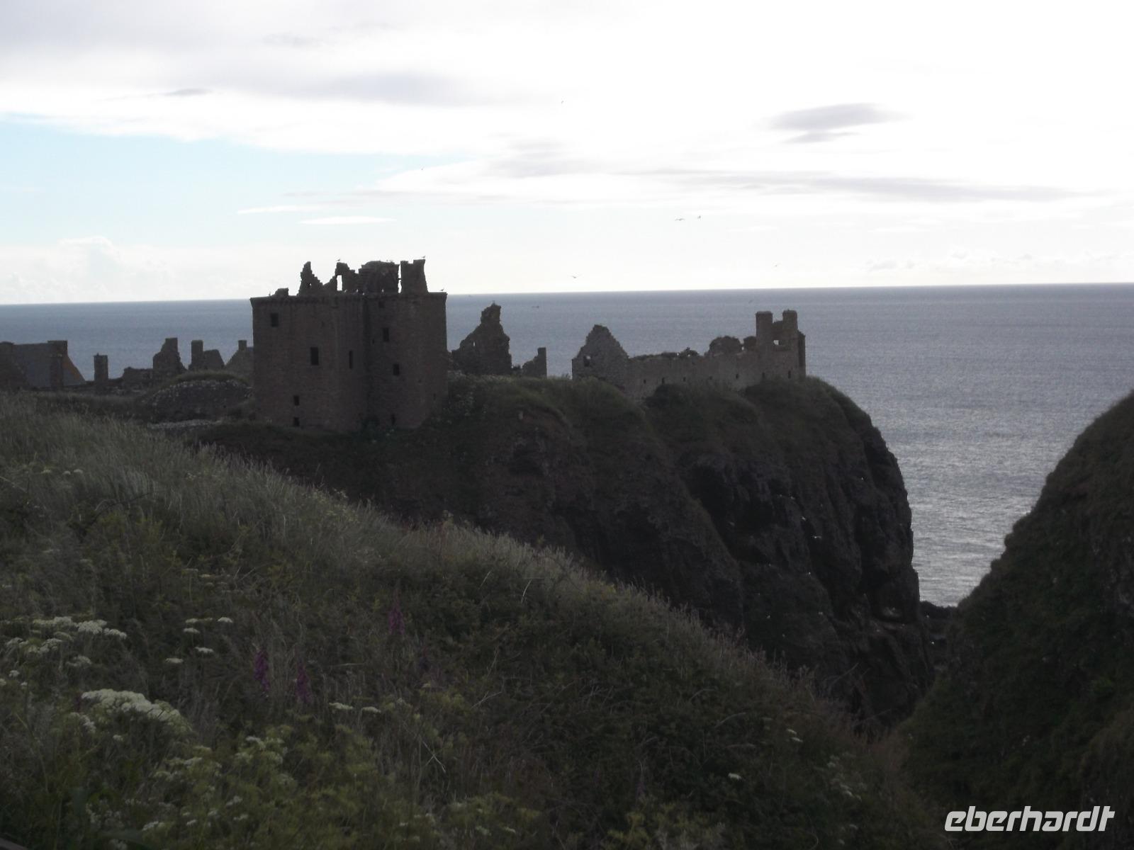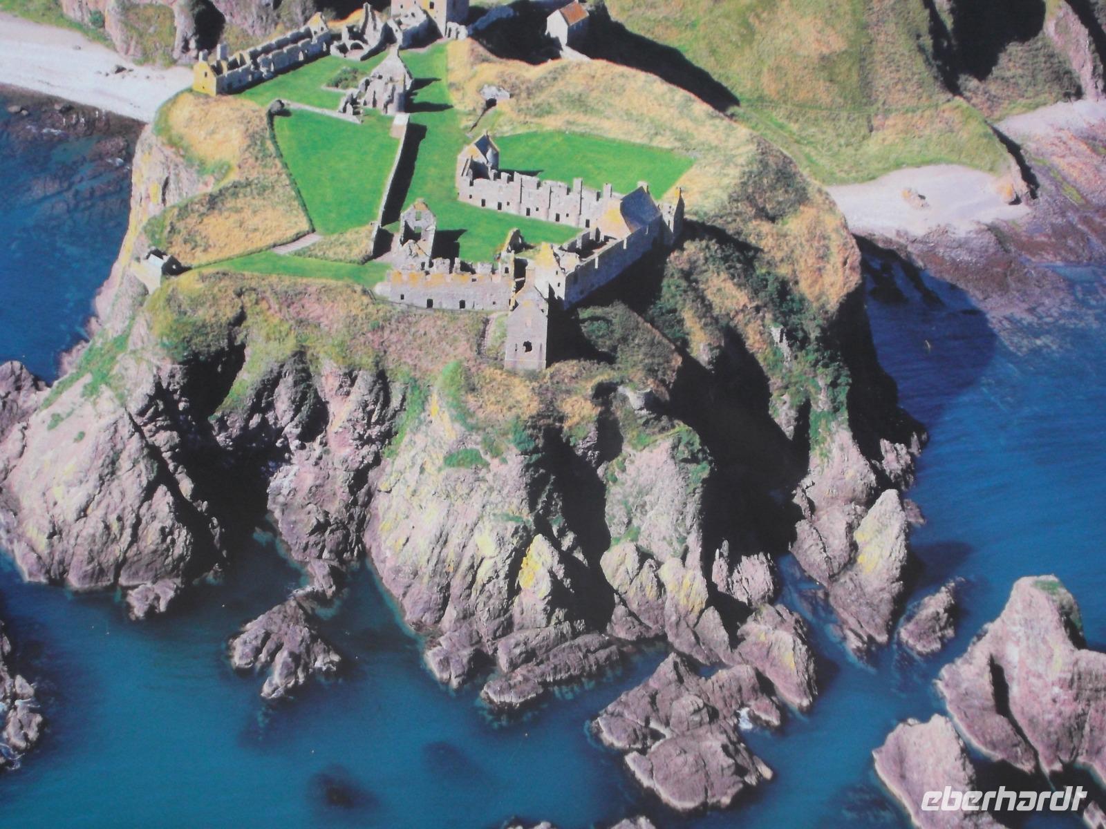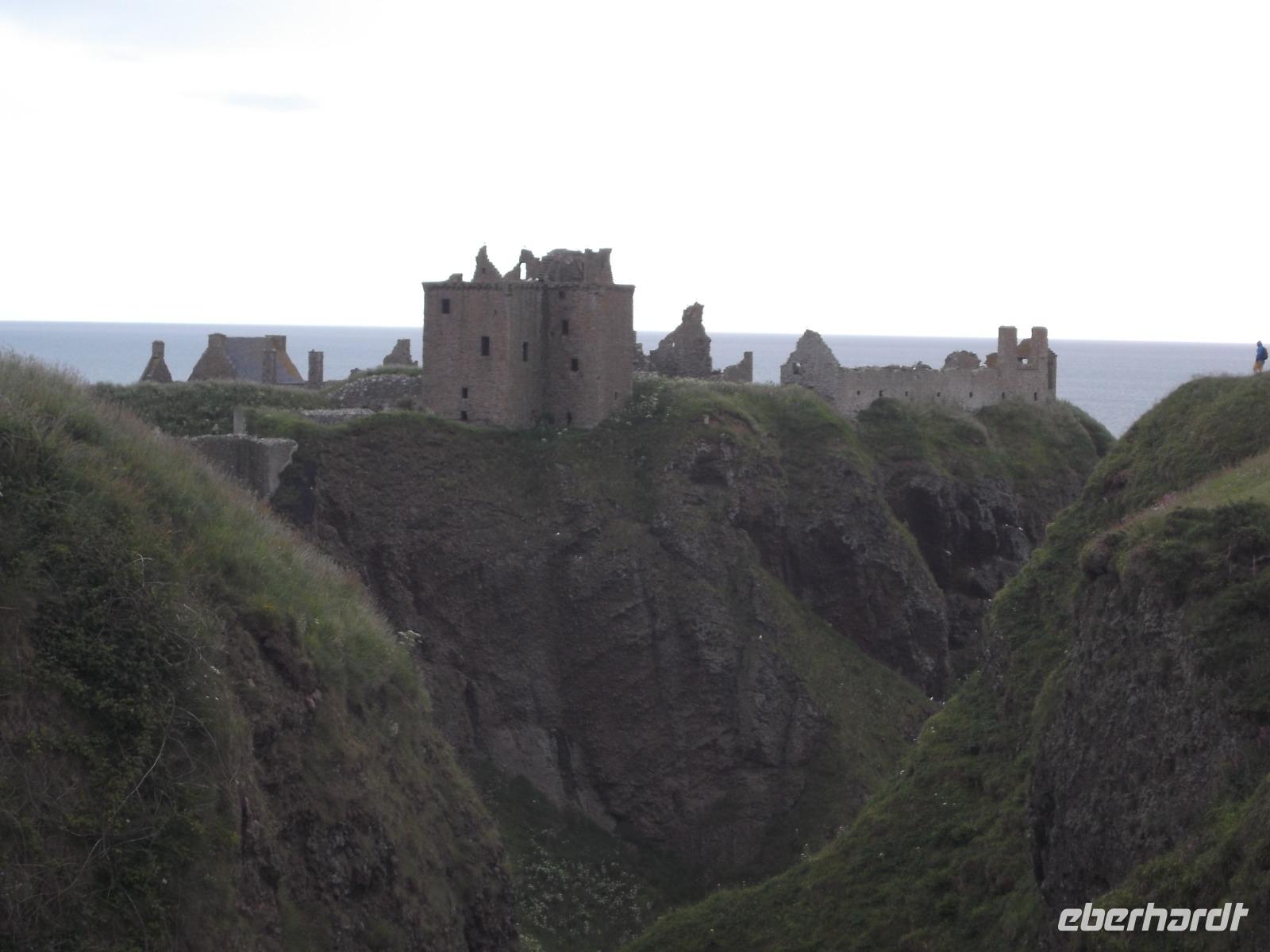 Nach dem pünktlichen Anlegen der Fähre im Hafen von Aberdeen hatten wir noch Zeit, unser Frühstück zu beenden und in Ruhe von Bord zu gehen. Unser Bus mit Chauffeur Arnold erwartete uns schon und wir fuhren südwärts, zur nächsten Etappe unserer interessanten Reise. Wir wählten die Küstenstraße, um ein paar Meilen südlich von Aberdeen zum Fotostopp am Dunnottar Castle zu halten. Die auf einer felsigen Landzunge stehenden Ruinen stellen den ausgedehntesten Gebäudekomplex einer Burg in Schottland dar und stammen aus verschiedenen Bauepochen seit dem 14. Jh. Eine Zeitlang diente die Burg sogar als Aufbewahrungsort der schottischen Kronjuwelen.
