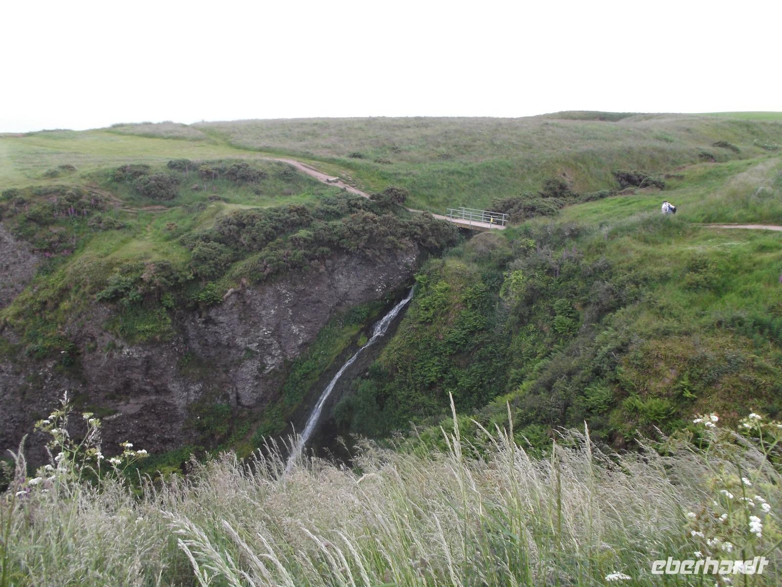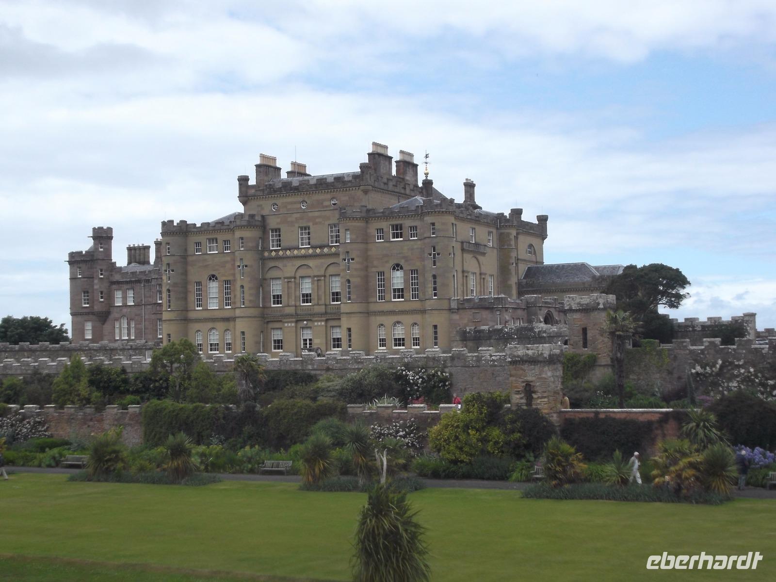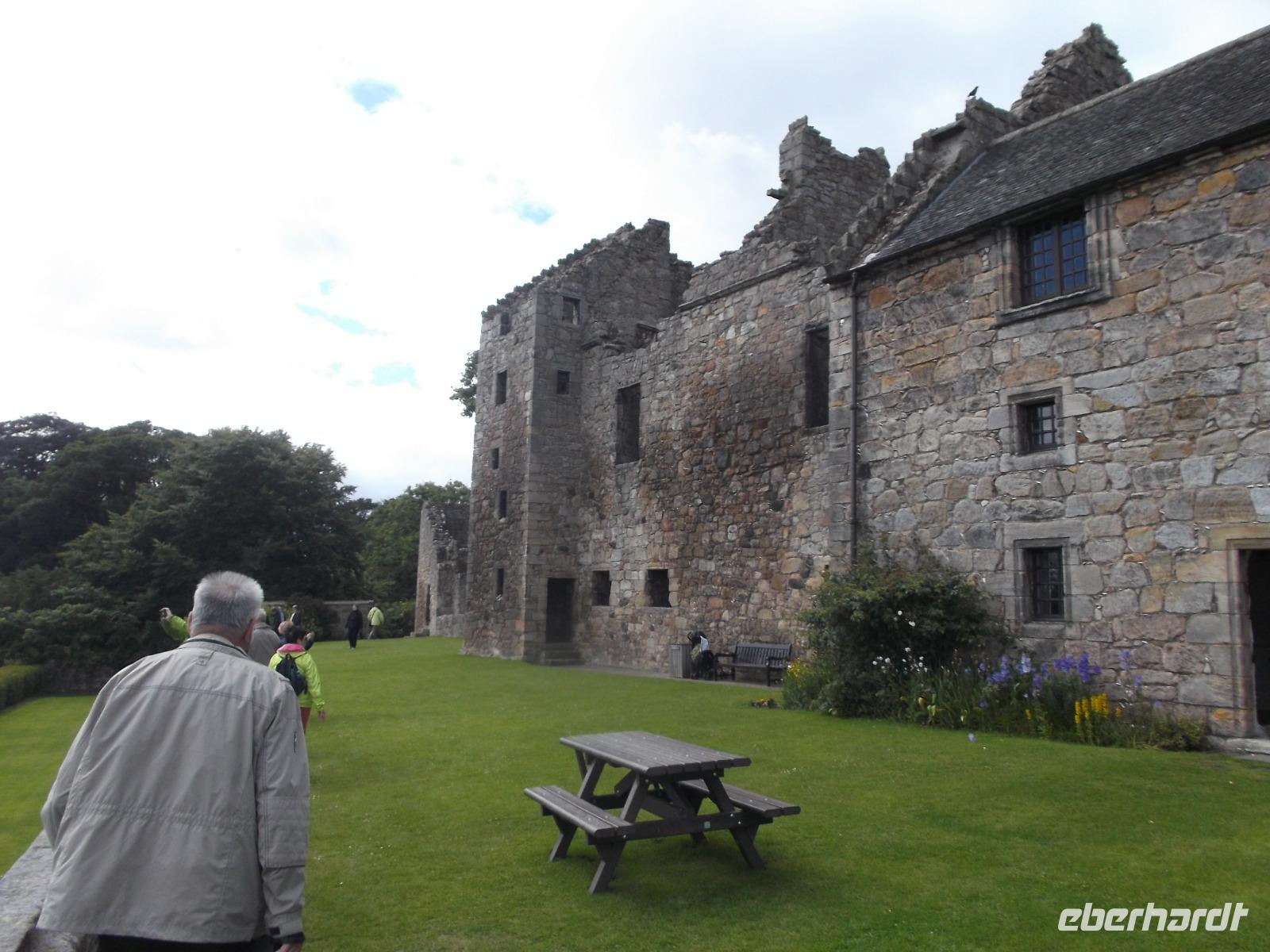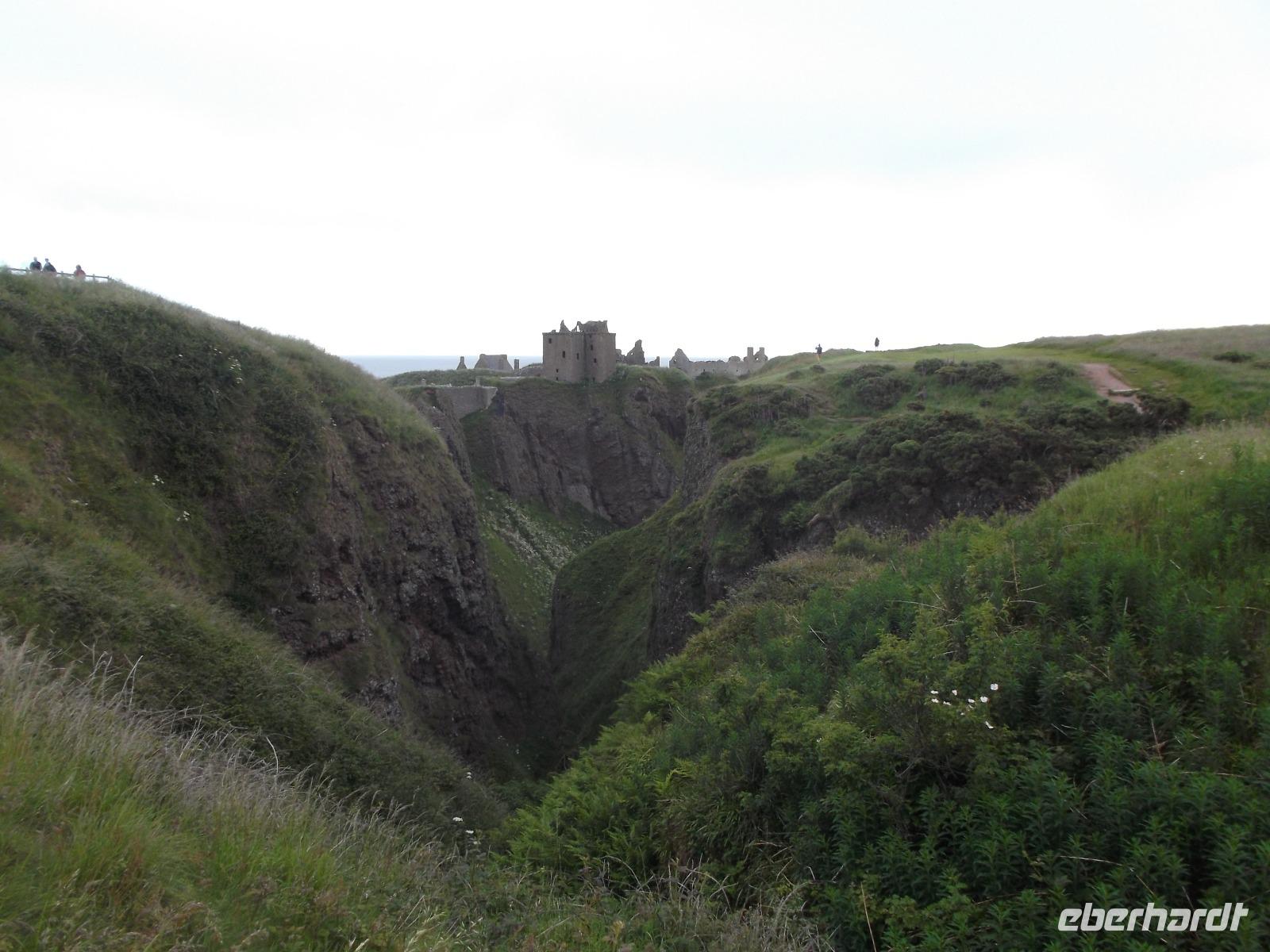 Nach dem pünktlichen Anlegen der Fähre im Hafen von Aberdeen hatten wir noch Zeit, unser Frühstück zu beenden und in Ruhe von Bord zu gehen. Unser Bus mit Chauffeur Arnold erwartete uns schon und wir fuhren südwärts, zur nächsten Etappe unserer interessanten Reise. Wir wählten die Küstenstraße, um ein paar Meilen südlich von Aberdeen zum Fotostopp am Dunnottar Castle zu halten. Die auf einer felsigen Landzunge stehenden Ruinen stellen den ausgedehntesten Gebäudekomplex einer Burg in Schottland dar und stammen aus verschiedenen Bauepochen seit dem 14. Jh. Eine Zeitlang diente die Burg sogar als Aufbewahrungsort der schottischen Kronjuwelen.