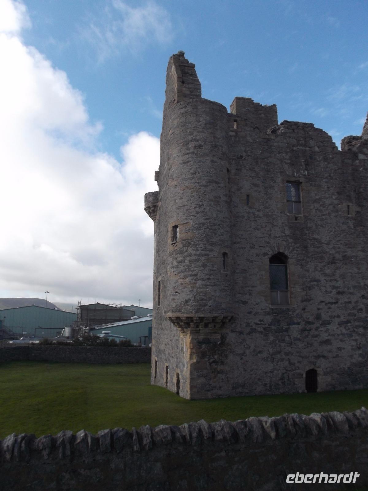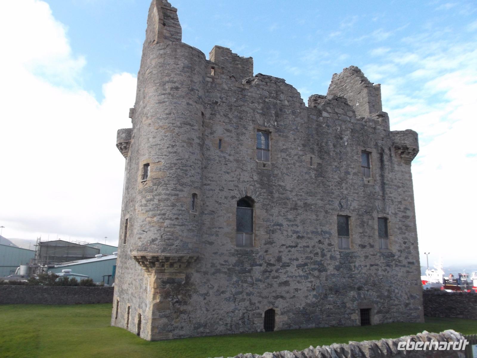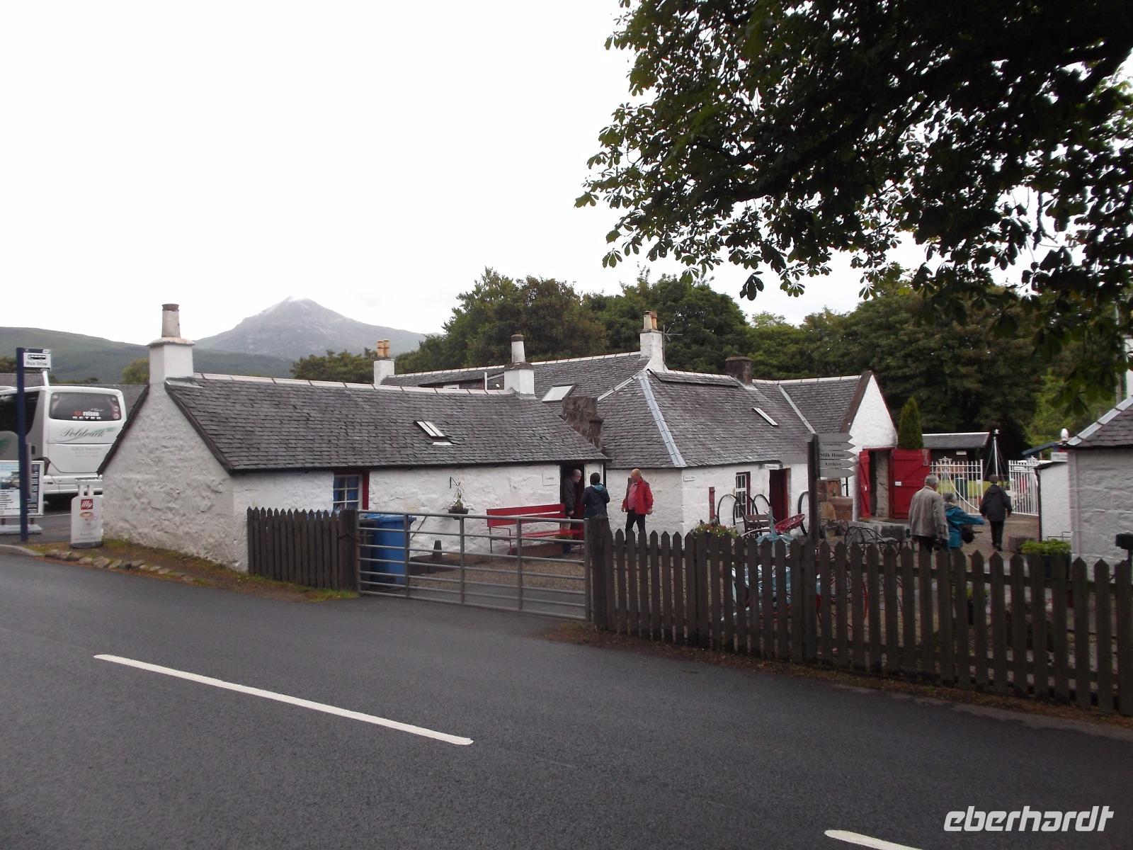 Bevor den nördlichsten Punkt der Insel, Lochranza erreichten, hielten wir noch an der erst seit Ende vorigen Jahrhunderts produzierenden Whisky-Destille an. Eigentlich wollten wir nur eine Einkaufsmöglichkeit für diese seltene Sorte des gälischen Lebenswassers schaffen, aber das freundliche Personal des Distillery-Besucherzentrums organisierte sofort eine kleine Verkostung für uns. Nahebai liegt das Fischerdorf Lochranza, dessen malerische Burgruine schon Sir Walter Scott in seiner Erzählung „Der Pirat" beschrieb. Die Hauptattraktion des ansonsten nur durch seine kleine Fähre zum „Festland" hervortretenden Ortes ist das Towerhaus „Lochranza Castle". Eine Zeitlang war die Burg im königlichen Besitz und wurde wohl als Jagdschloss genutzt.