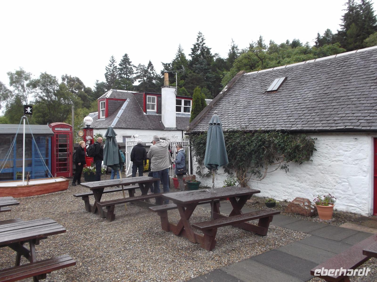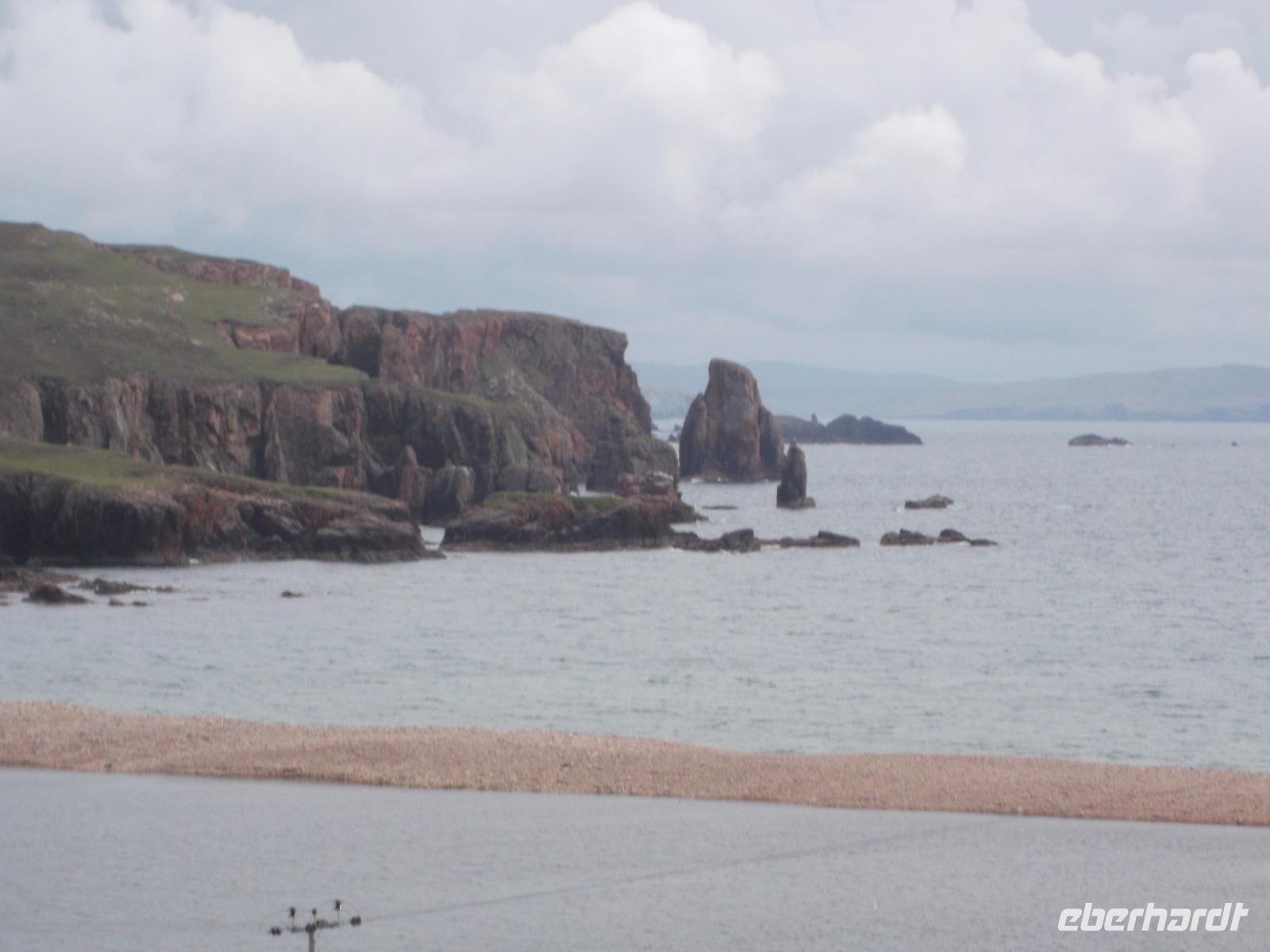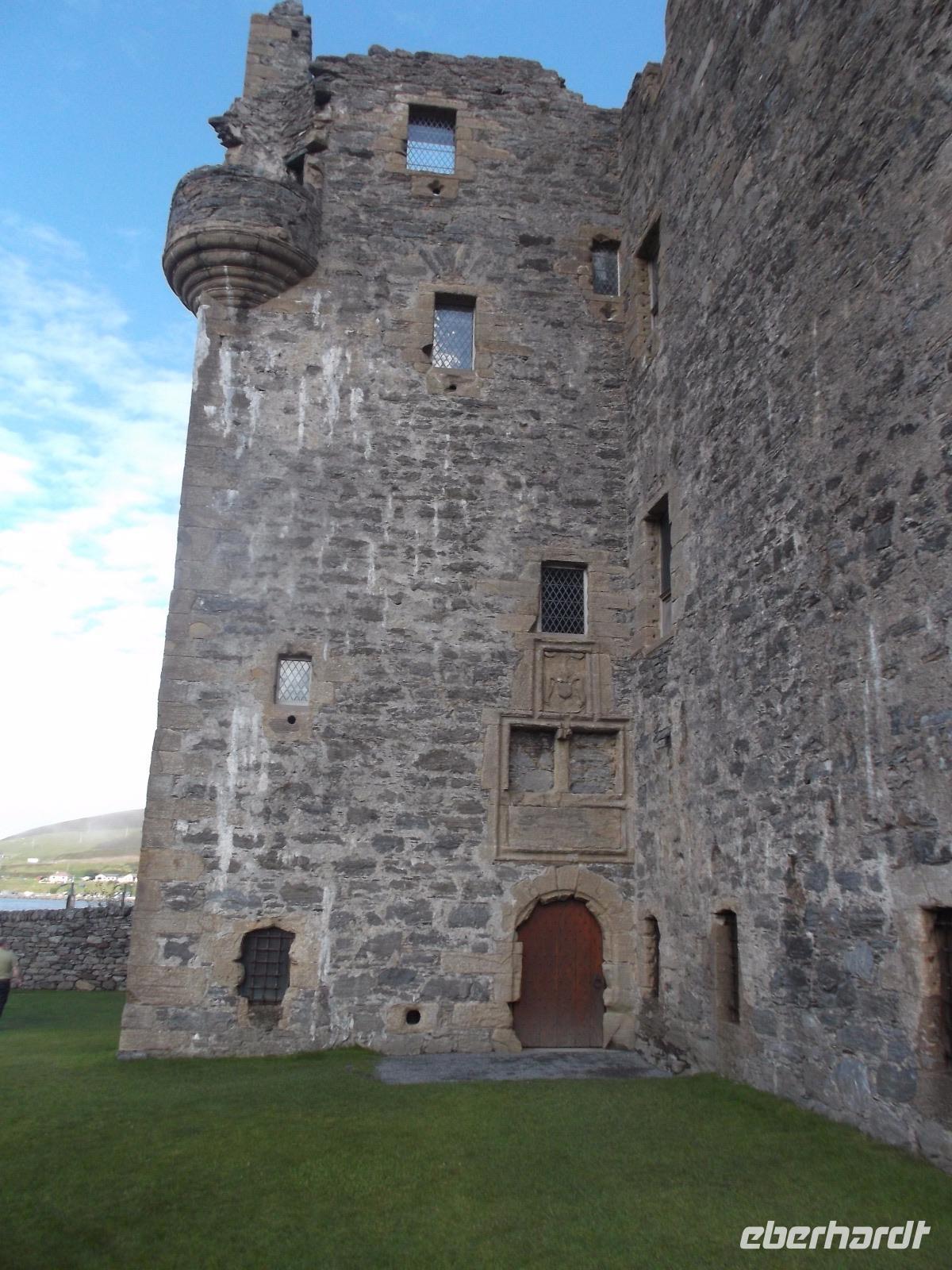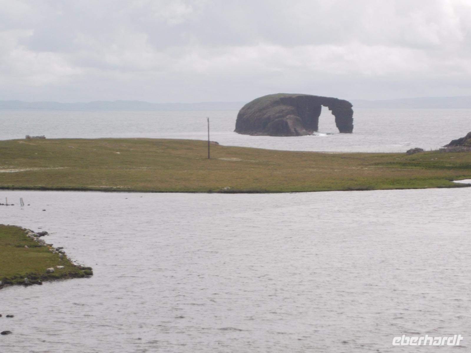 Bevor den nördlichsten Punkt der Insel, Lochranza erreichten, hielten wir noch an der erst seit Ende vorigen Jahrhunderts produzierenden Whisky-Destille an. Eigentlich wollten wir nur eine Einkaufsmöglichkeit für diese seltene Sorte des gälischen Lebenswassers schaffen, aber das freundliche Personal des Distillery-Besucherzentrums organisierte sofort eine kleine Verkostung für uns. Nahebai liegt das Fischerdorf Lochranza, dessen malerische Burgruine schon Sir Walter Scott in seiner Erzählung „Der Pirat" beschrieb. Die Hauptattraktion des ansonsten nur durch seine kleine Fähre zum „Festland" hervortretenden Ortes ist das Towerhaus „Lochranza Castle". Eine Zeitlang war die Burg im königlichen Besitz und wurde wohl als Jagdschloss genutzt.