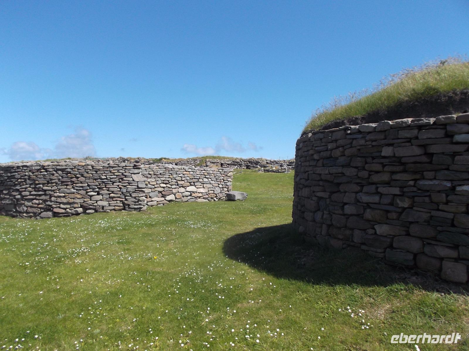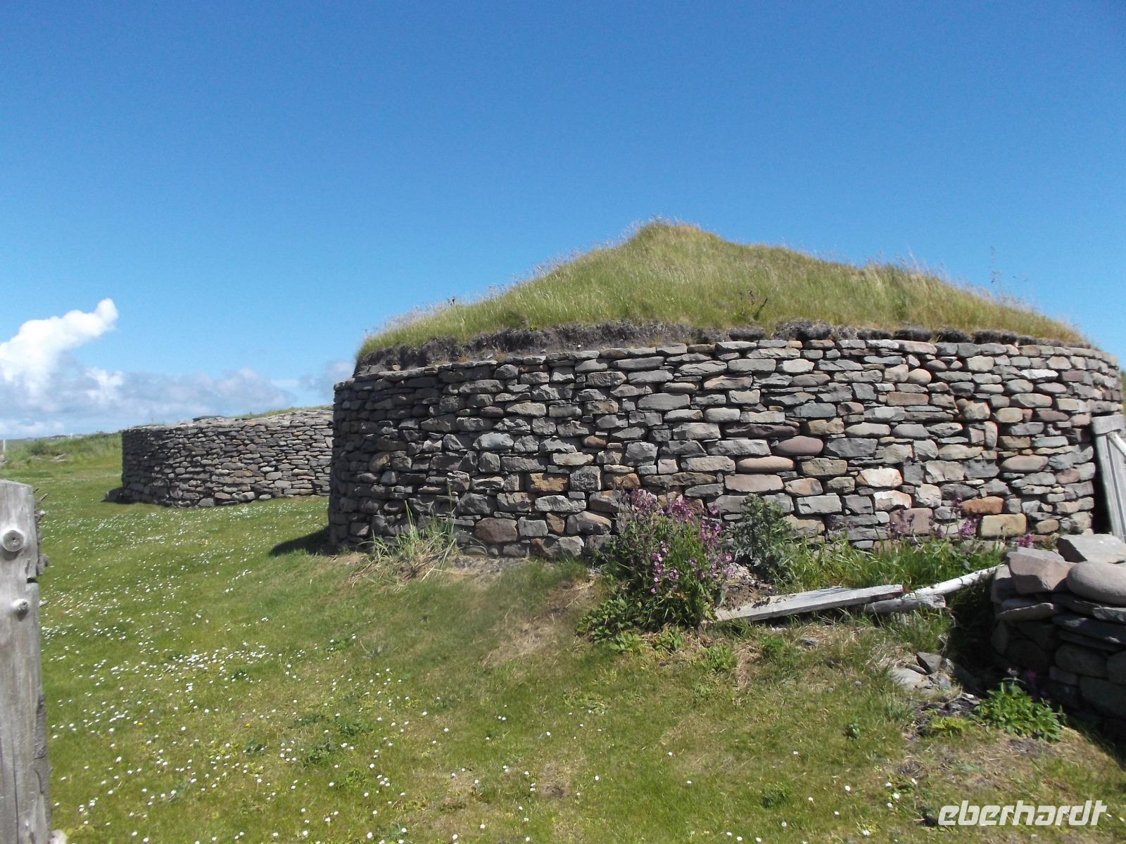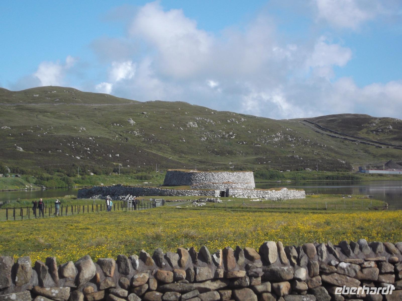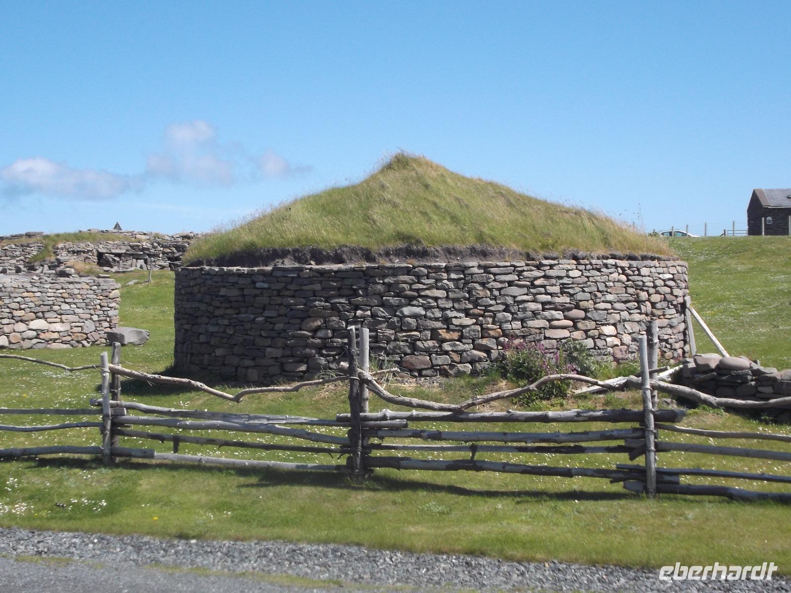 Als erstes besuchten wir einen der typischen eisenzeitlichen Wohntürme, die im Norden Schottlands, auf den Hebriden, den Orkneys und den Shetlands verbreitet sind. Broch nennt man die kegelstumpf-förmigen doppelwandigen Türme, die Schutz für ganze Sippen boten und seit der ausgehenden Bronzezeit, schon seit dem 7. Jh. v. Chr. errichtet wurden. Recht gut erhalten, wenn auch nur in seiner Grundanlage und nur etwa zwei Meter hoch, ist der Clickhimin-Broch. Wie die meisten der mehreren hundert in Schottland erhaltenen uralten Wohnbauten aus Trockenmauerwerk liegt er direkt am Meer - vermutlich dienten Felsbrocken von der Küste als Baumaterial.