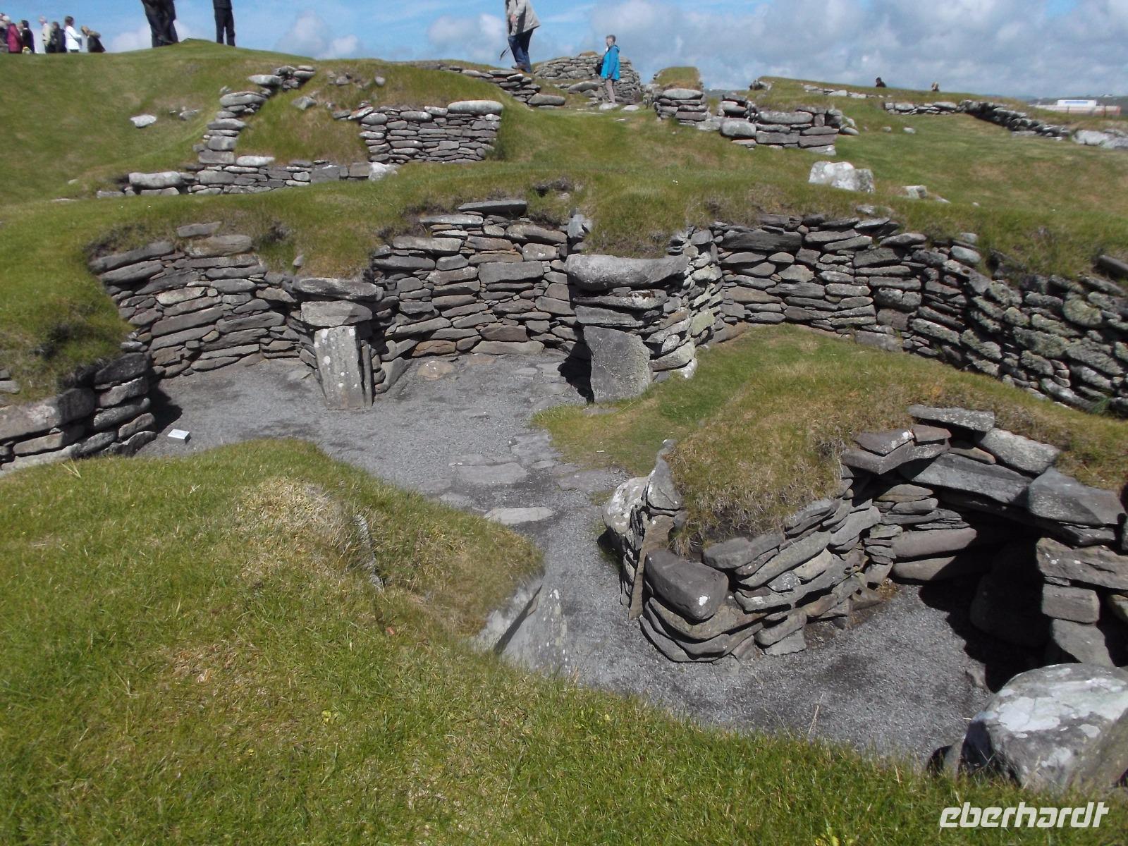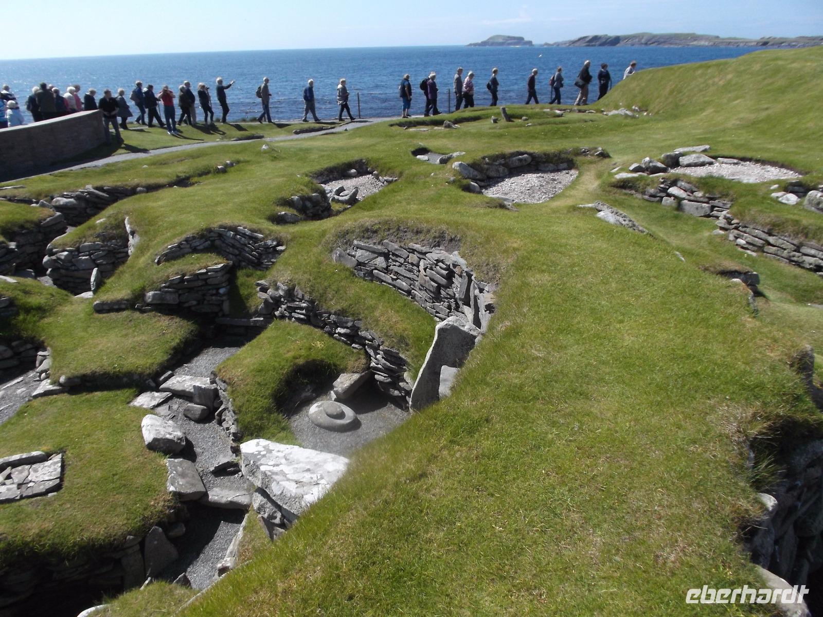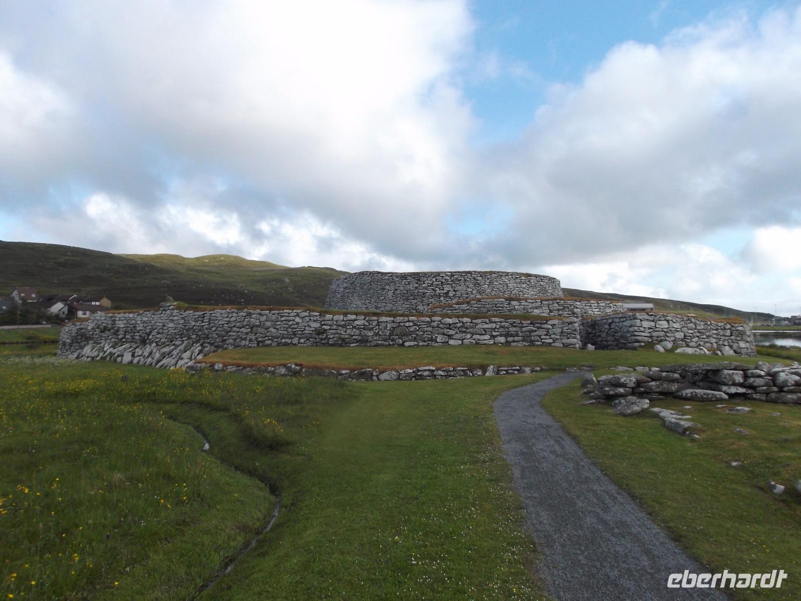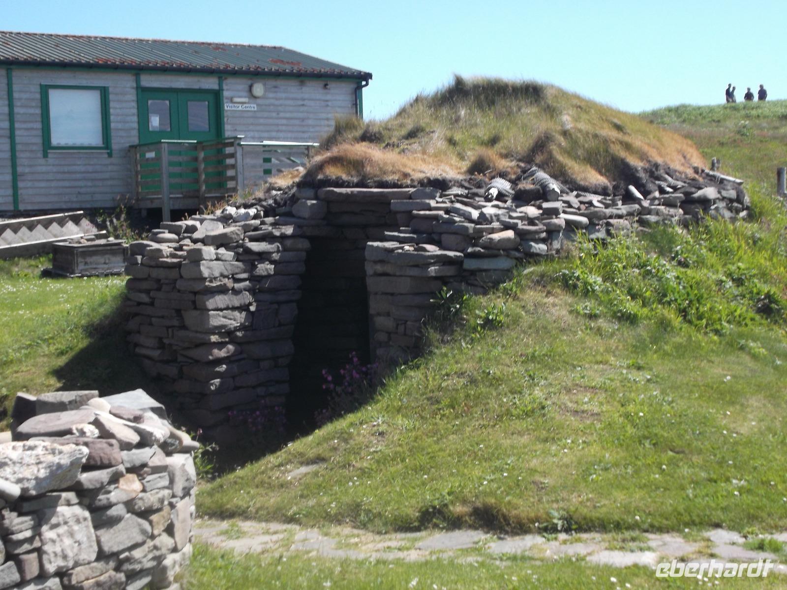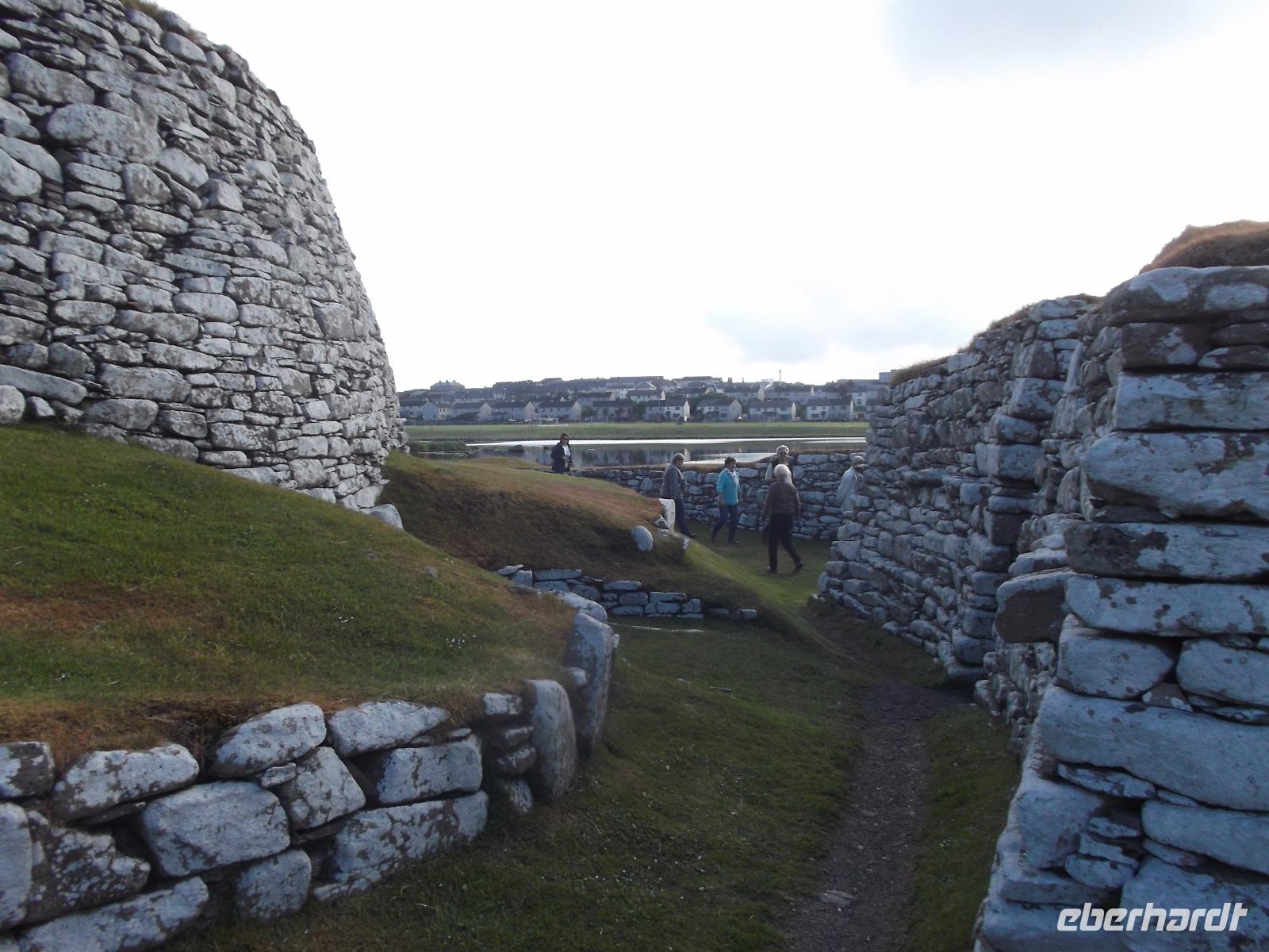 Als erstes besuchten wir einen der typischen eisenzeitlichen Wohntürme, die im Norden Schottlands, auf den Hebriden, den Orkneys und den Shetlands verbreitet sind. Broch nennt man die kegelstumpf-förmigen doppelwandigen Türme, die Schutz für ganze Sippen boten und seit der ausgehenden Bronzezeit, schon seit dem 7. Jh. v. Chr. errichtet wurden. Recht gut erhalten, wenn auch nur in seiner Grundanlage und nur etwa zwei Meter hoch, ist der Clickhimin-Broch. Wie die meisten der mehreren hundert in Schottland erhaltenen uralten Wohnbauten aus Trockenmauerwerk liegt er direkt am Meer - vermutlich dienten Felsbrocken von der Küste als Baumaterial.