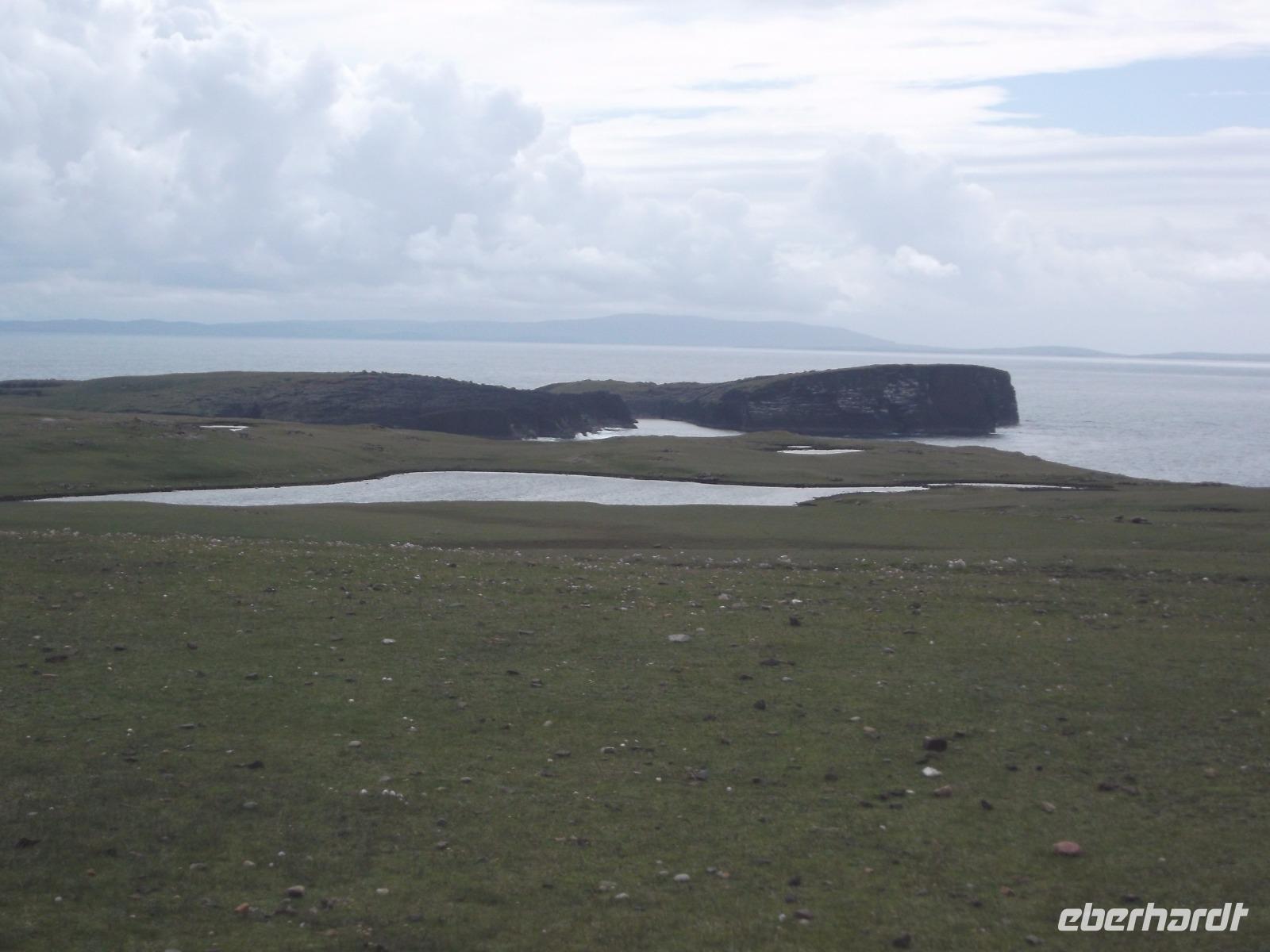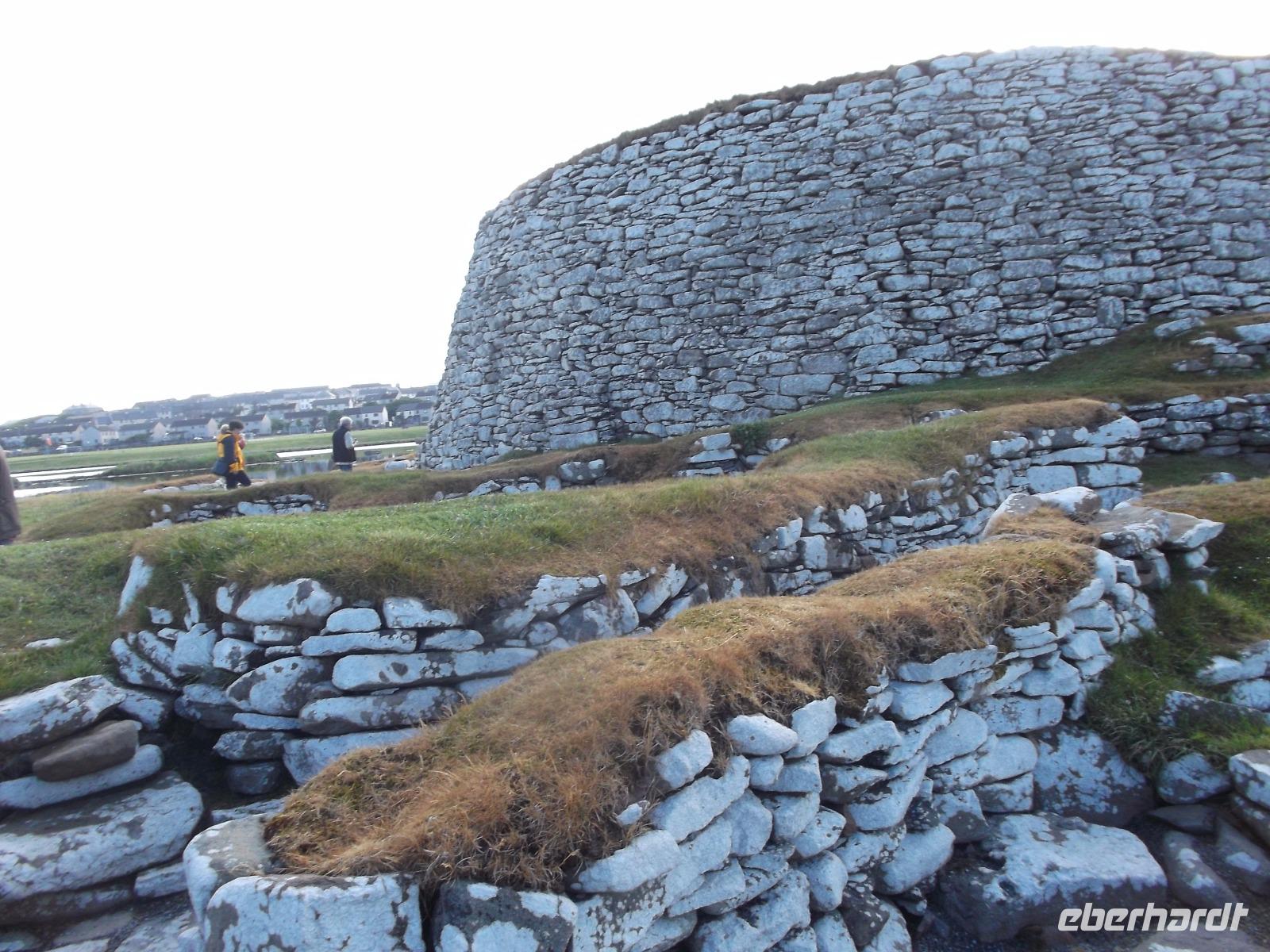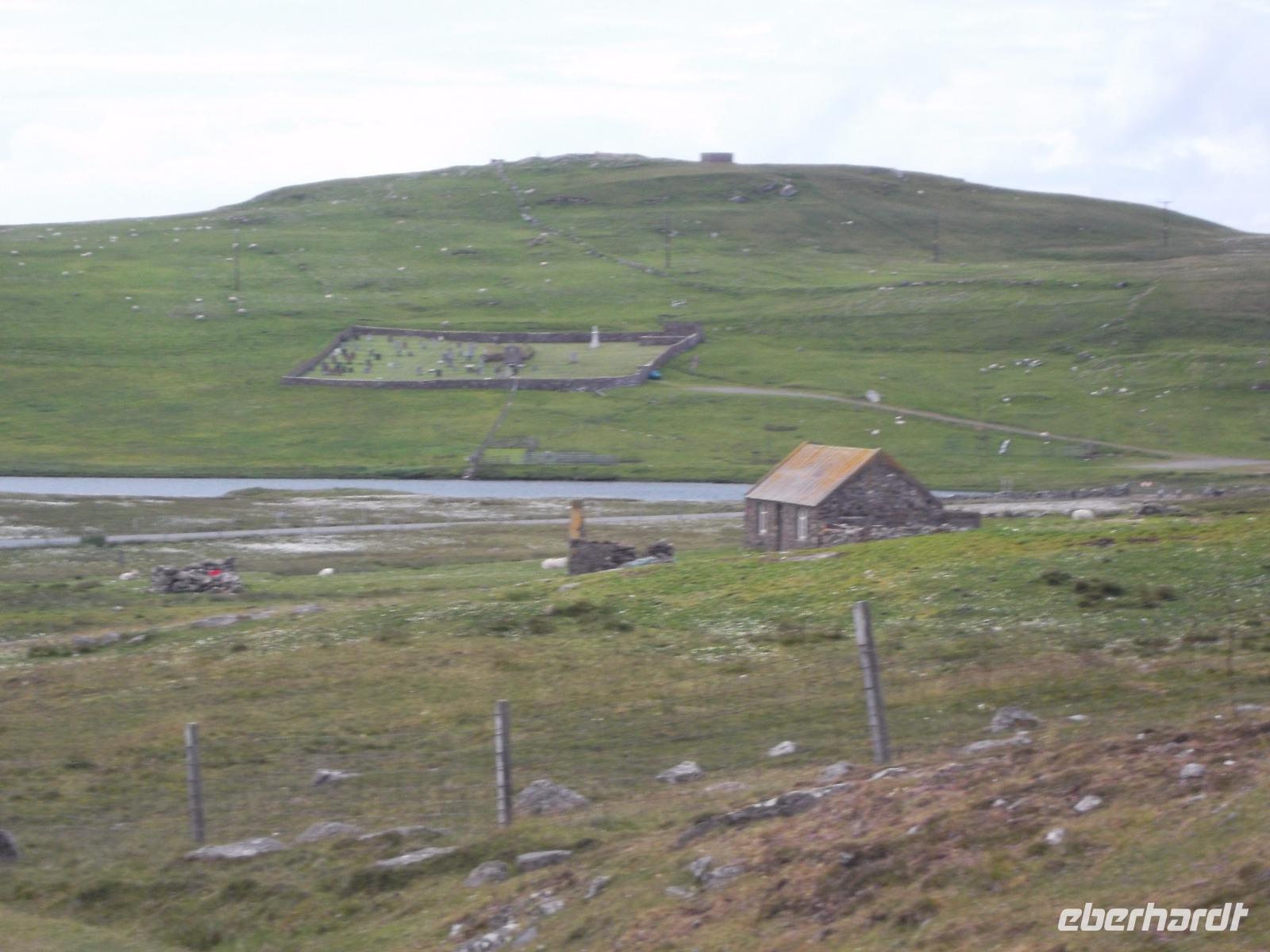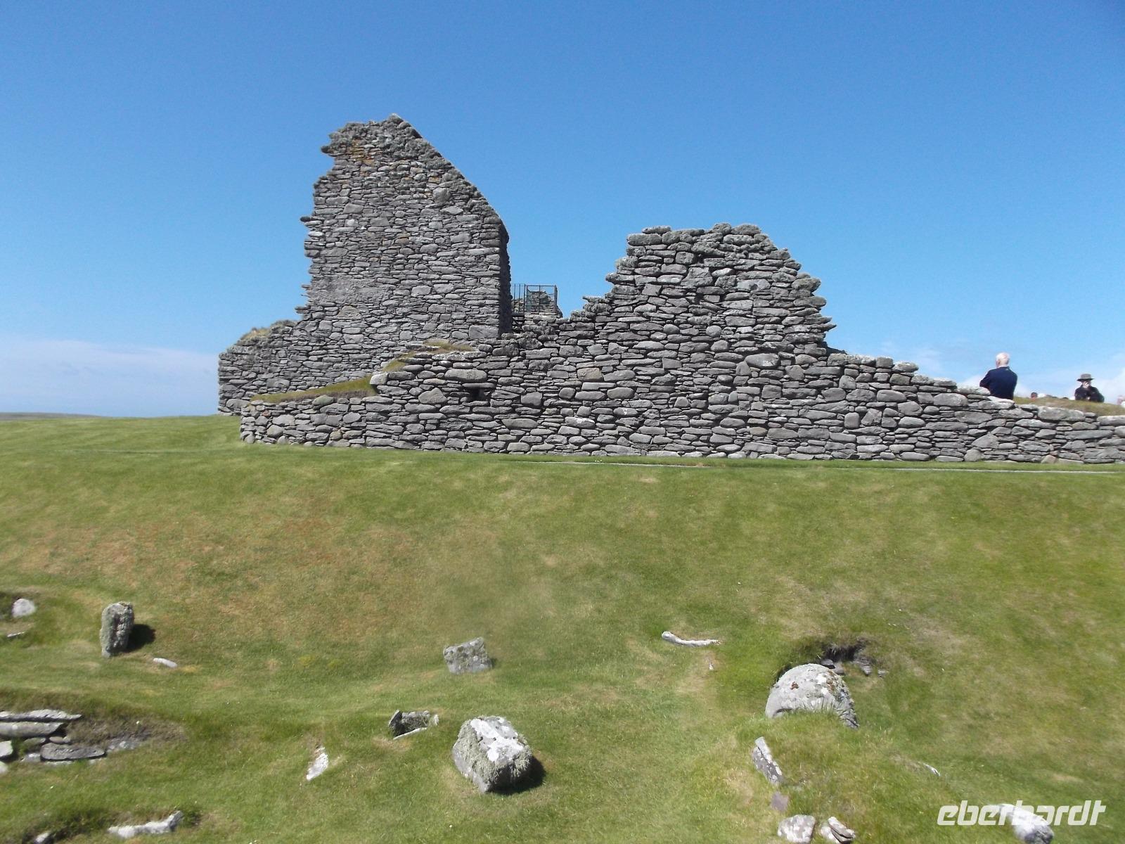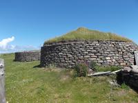 Als erstes besuchten wir einen der typischen eisenzeitlichen Wohntürme, die im Norden Schottlands, auf den Hebriden, den Orkneys und den Shetlands verbreitet sind. Broch nennt man die kegelstumpf-förmigen doppelwandigen Türme, die Schutz für ganze Sippen boten und seit der ausgehenden Bronzezeit, schon seit dem 7. Jh. v. Chr. errichtet wurden. Recht gut erhalten, wenn auch nur in seiner Grundanlage und nur etwa zwei Meter hoch, ist der Clickhimin-Broch. Wie die meisten der mehreren hundert in Schottland erhaltenen uralten Wohnbauten aus Trockenmauerwerk liegt er direkt am Meer - vermutlich dienten Felsbrocken von der Küste als Baumaterial.