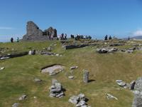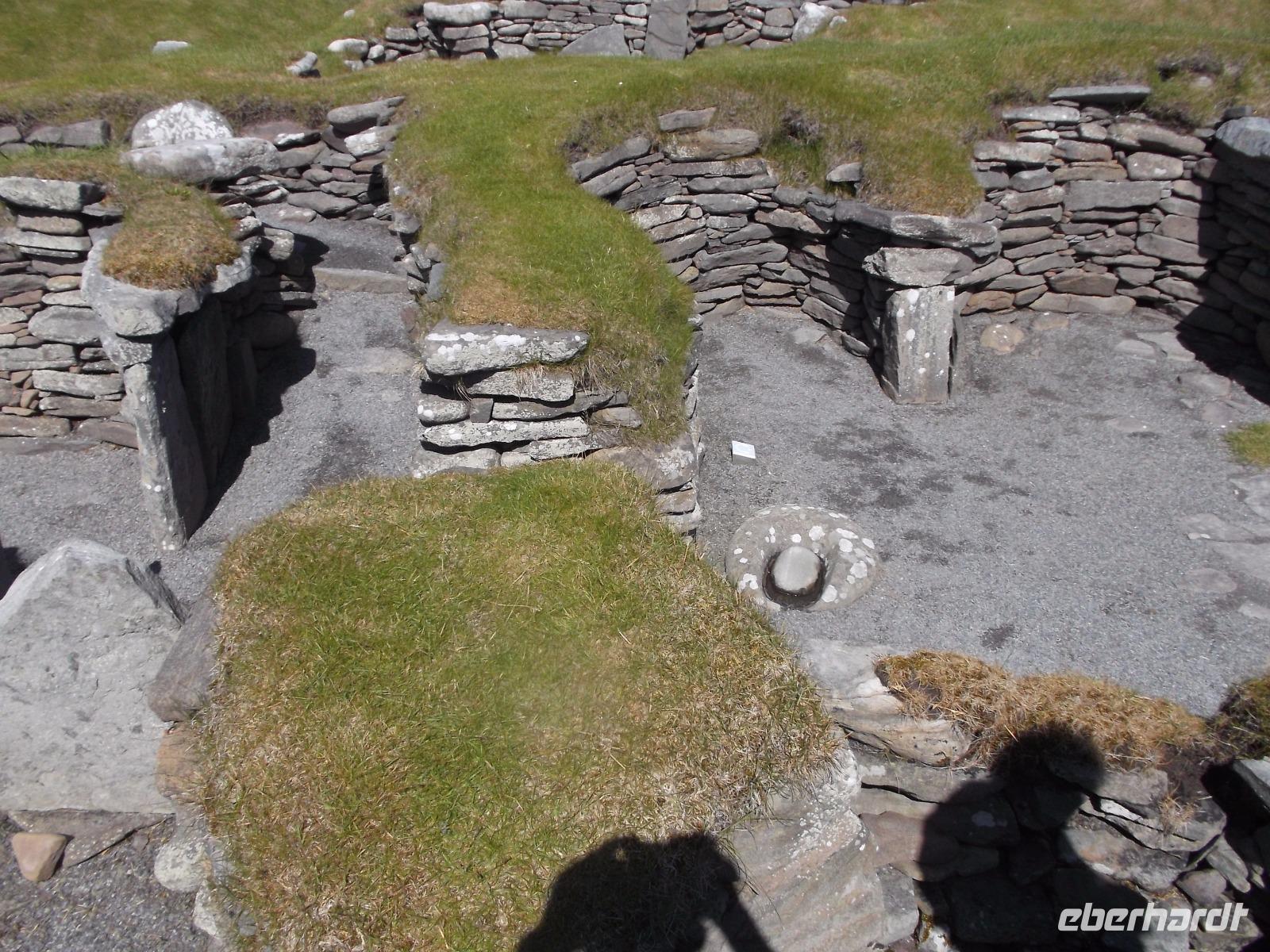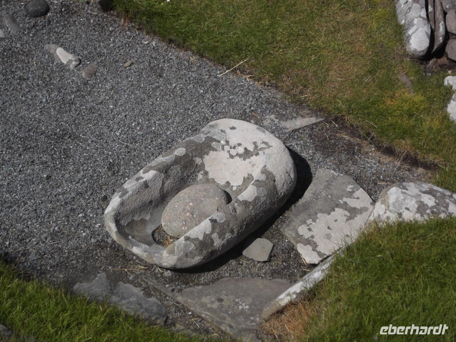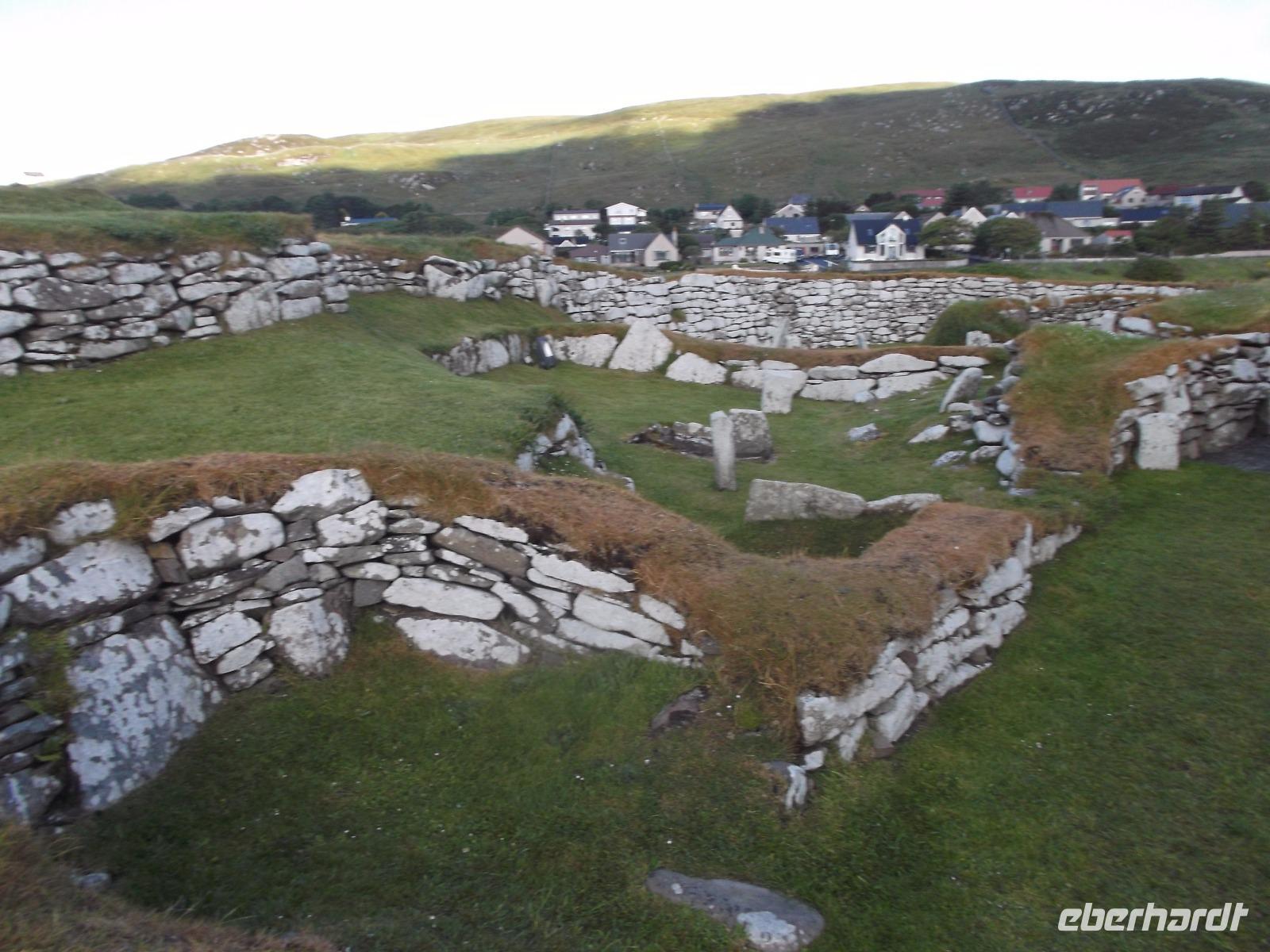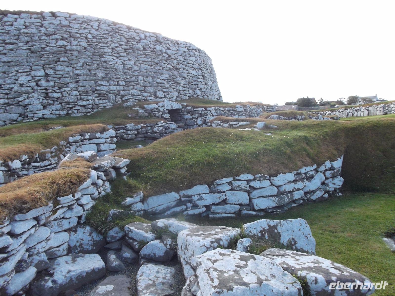 Als erstes besuchten wir einen der typischen eisenzeitlichen Wohntürme, die im Norden Schottlands, auf den Hebriden, den Orkneys und den Shetlands verbreitet sind. Broch nennt man die kegelstumpf-förmigen doppelwandigen Türme, die Schutz für ganze Sippen boten und seit der ausgehenden Bronzezeit, schon seit dem 7. Jh. v. Chr. errichtet wurden. Recht gut erhalten, wenn auch nur in seiner Grundanlage und nur etwa zwei Meter hoch, ist der Clickhimin-Broch. Wie die meisten der mehreren hundert in Schottland erhaltenen uralten Wohnbauten aus Trockenmauerwerk liegt er direkt am Meer - vermutlich dienten Felsbrocken von der Küste als Baumaterial.
