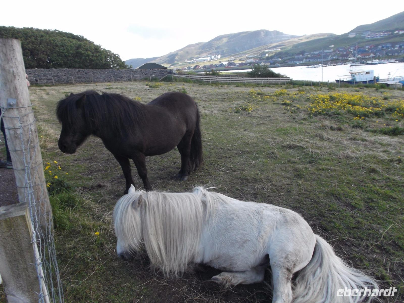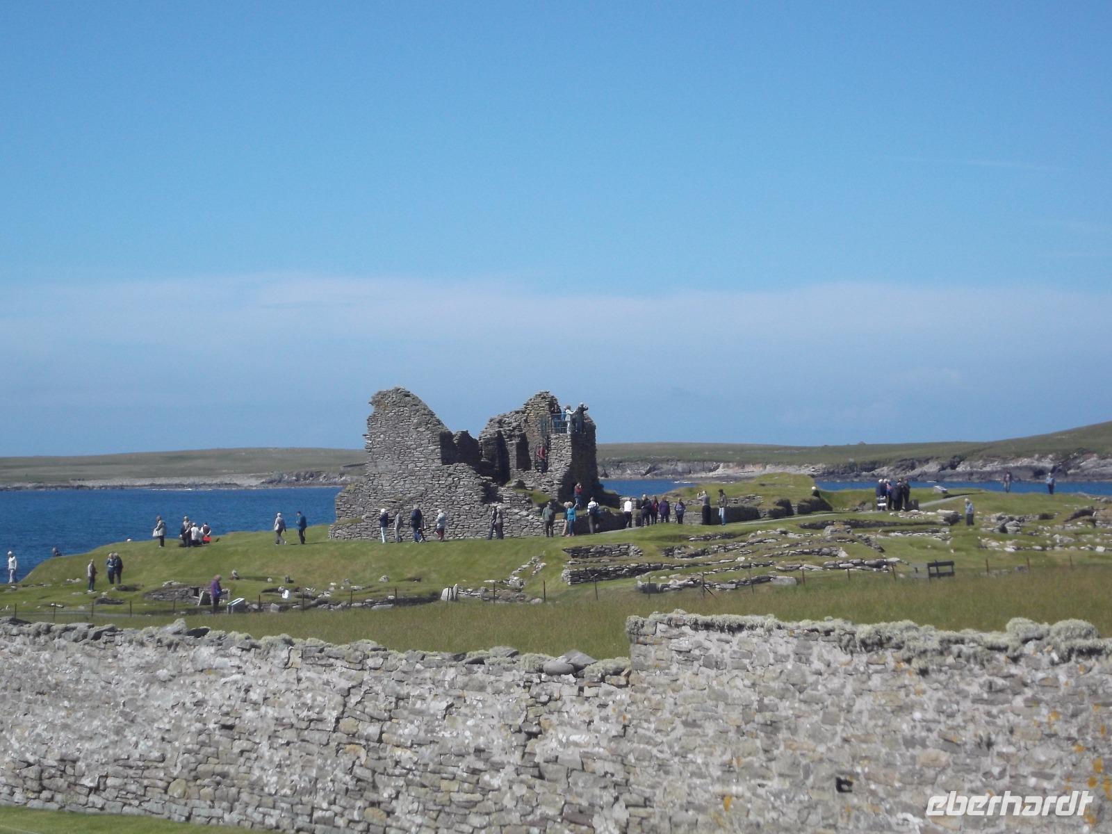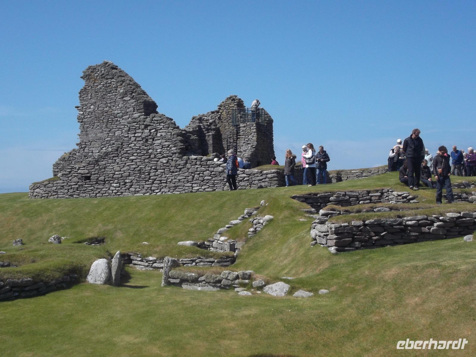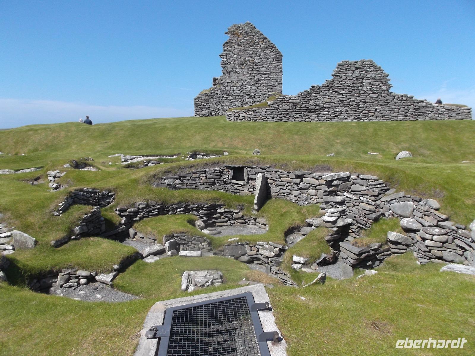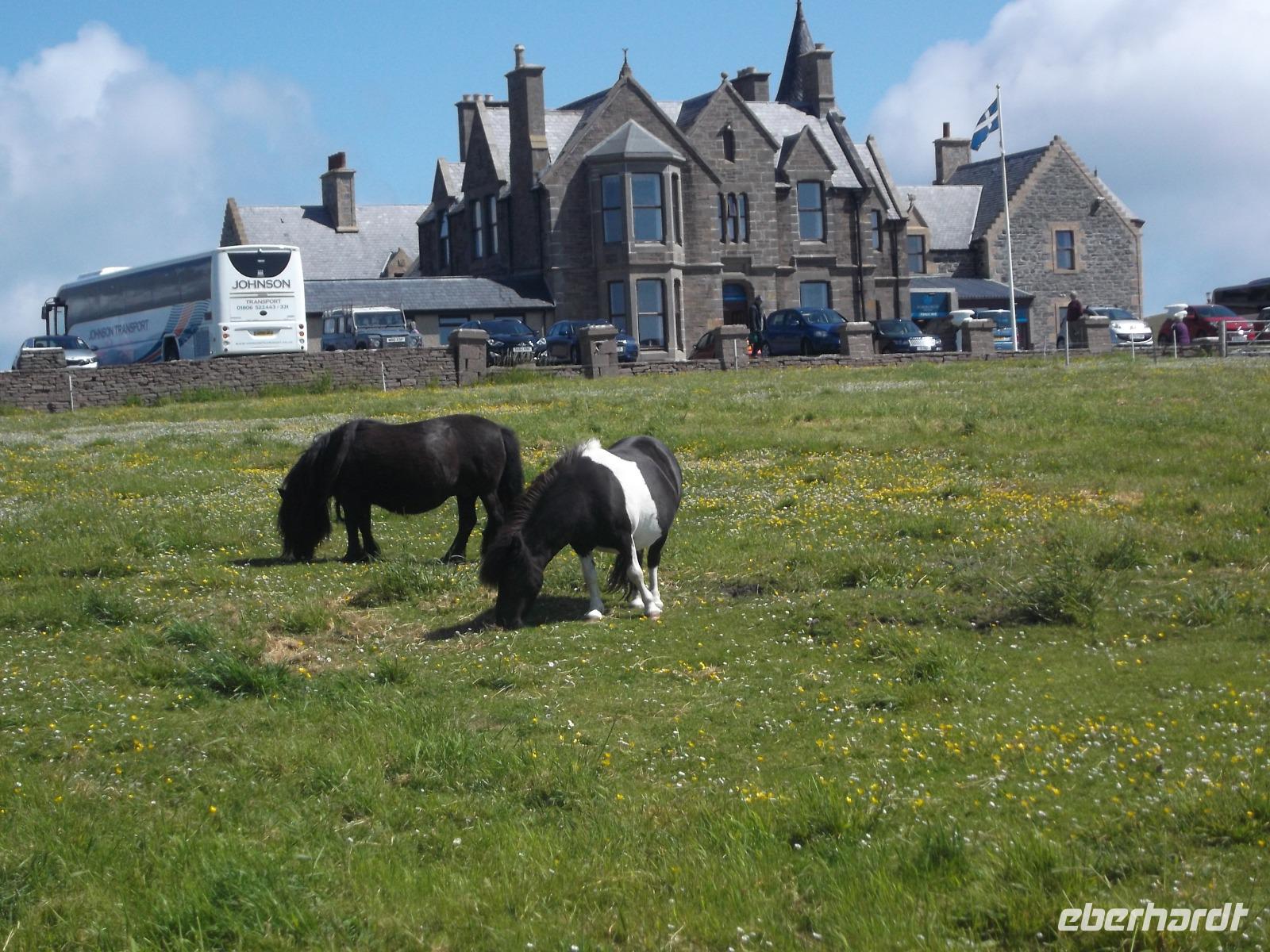 Später ging es weiter zum prähistorischen Jarlshof, einer Rundhaussiedlung aus der Steinzeit. Den Namen hat der berühmte schottische Historien-Autor Sir Walther Scott geprägt und ihn in seiner Novelle „Der Pirat" verwendet. Zu der historischen Sehenswürdigkeit gehören Bauten aus mehreren aufeinanderfolgenden Epochen von der Steinzeit über bronzezeitlichen Rundhäuser zu Bauten der Pikten und der Wikinger sowie diue Ruine eines Wohnturms aus dem 16. Jahrhundert. Auffallend viele steinerne Getreide-Mahlsteine in den Häuserresten deuten darauf, dass es hier im hohen Norden umfangreichen Getreideanbau gegeben haben muss. Nebenan weideten friedlich die bekannten und nach den Inseln benannten Shetland-Ponies.