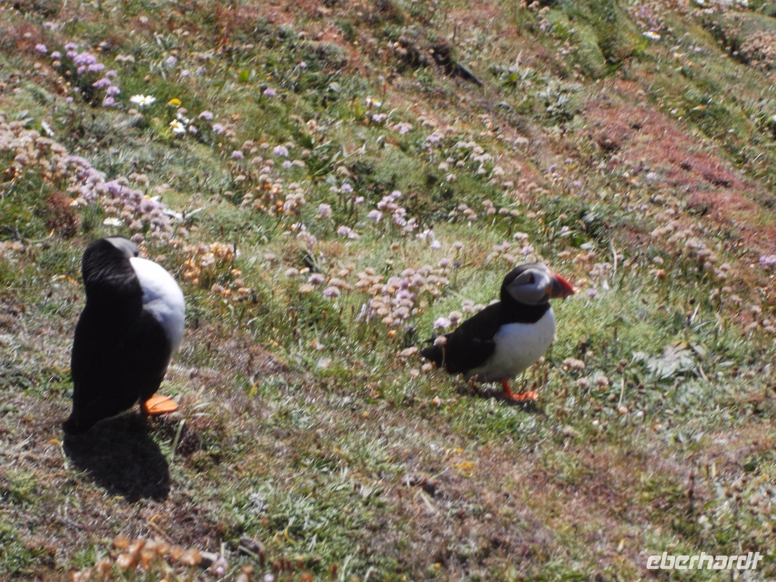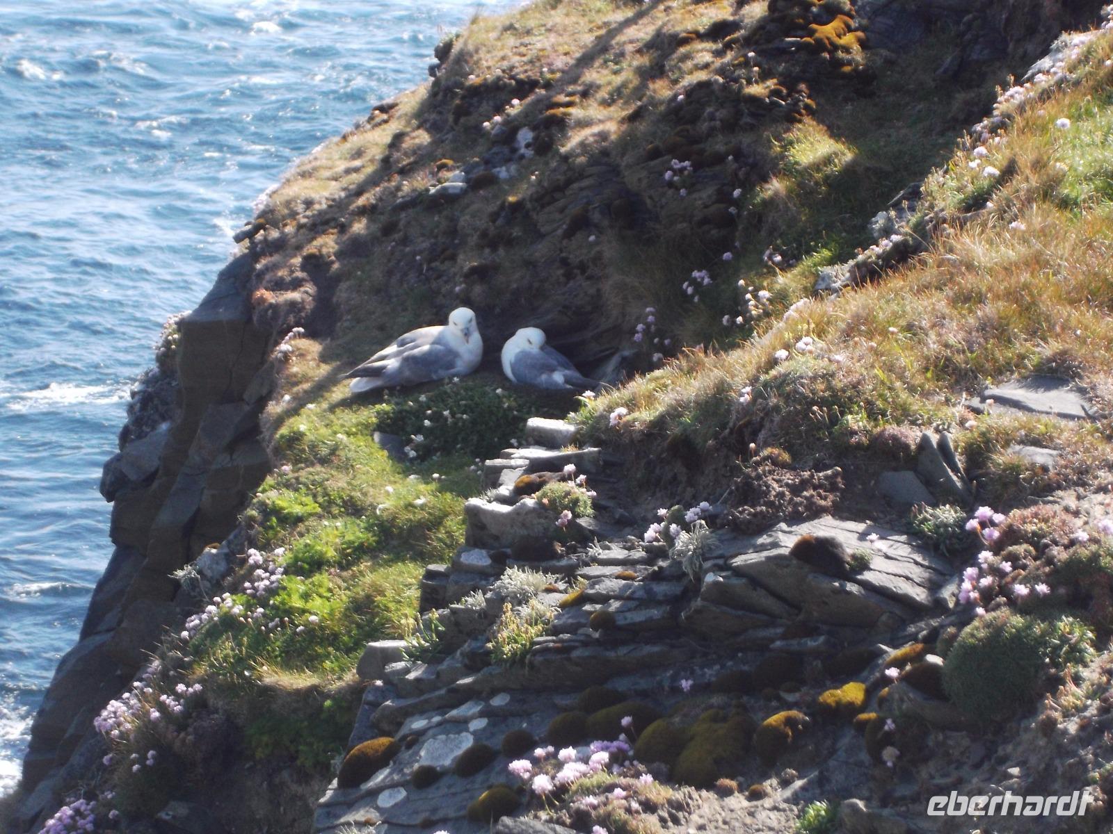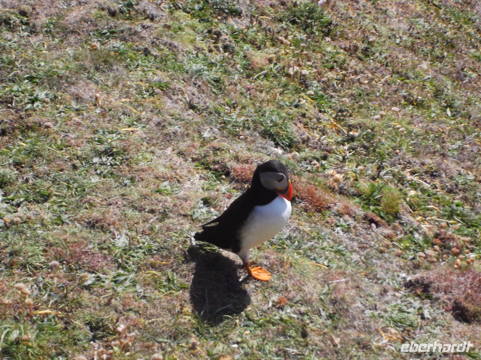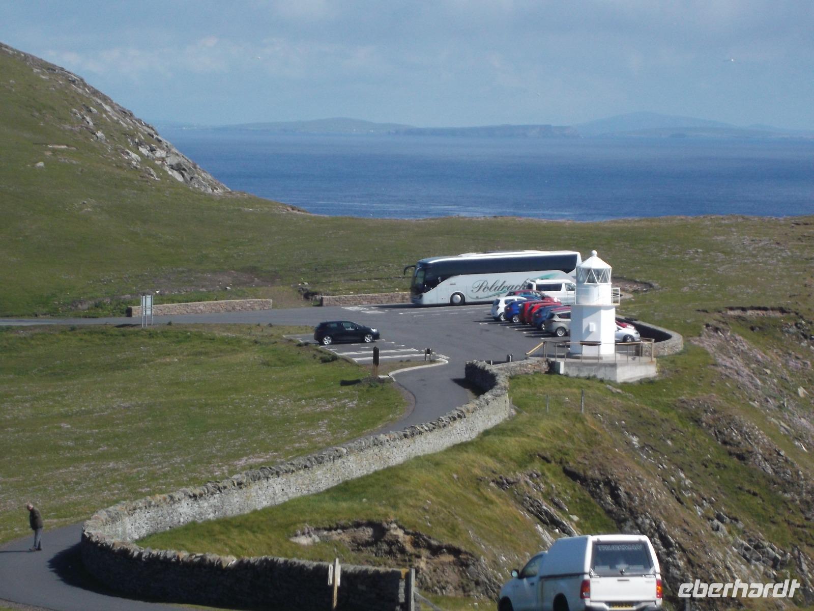 Das Wetter meinte es heute besonders gut mit uns und so konnten fast alle die nun folgende Szenerie als besonderen Höhepunkt empfinden. Während unser Bus auf dem südlichsten Parkplatz der Shetlands stand, konnten wir die Felsen der Steilklippen von Sumburgh Head hinaufwandern. Hier steht, fast 100 Meter über dem meist tosenden Meer ein Leuchtturm aus dem 19. Jh., entworfen von der Architektenfamilie Stevenson, der auch der Autor der „Schatzinsel" entstammte. Das Besondere an diesen Klippen ist aber vor allem, dass zehntausende Seevögel nisten und brüten und man recht nahe an sie herankommt. Wir konnten uns davon überzeugen, wie die scheuen, aber fotogenen und putzigen Papageientaucher hier in wenigen Metern Entfernung vom Betrachter agieren. Wir beobachteten die hübschen Vögel und ihre oft sehr komischen und lustig anmutenden Flugübungen. Mancher von uns konnte sich dann kaum trennen von diesen Vögeln, die man sonst sehr selten und fast nirgends aus so kurzer Entfernung in „freier Wildbahn" betrachten kann.