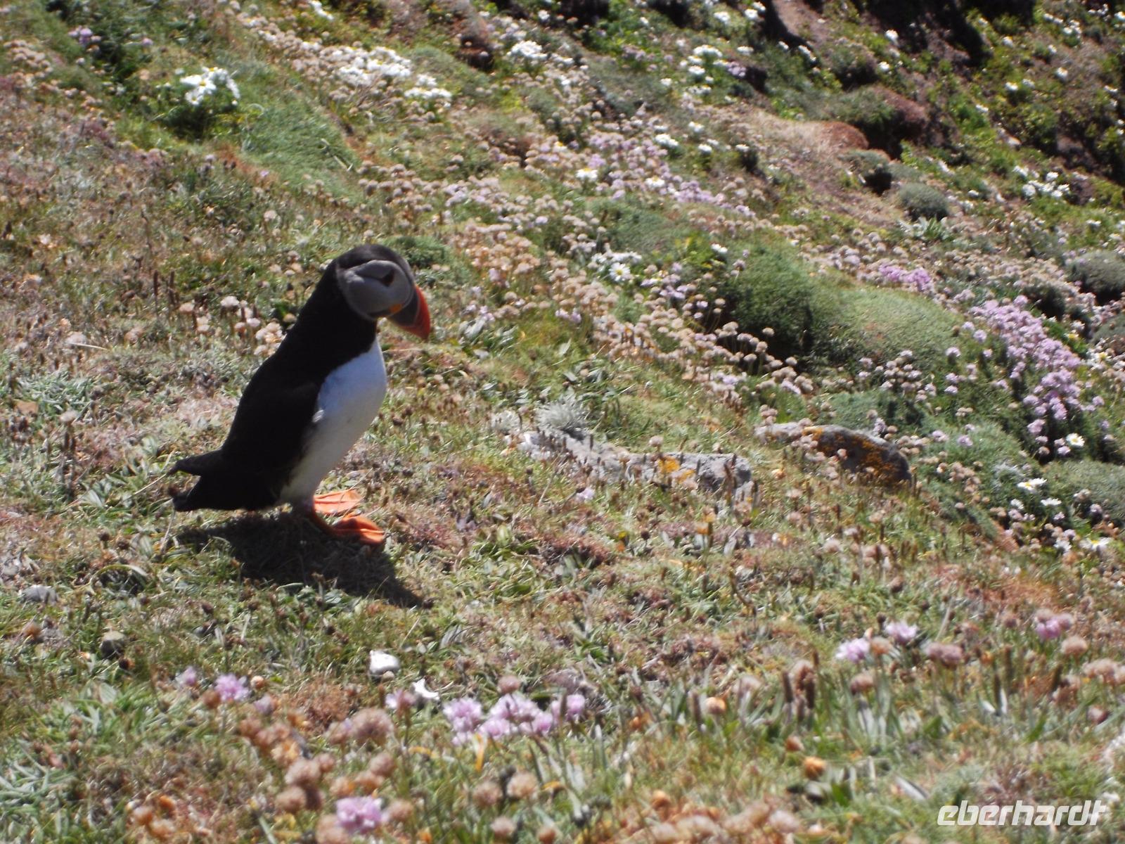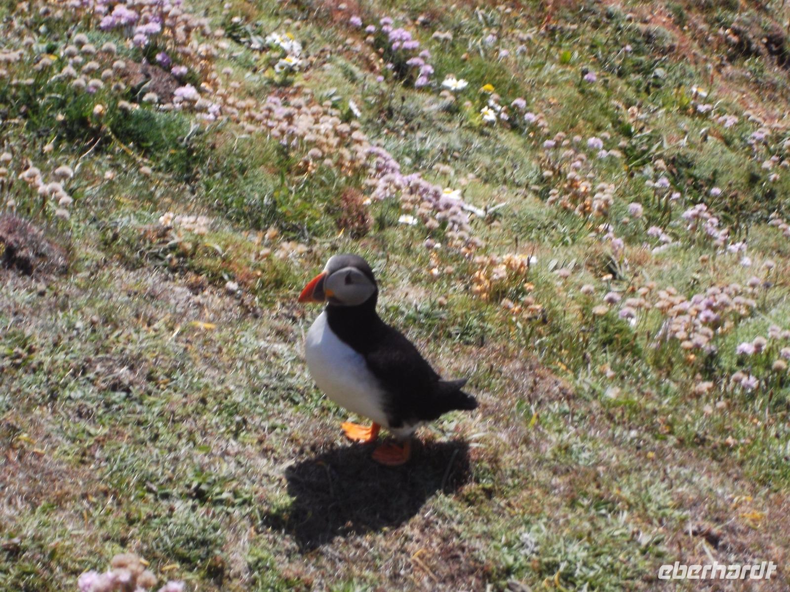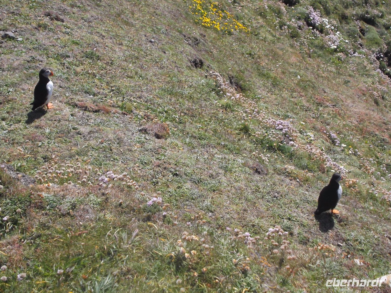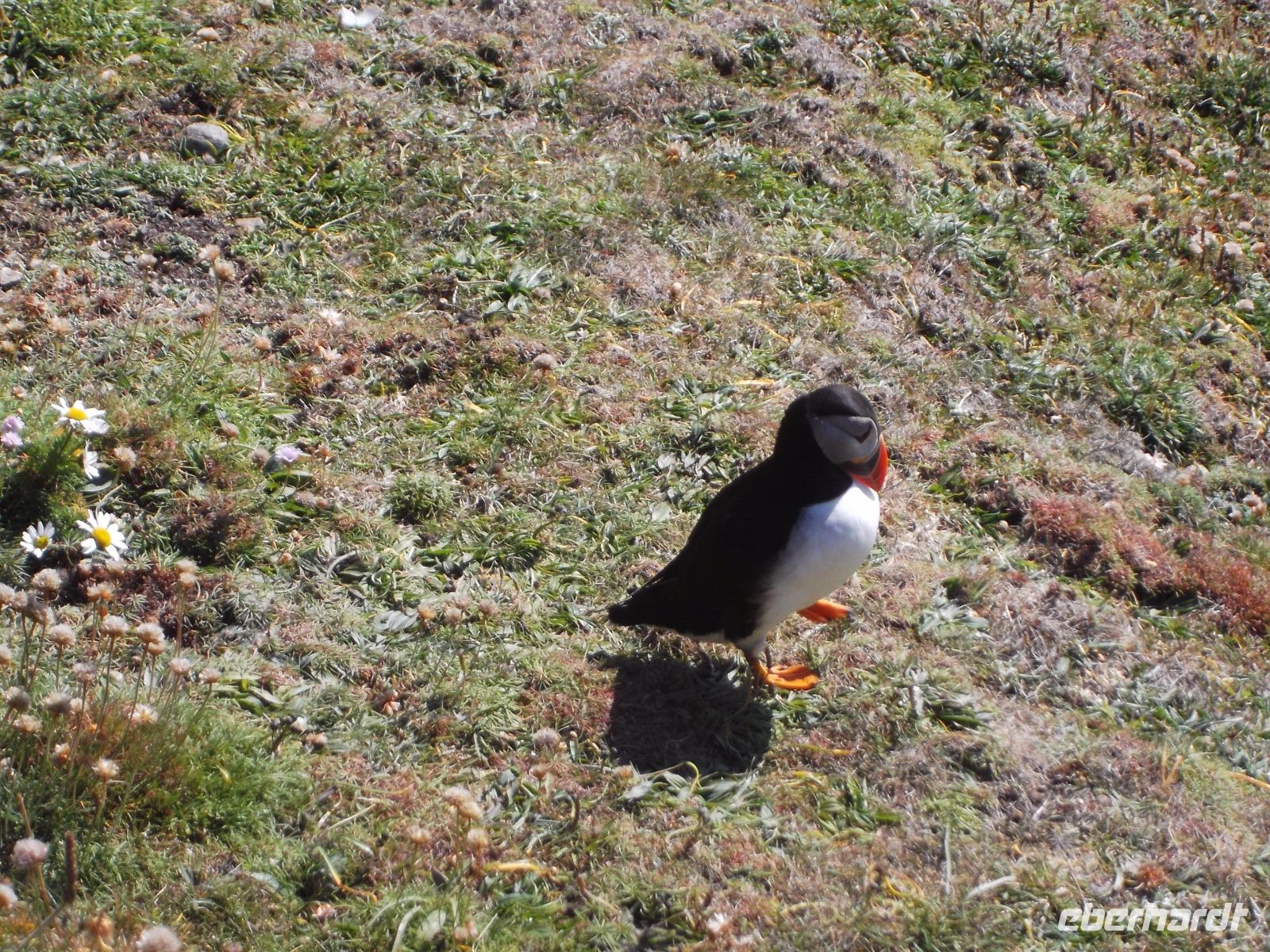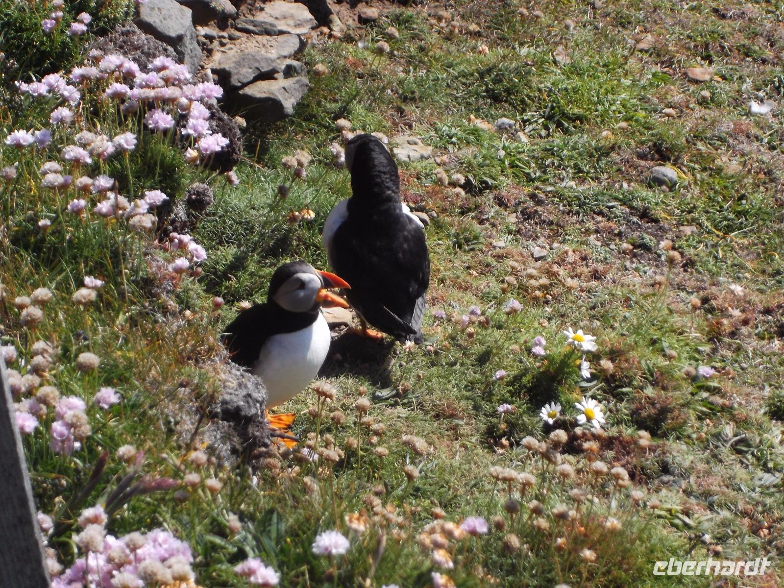 Das Wetter meinte es heute besonders gut mit uns und so konnten fast alle die nun folgende Szenerie als besonderen Höhepunkt empfinden. Während unser Bus auf dem südlichsten Parkplatz der Shetlands stand, konnten wir die Felsen der Steilklippen von Sumburgh Head hinaufwandern. Hier steht, fast 100 Meter über dem meist tosenden Meer ein Leuchtturm aus dem 19. Jh., entworfen von der Architektenfamilie Stevenson, der auch der Autor der „Schatzinsel" entstammte. Das Besondere an diesen Klippen ist aber vor allem, dass zehntausende Seevögel nisten und brüten und man recht nahe an sie herankommt. Wir konnten uns davon überzeugen, wie die scheuen, aber fotogenen und putzigen Papageientaucher hier in wenigen Metern Entfernung vom Betrachter agieren. Wir beobachteten die hübschen Vögel und ihre oft sehr komischen und lustig anmutenden Flugübungen. Mancher von uns konnte sich dann kaum trennen von diesen Vögeln, die man sonst sehr selten und fast nirgends aus so kurzer Entfernung in „freier Wildbahn" betrachten kann.