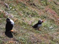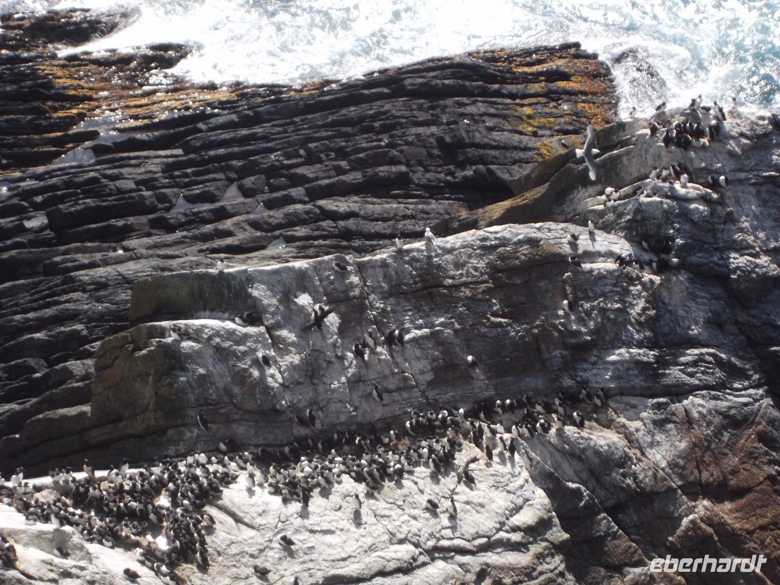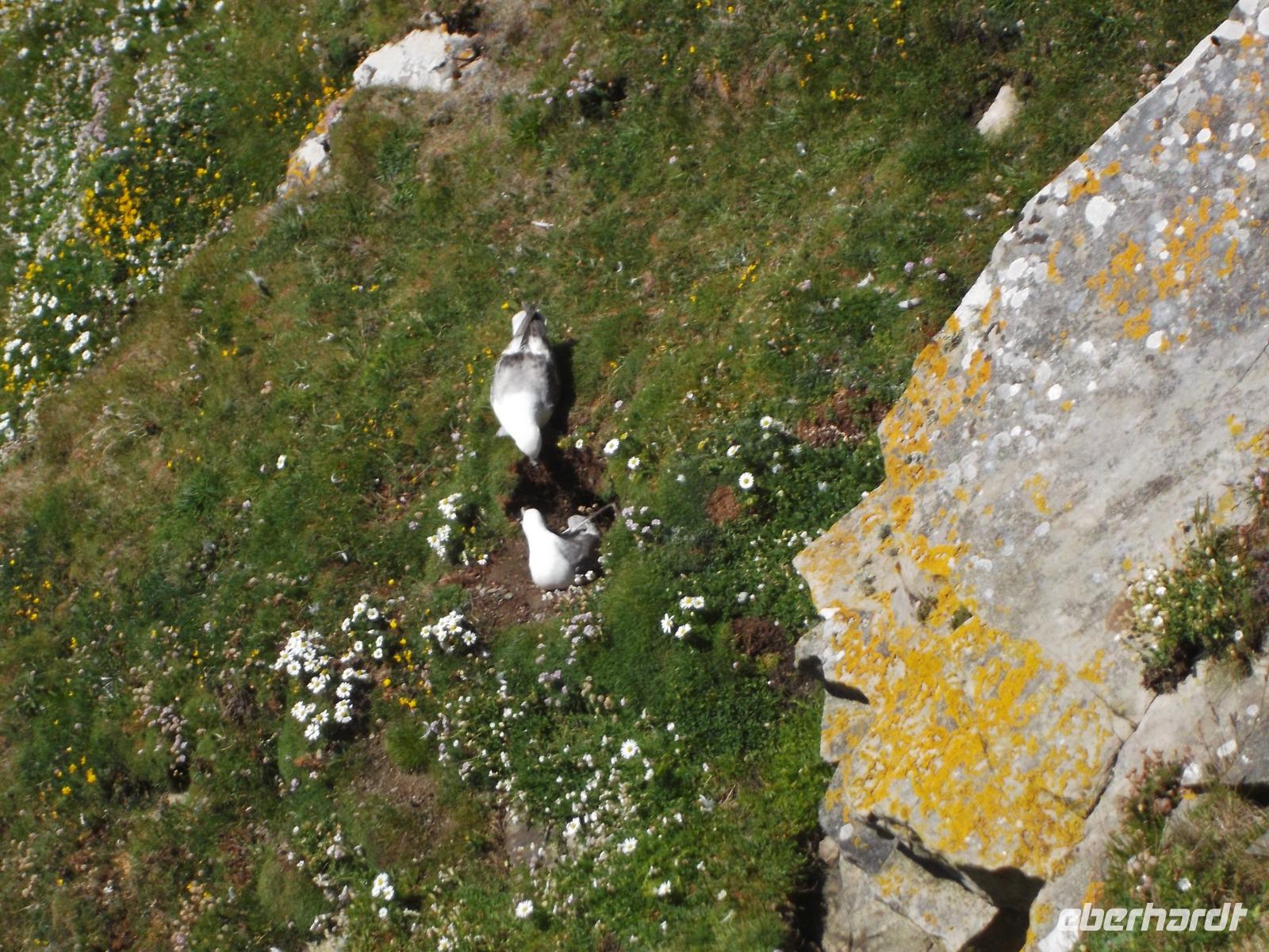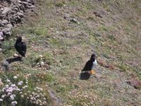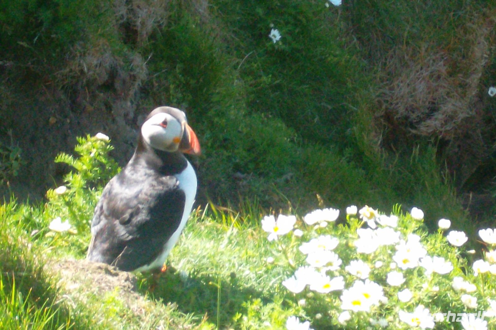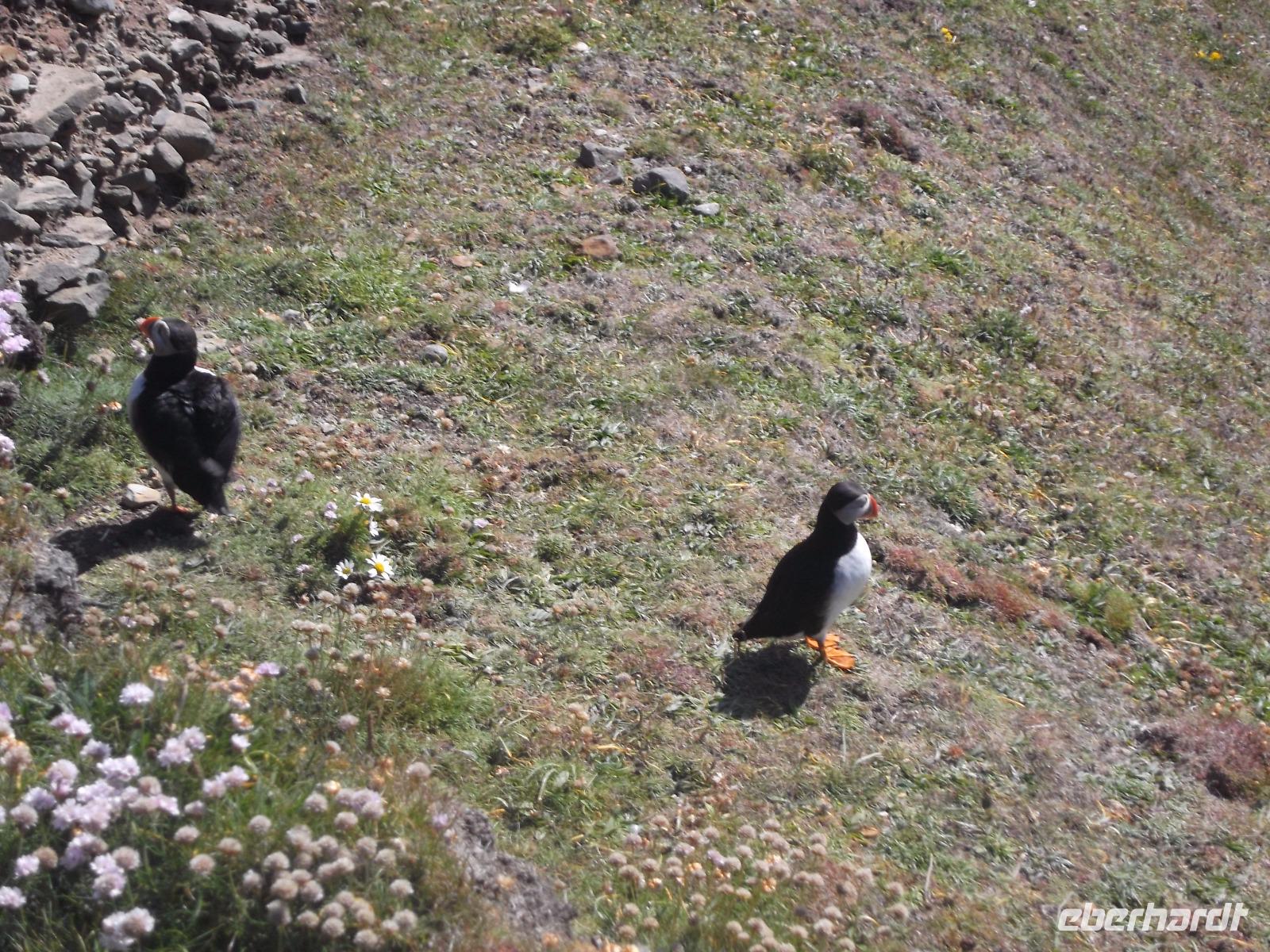 Das Wetter meinte es heute besonders gut mit uns und so konnten fast alle die nun folgende Szenerie als besonderen Höhepunkt empfinden. Während unser Bus auf dem südlichsten Parkplatz der Shetlands stand, konnten wir die Felsen der Steilklippen von Sumburgh Head hinaufwandern. Hier steht, fast 100 Meter über dem meist tosenden Meer ein Leuchtturm aus dem 19. Jh., entworfen von der Architektenfamilie Stevenson, der auch der Autor der „Schatzinsel" entstammte. Das Besondere an diesen Klippen ist aber vor allem, dass zehntausende Seevögel nisten und brüten und man recht nahe an sie herankommt. Wir konnten uns davon überzeugen, wie die scheuen, aber fotogenen und putzigen Papageientaucher hier in wenigen Metern Entfernung vom Betrachter agieren. Wir beobachteten die hübschen Vögel und ihre oft sehr komischen und lustig anmutenden Flugübungen. Mancher von uns konnte sich dann kaum trennen von diesen Vögeln, die man sonst sehr selten und fast nirgends aus so kurzer Entfernung in „freier Wildbahn" betrachten kann.