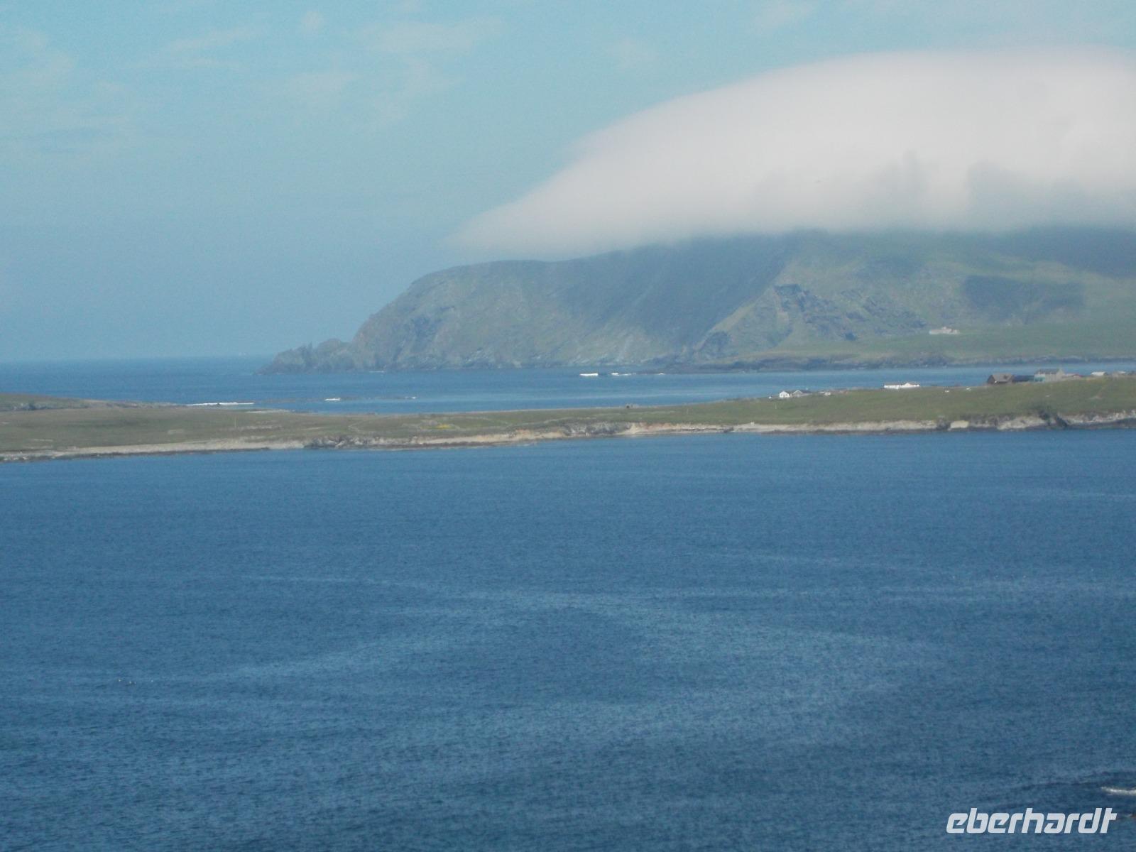 Auch der heutige Tag war noch den Shetland-Inseln gewidmet, aber anders als gestern ging es diesmal zunächst nach Norden, wo die Landschaften immer einsamer werden. Unser Ziel war die Halbinsel Nordmavine, der „obere" Teil der Hauptinsel Mainland. Ein Fotostopp in Marvis Grind zeigte die Landenge, an der sich der Atlantische Ozean und sein Randmeer Nordsee am nächsten kommen - nur etwa dreißig Meter sind die zu den jeweiligen Meeren gehörenden Buchten voneinander getrennt durch einen schmalen Fels-Streifen, über den die Hauptstraße ins nördliche Mainland führt. Allerdings meinte es derzeit das Wetter nicht so gut wie gestern, wo wir die Klippenlandschaft des südlichen Mainland bei strahlendem Sonnenschein genießen konnten. Noch war es regnerisch und etwas diesg, aber der Wind versprach, die Wolken vielleicht doch noch etwas zu zerstreuen...