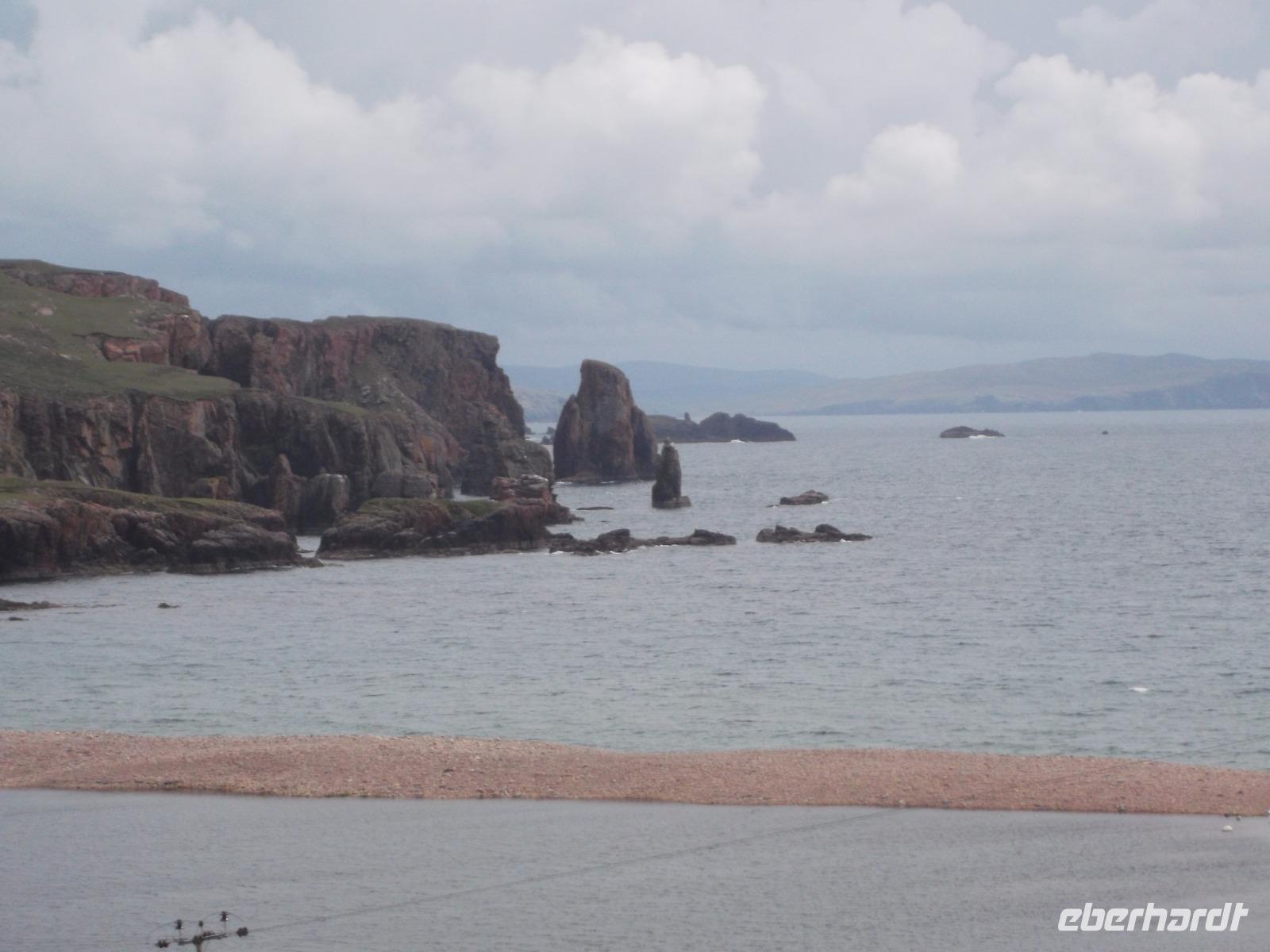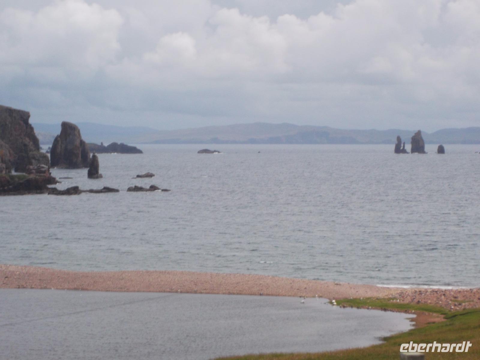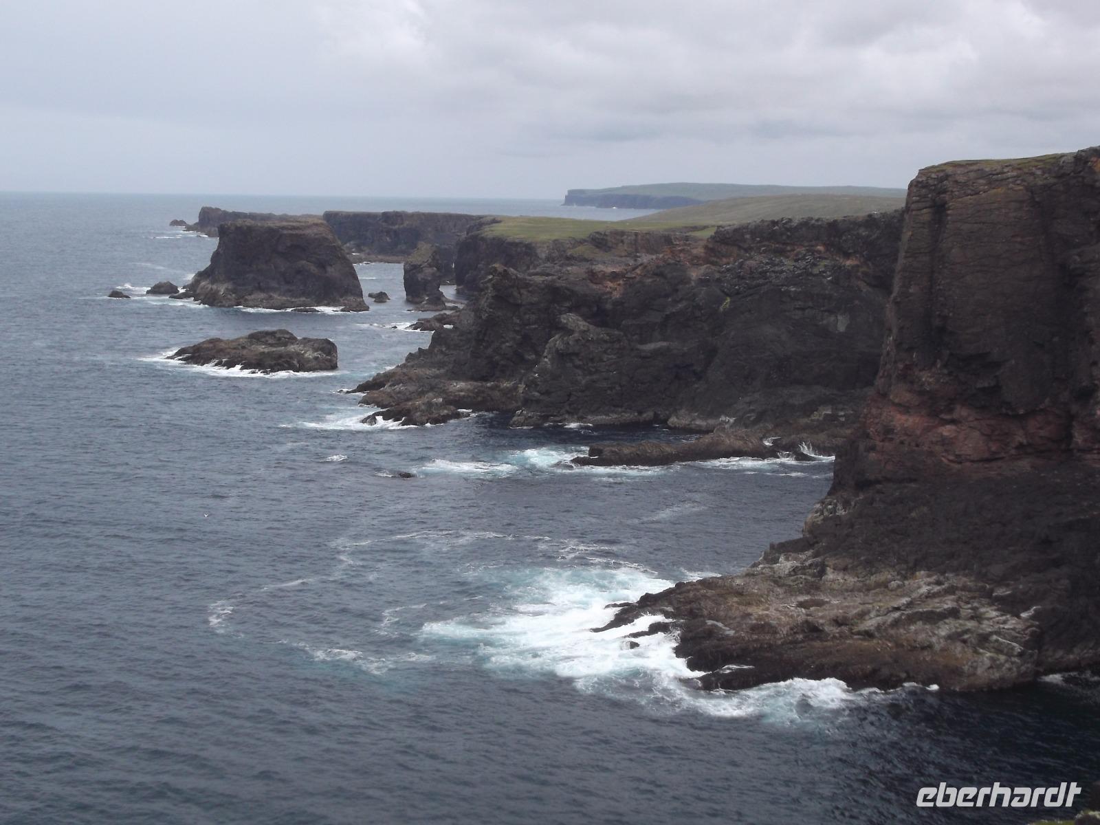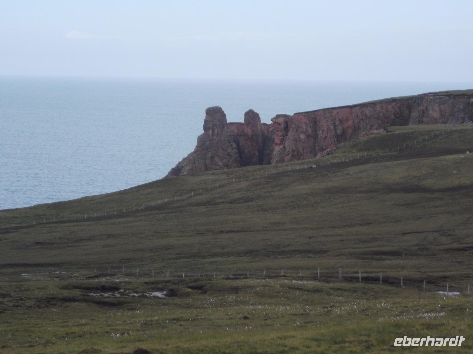 Nach dem Essen wandten wir uns dem letzten Ziel auf den Shetlands zu, bevor wir am späten Nachmittag wieder auf der Fähre einchecken würden. Den Westzipfel von North Mainland bildet die Halbinsel Eshaness. Ihre grandiosen Küstenlandschaften zeigen Felsenszenarien in allen Varianten: Felszacken, die ein Stück von der Küste entfernt in den Wellen auftauchen und an versteinerte Segel oder untergegangene Schiffe erinnern, zerklüftete rote Vulkanfelsen, auf die sich die tosende weiß-azurblaue Brandung stürzt. An der Spitze, dem Eshaness Head, steht auf den vielleicht 60 m über den Atlantik aufragenden Klippen der 1929 erbaute Leuchtturm gekrönt sind. Zwar war es hier ganz schön windig, aber das hielt uns nicht davon ab, Dutzende Fotos von der durch die Naturgewalten geschaffenen Komposition der zerklüfteten Uferfelsen zu machen. Später zeigte uns noch ein Fotostopp bei Stenness den vielleicht berühmtesten, einsam im Meer stehenden durchbrochenen Felsen der Insel Dore Holm. Die Legende sieht in ihm die Gestalt eines trinkenden Wikingerpferdes und tatsächlich kann man mit etwas Phantasie genau das in dem roten Felseneiland, beherrscht von einem durch die Gewalten des Meeres ausgewaschenen Felsendurchbruch erkennen.