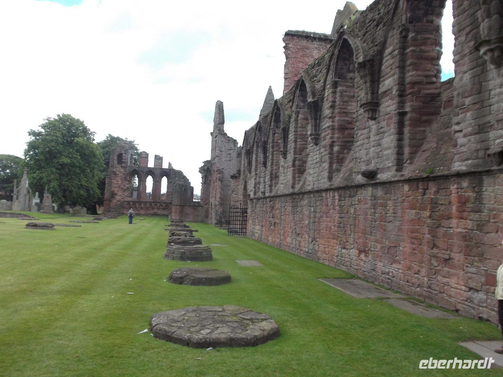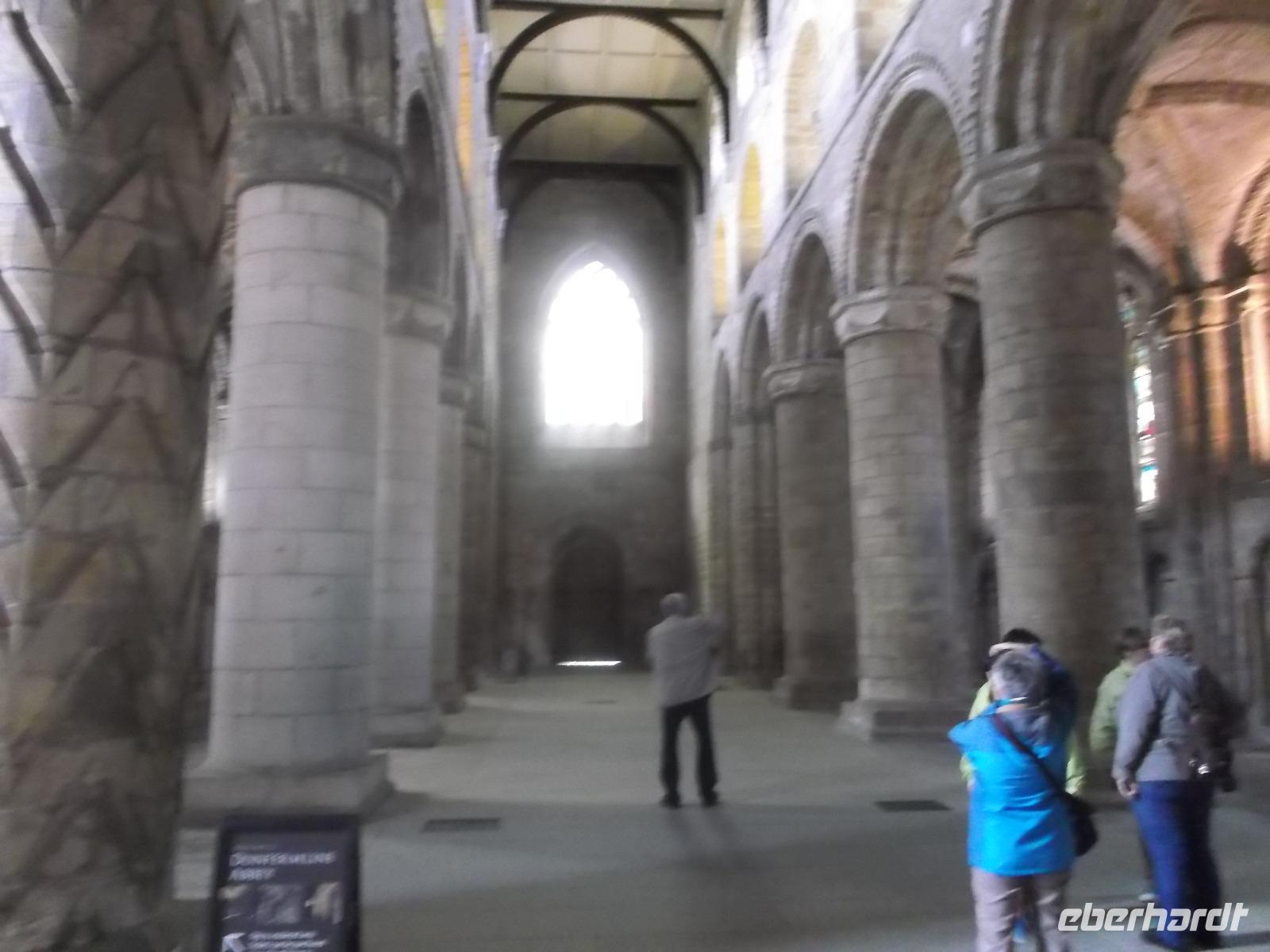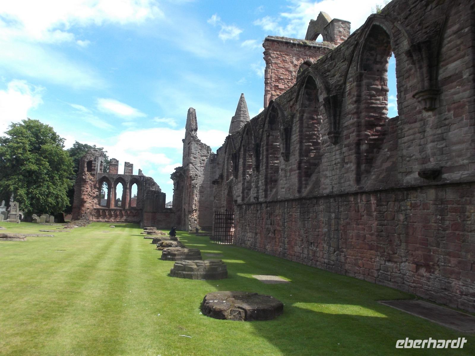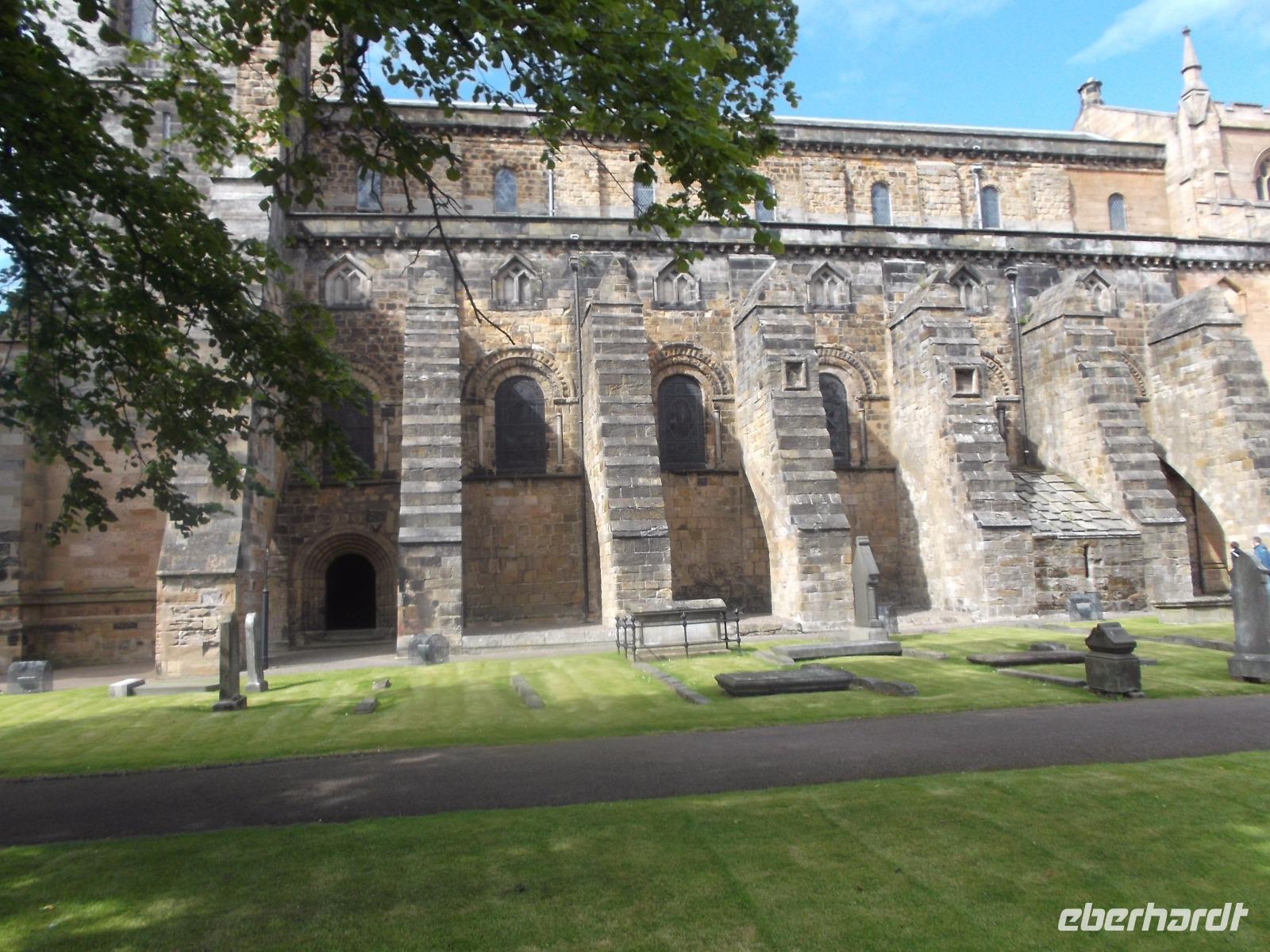 Anschließend ging es weiter nach Dunfermline. Das war einmal eine der der alten schottischen Hauptstädte, und ihre Abtei beherbergt die Grablege von über 20 Königen und Königinnen - damit ist sie der größte schottische Königsfriedhof nach dem „heiligen" Reilig Odhrain auf der Hebrideninsel Iona. Die immer wieder umgebaute Abtei ist in ihrem historischen Kern noch romanisch und dieser Teil hat bis heute eine unerhörte Raumwirkung wenn man ihn nach dem Besuch des gotischen Anbaus besucht. Man gelangt hierher durch die Kapelle der im 13. Jahrhundert heiliggesprochenen schottischen Königin Margarete. Wuchtige Säulen tragen die obere Fensterreihe, die immer noch das Kennzeichen des Langhauses der Basilika ist, als der man die Abteikirche von Dunfermline einst baute. Direkt neben der Abtei steht der nur noch mit den Resten einer Mauer erhaltene Königspalast und vor dem Gebäudekomplex kann man noch das rosa verputzte Abtshaus aus dem 16. Jh. bewundern.