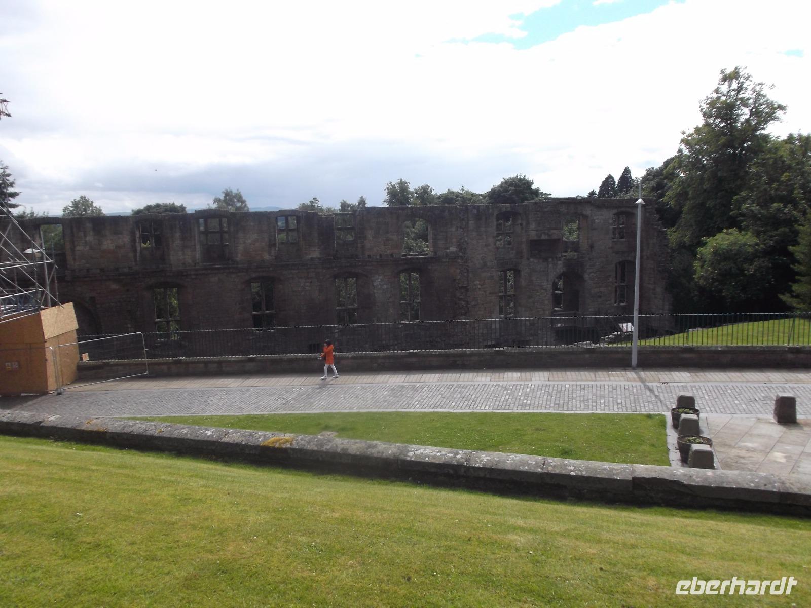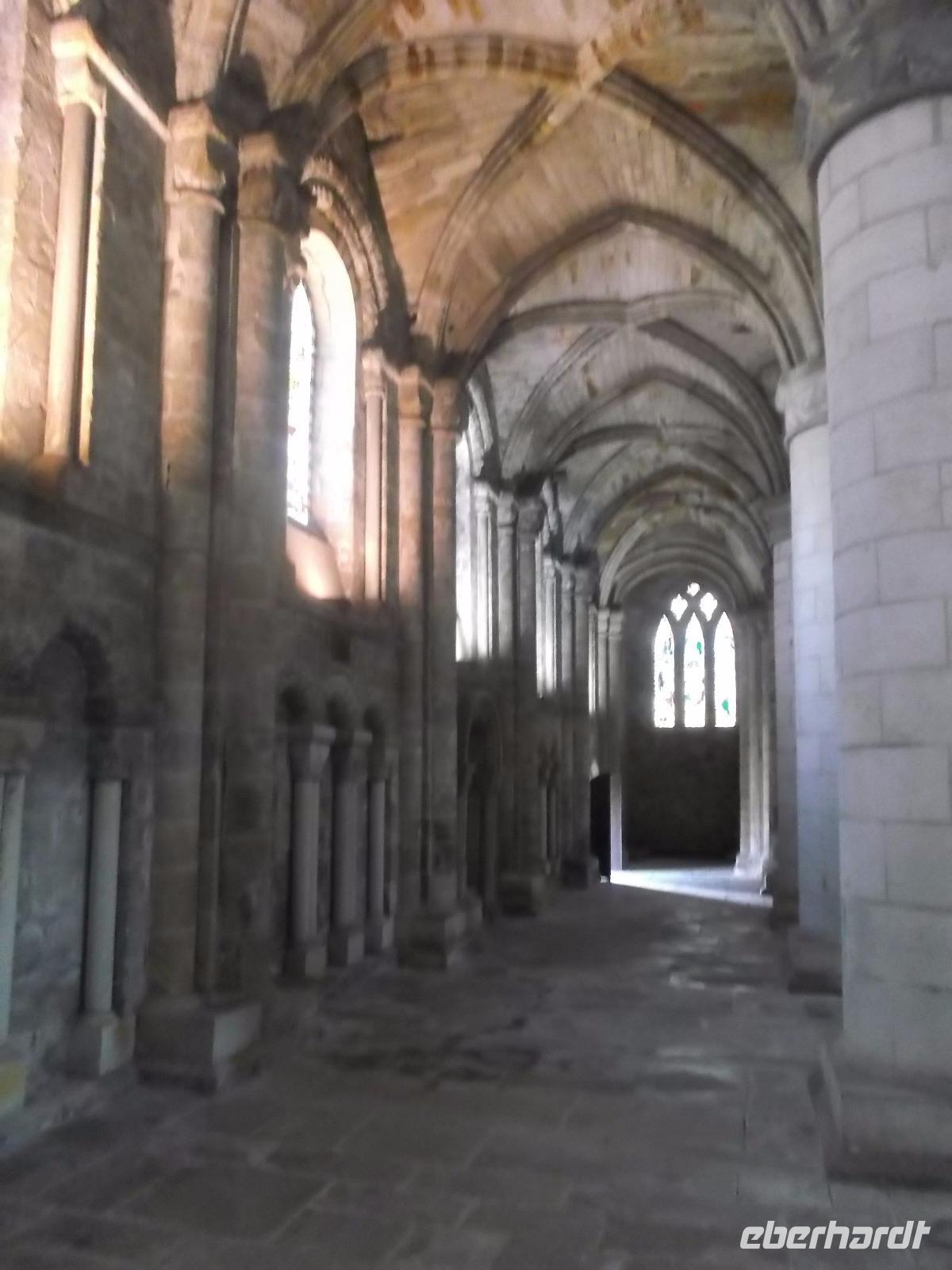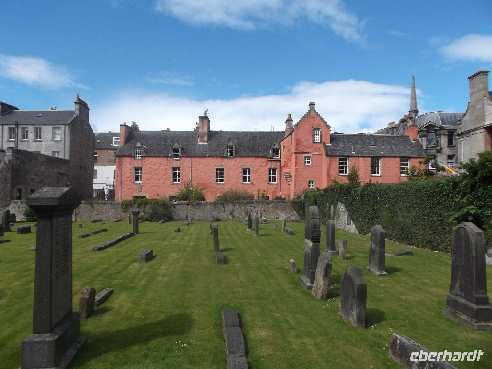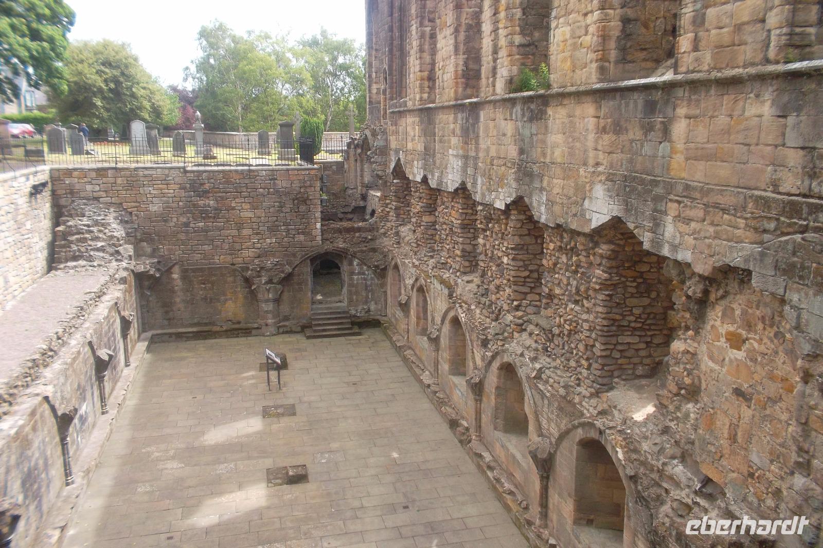Anschließend ging es weiter nach Dunfermline. Das war einmal eine der der alten schottischen Hauptstädte, und ihre Abtei beherbergt die Grablege von über 20 Königen und Königinnen - damit ist sie der größte schottische Königsfriedhof nach dem „heiligen" Reilig Odhrain auf der Hebrideninsel Iona. Die immer wieder umgebaute Abtei ist in ihrem historischen Kern noch romanisch und dieser Teil hat bis heute eine unerhörte Raumwirkung wenn man ihn nach dem Besuch des gotischen Anbaus besucht. Man gelangt hierher durch die Kapelle der im 13. Jahrhundert heiliggesprochenen schottischen Königin Margarete. Wuchtige Säulen tragen die obere Fensterreihe, die immer noch das Kennzeichen des Langhauses der Basilika ist, als der man die Abteikirche von Dunfermline einst baute. Direkt neben der Abtei steht der nur noch mit den Resten einer Mauer erhaltene Königspalast und vor dem Gebäudekomplex kann man noch das rosa verputzte Abtshaus aus dem 16. Jh. bewundern.