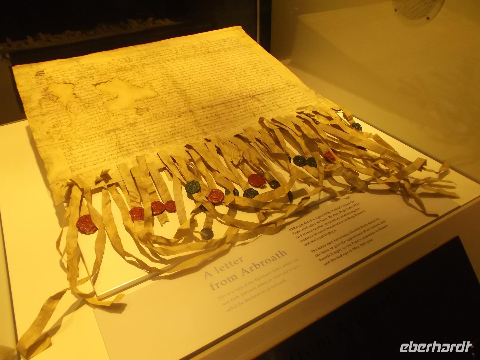 Unser nächstes Ziel war Arbroath, ein Ort besonderer historischer Bedeutung, der wegen seiner Sandsteinbauten mitunter als die „rote Stadt" bezeichnet wird. Die markante Abtei von Arbroath, im 12. Jahrhundert vom schottischen König gegründet und auf seinen Wunsch mit Benediktinermönchen aus der damals älteren Grenzabtei Kelso besetzt, ist ein wahres Kleinod. Zudem haben die Ruinen der Abtei neben ihrer Bedeutung als Kulturdenkmal und den Aspekten einer fotogenen Ruine große Wichtigkeit für die schottische Geschichte: In einer kleinen Sonderausstellung kann man eine Kopie der berühmten „Deklaration von Arbroath" („arbroath letters" oder auch „the declaration of Scottish Independence") bewundern. Dieses Dokument, 1320 hier im Kloster geschrieben und von hier an den Papst geschickt, ist nichts weniger als die Garantie schottischer Unabhängigkeit, denn daraufhin erkannte der Papst 1329 Schottlands Unabhängigkeit als unantastbare Autorität an. Schon 1314 hatte der schottische König Robert I. (Robert the Bruce) mit dem Sieg in der Schlacht von Bannockburn 1314 diese de facto erkämpft - aber mit der Arbroath-Deklaration wurde sie offiziell!