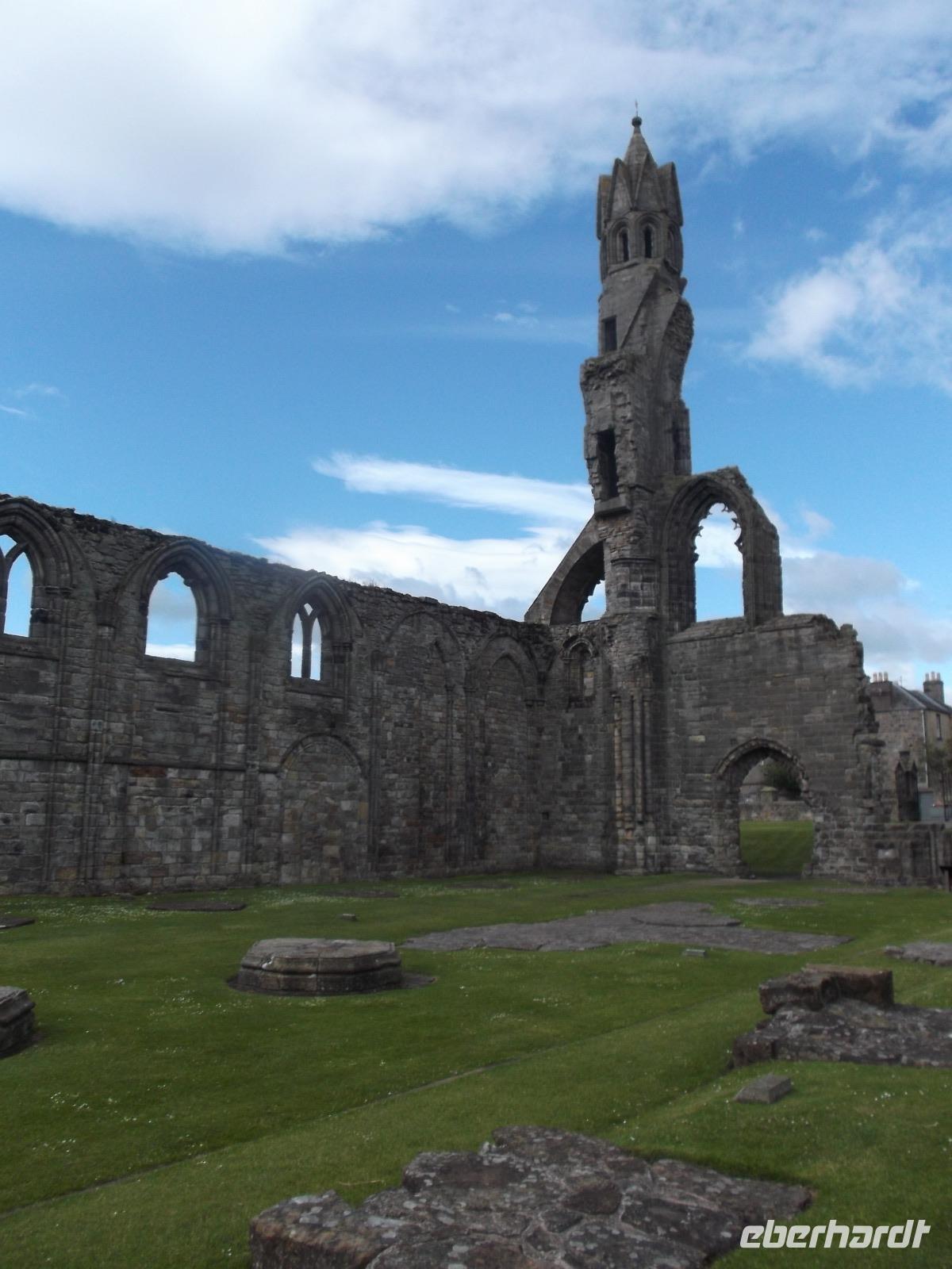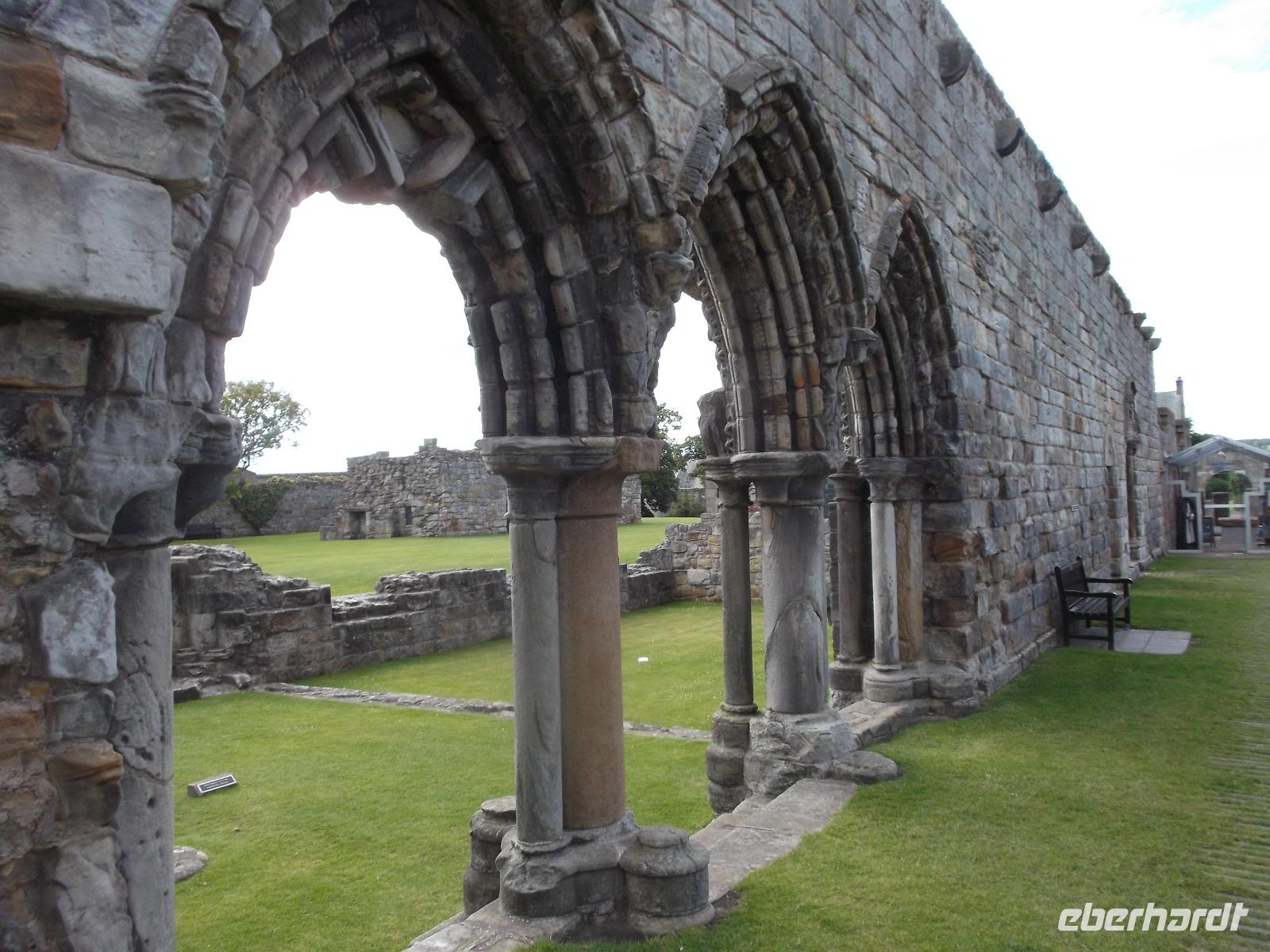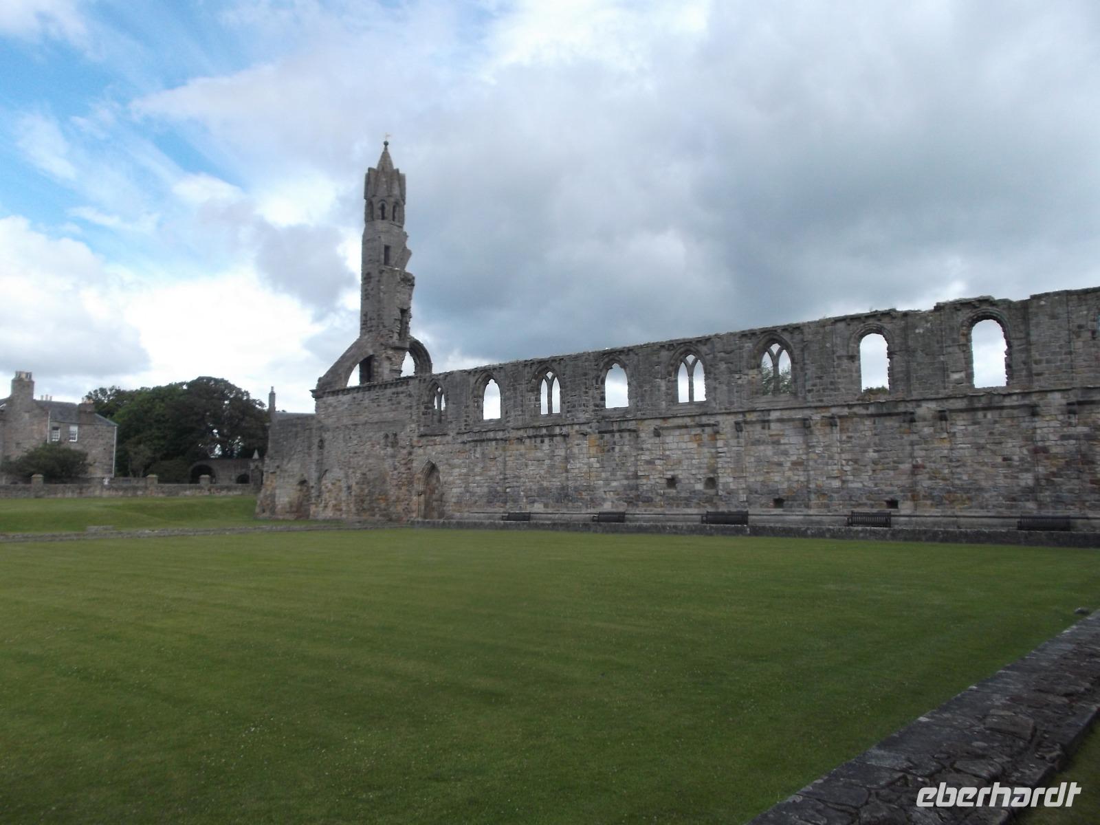 Einer ihrer wichtigsten Orte ist St. Andrews, die älteste, traditionellste und historisch wohl bedeutsamste der schottischen Universitätsstädte und gleichzeitig eine Hochburg des Golf-Sports. Der soll hier erfunden worden sein, wird immer wieder behauptet, aber selbst wenn das historisch nicht ganz korrekt ist, wurde er doch hier zumindest wiederentdeckt und trat dann von St. Andrews seinen Siegeszug an. Uns ging es aber vor allem darum, die bedeutende Kathedrale zu sehen, deren Ruine eindrucksvoll am Meer liegt. Es sind die Reste eines gewaltigen Sakralbaues, der durch seine schiere Größe - immer noch an den Grundmauern erkennbar - beeindruckt und in dem ursprünglich als Reliquien die Gebeine des Heiligen Andreas, des schottischen Nationalheiligen, aufbewahrt wurden. Von dieser Kirche, die schon im 10. Jh. Bischofssitz wurde, ging die schottische Nationalflagge - weißes Andreaskreuz auf blauem Grund - aus. Nach der Besichtigung der beeindruckenden Kirchenruine blieb noch etwas Zeit für einen Bummel im Städtchen, das in Sonntagsruhe dalag, und dann fuhren wir weiter an der Küste entlang.