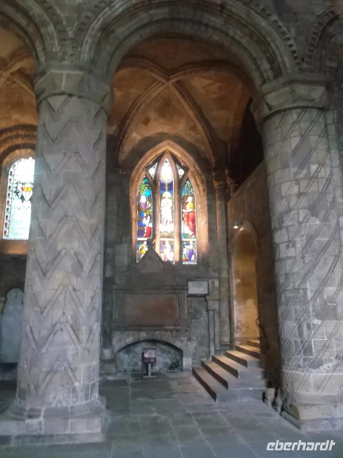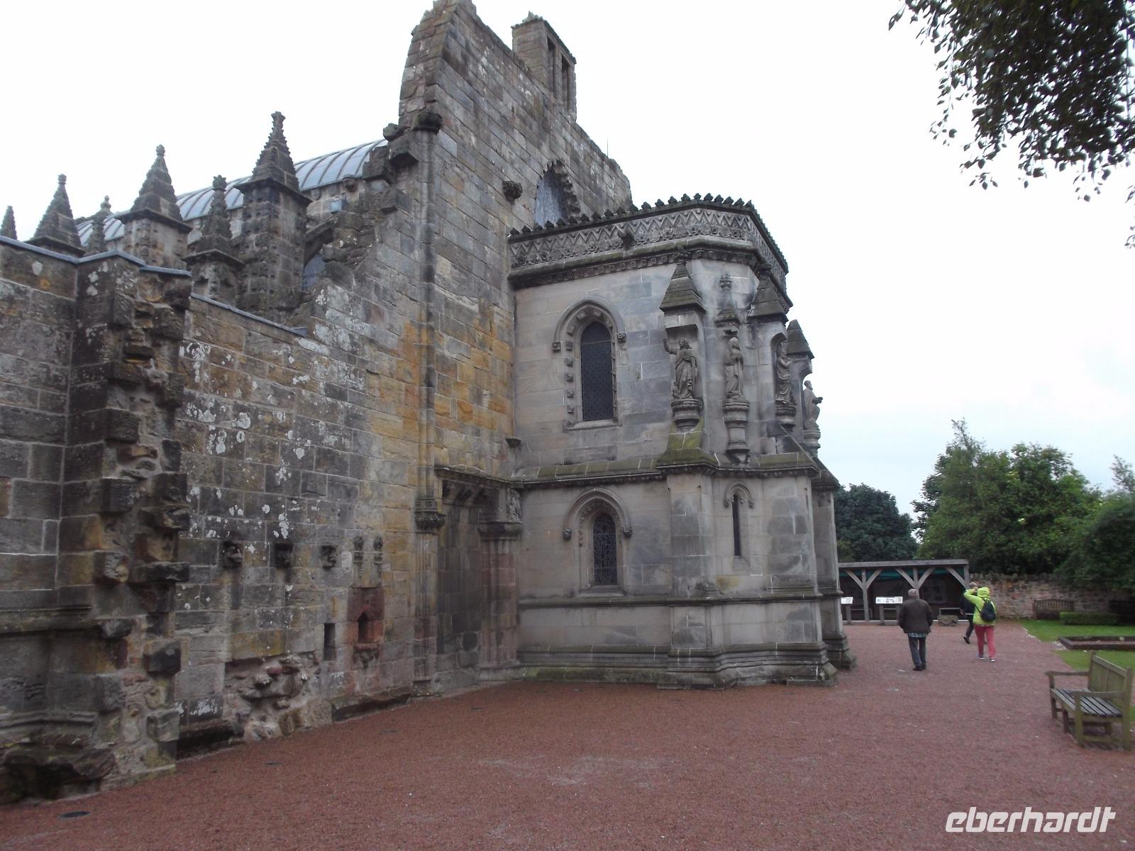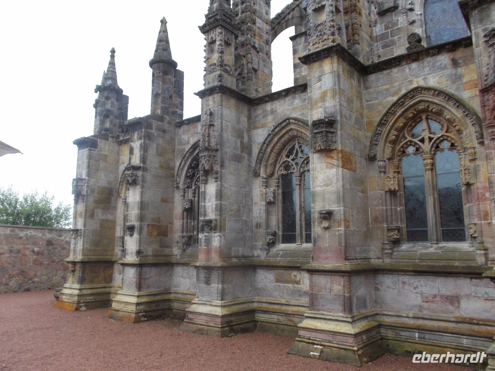 Ein weiterer Höhepunkt unserer Reise war die Besichtigung der mit herrlichen Steinmetzarbeiten verzierten und durch den Thriller-Autor Dan Brown und die Verfilmung seines Bestsellers „Der da Vinci-Code" weltweit bekannt gewordene Roslyn Chapel. Wir konnten nicht klären, ob sie tatsächlich der Aufbewahrungsort für den Heiligen Gral ist, aber die ungeheuer reich dekorierte aus dem 15. Jahrhundert stammende Kapelle ist auf jeden Fall etwas ganz Besonderes. Ob die Glasmalereien der Fenster, die filigranen Steinmetzarbeiten der Fensterrahmungen oder die herrlich verzierten Säulen - geheimnisumwobene Symbolik, die durchaus an die legendären Tempelritter erinnert, findet sich hier überall.
