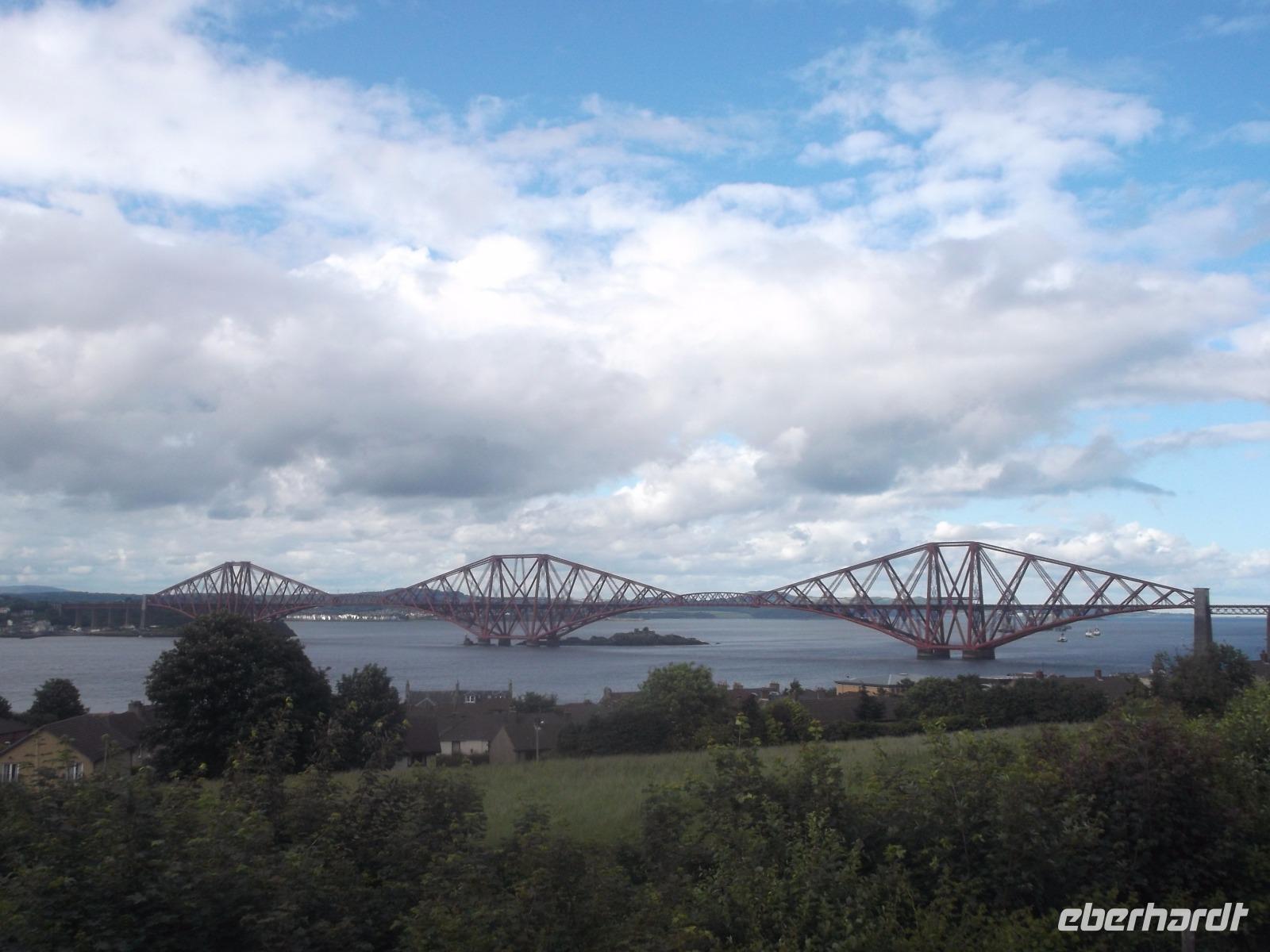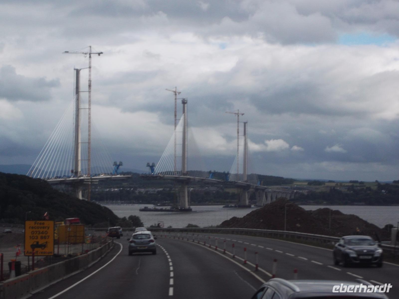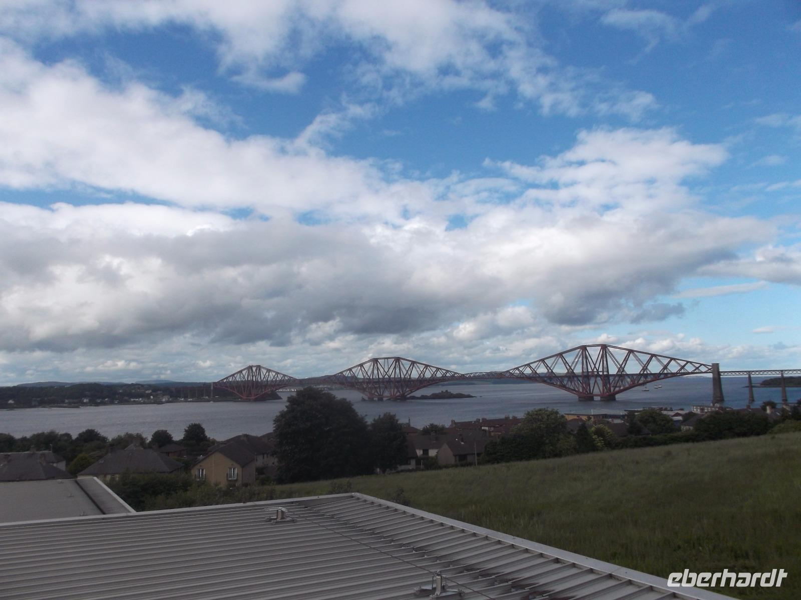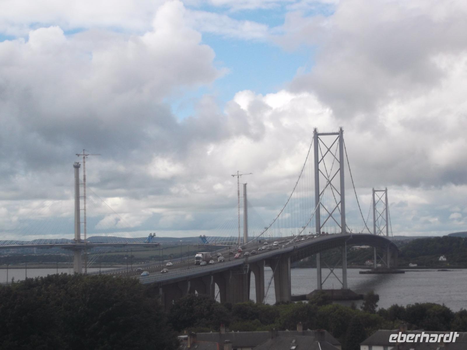 Weiter ging es dann nach Edinburgh, mit Unterbrechung für einen Fotostopp an den Forth-of-Forth-Bridges. Besonders markant ist die Eisenbahnbrücke, die 1890 in Dienst gestellt wurde. Noch heute ist sie eine ingenieurtechnische Meisterleistung und die Formen ihrer Fachwerk-Stahlbögen sind weltweit bekannt. Einst war sie die weltgrößte Brücke ihrer Art, in der mehr als 54.000 Tonnen Stahl verbaut wurden, um sie auf über zwei Kilometer Länge in 50 m Höhe über den Firth of Forth zu führen. Auch die danebenliegende Straßenbrücke, seit 1964 in Betrieb und die längste Großbritanniens, ist sehenswert und die Baustelle der neuen Brücke, die wohl 2017 fertig werden soll, konnten wir ebenfalls fotografieren. Nach unserem Fotostopp fuhren wir zu unserem Hotel in einem Vorort von Edinburgh.