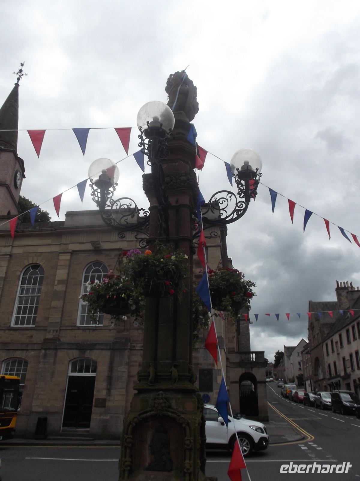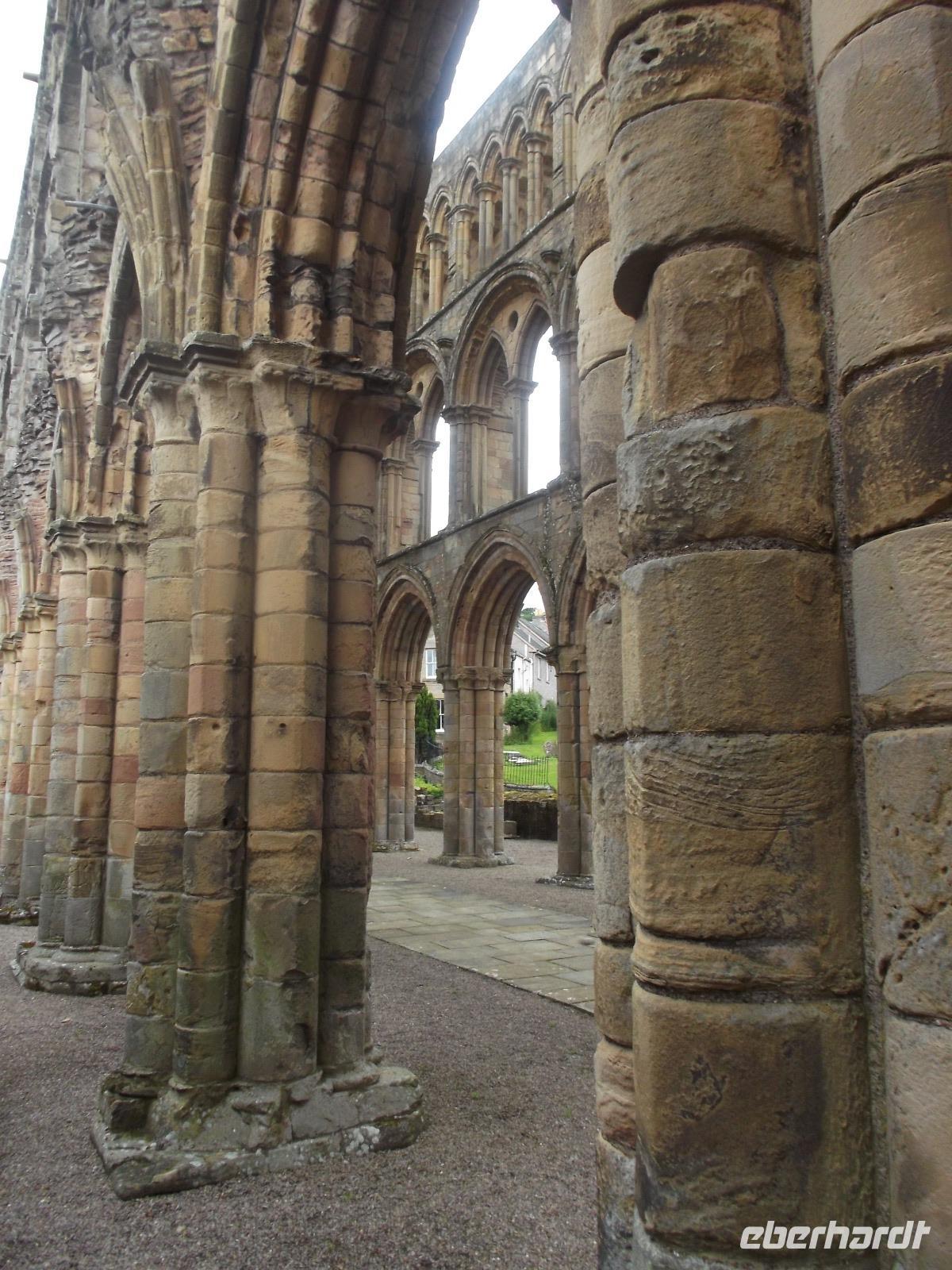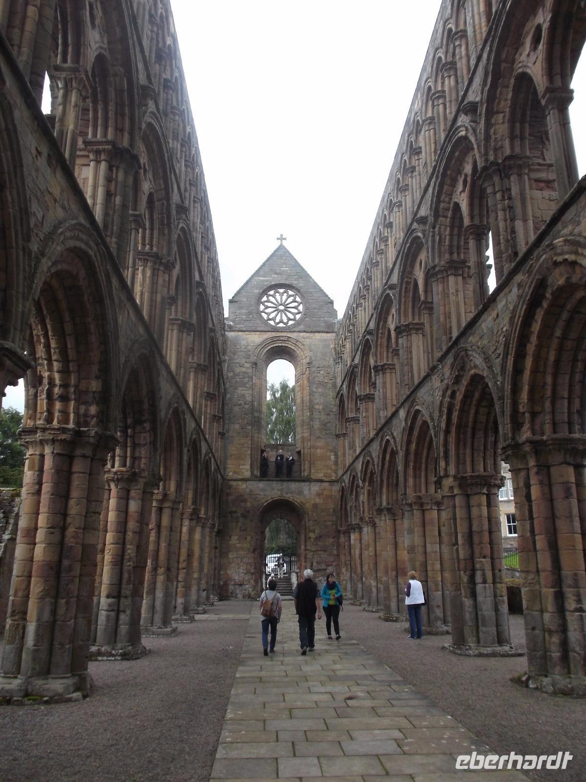 Weiter ging es ins Grenzstädtchen Jedburgh. Hier gibt es eine „Wollmühle", wie die großen Souvenir-Shops genannt werden und wir konnten uns frisch machen und das „Schottland-Abschluss-Shopping" einlegen, um letzte Souvenirs oder noch eine seltene Flasche Whisky zu kaufen. Die gewaltige Abteiruine von Jedburgh war der letzte Programmpunkt unserer Reise. Stolz, vornehm und irgendwie wuchtig fügt sich die Ruine über dem Fluß aufragend in die Landschaft ein. Ihre noch gut wahrnehmbare Raumwirkung, die gut erhaltene regelmäßige Fensterrose in der Westfassade und ihr bemerkenswerter romanisch-gotischer Übergangsstil machen sie zu einem schönen Fotomotiv. Wir hatten hier Zeit für einen interessanten Rundgang und dann auch noch Freizeit für einen Bummel in der Jedburgher Altstadt. Die wartet mit einem altem Gefängnis, einem historischen Marktkreuz und einem Haus auf, in dem sich die berühmte letzte Schottenkönigin Maria Stuart vor ihrtem unglücklichen Übergang nach England, wo Elisabeth I. sie gefangennehmen ließ, aufgehalten hat.