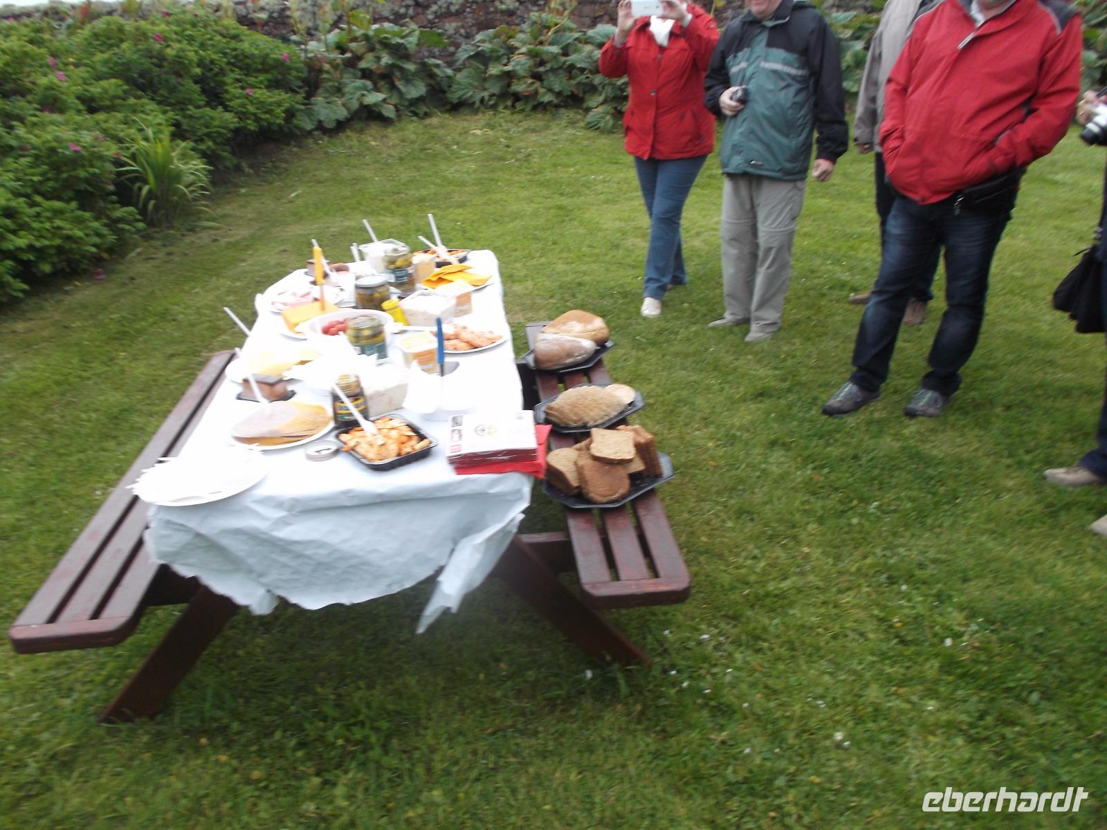 Das Wetter hatte sich gebessert, es klarte auf und gab keinen Regen mehr - und da Buschauffeur Arnold und ich am Vortag die Freizeit in Lerwick genutzt hatten, um für ein Picknick einzukaufen, wollten wir den hinter dem Tangwick Haa Museum liegenden Picknickplatz nutzen. Während unsere Gäste sich die Museumsräume ansahen, fuhren wir rasch zur nächsten Ansiedlung und kauften frisches Brot im „community-.shop". Nach der Rückkehr war rasch auf dem hübschen Picknickplatz der Tisch genutzt und mit allerlei Spezialitäten gedeckt - guten Appetit zu einem ausgiebigen Picknick, zu dem es sogar Rotwein gab.