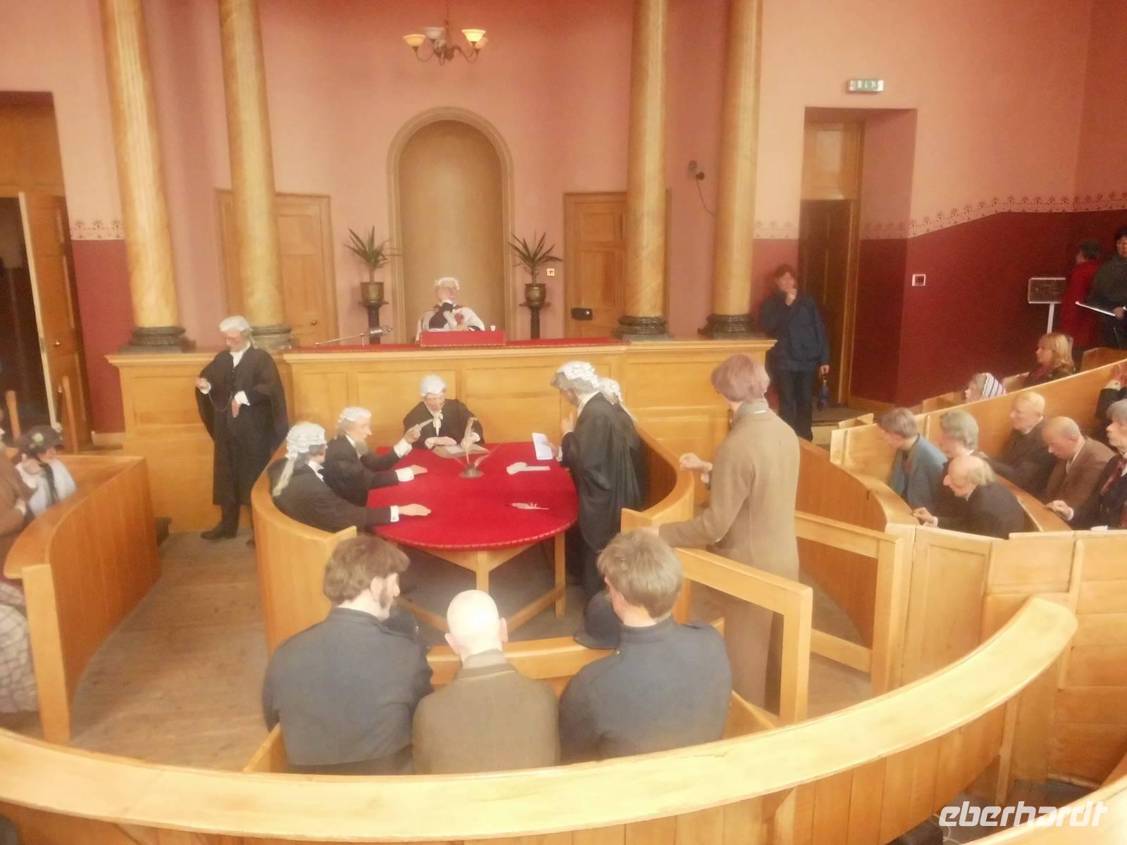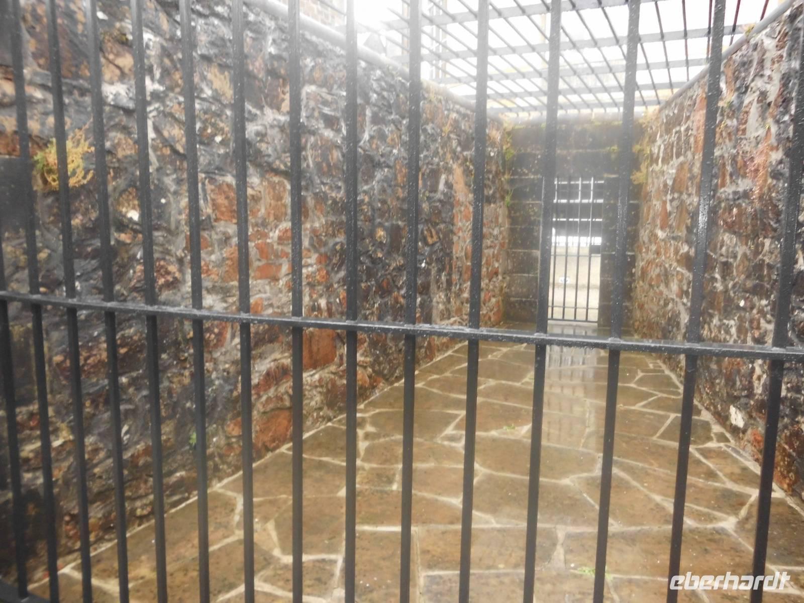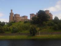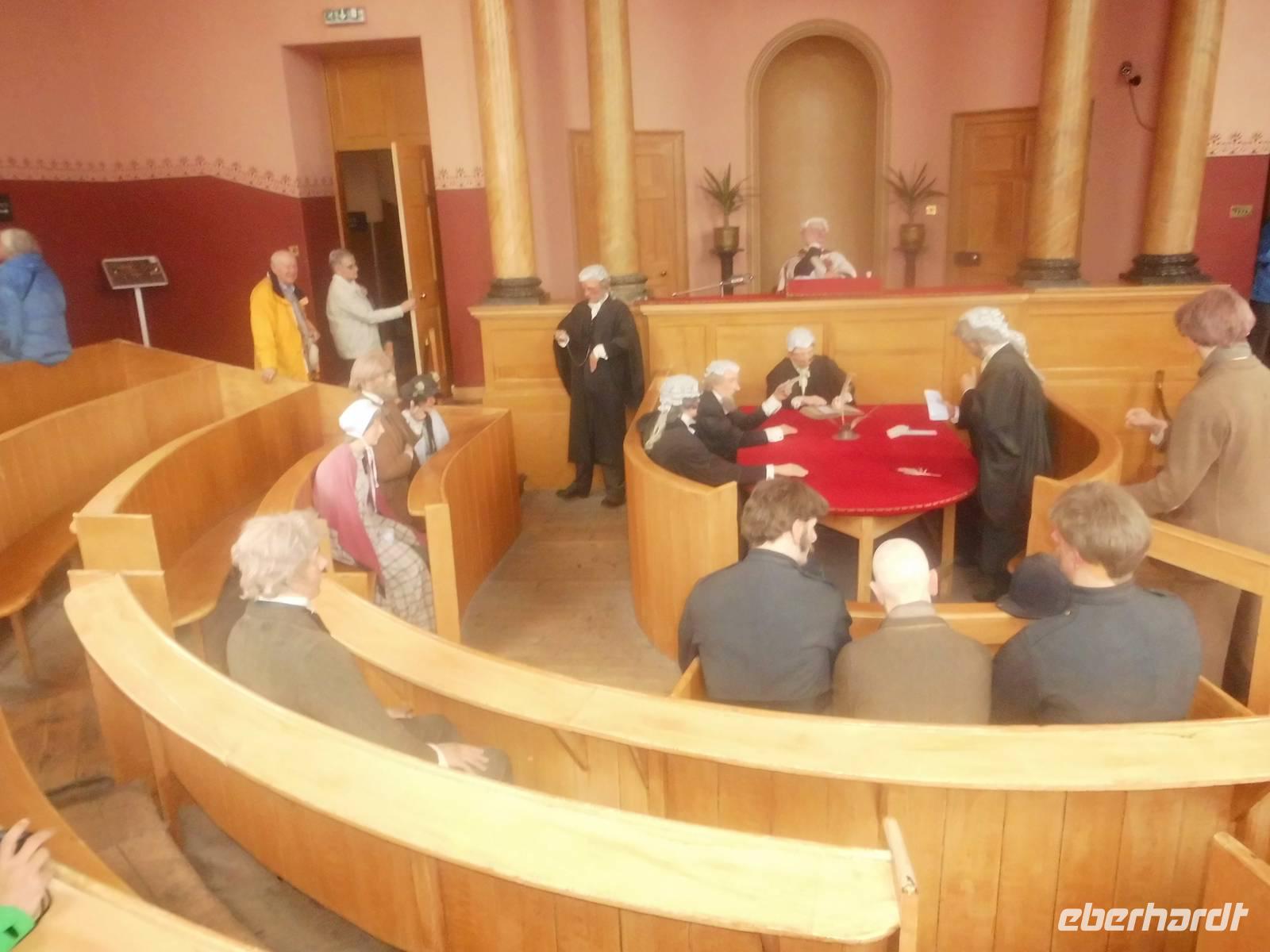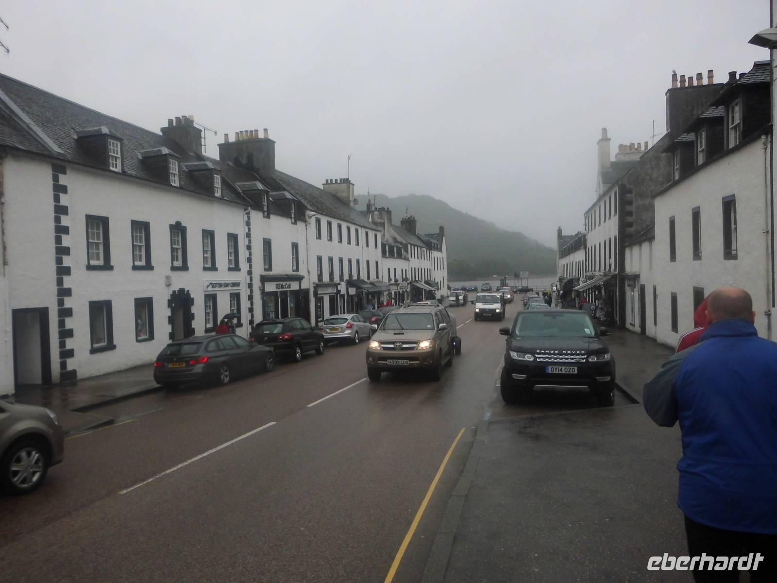 Weiter ging es durch die Wälder der Highlands zu einer der kleinsten schottischen Städte. Inveraray hat nur etwa 500 Einwohner, liegt am Ende des Loch Fyne, einer fjordartig eingeschnittenen Atlantikbucht und ist mit seinen weißgetünchten Häusern und der Gesamtanlage der Meeresfront ein wirkliches Kleinod. Die Gebäude im Georgianischen Stil sind mit dem in Westschottland üblichen Harl verputzt - einem sehr wetterbeständigen Rauhputz aus Lehm mit kleinen Kieselsteinen - und dann weiß gekalkt. Das sicherlich interessanteste Gebäude ist das alte Gefängnis, heute ein Museum. Wir besichtigten diesen Bau, in dem die Geschichte schottischer Justiz erzählt und an verschiedenen Beispielen anschaulich erläutert wird. So kann man sich im authentisch hergerichteten Gerichtssaal, den teilweise Wachspuppen bevölkern und den die Geräusche und Reden einer Verhandlung eingespielt werden, direkt neben die Zuschauerpuppen setzen und andächtig die Verhandlung mitverfolgen. Die Zellen , äußerst spärlich ausgestattet, kann man ebenso besichtigen wie den großen „Käfig" im Innenhof, der zum Frischluftschnappen - wenige Minuten pro Tag - für die Häftlinge diente. Selbst ein Wärter in Uniform posiert in den alten Räumlichkeiten.