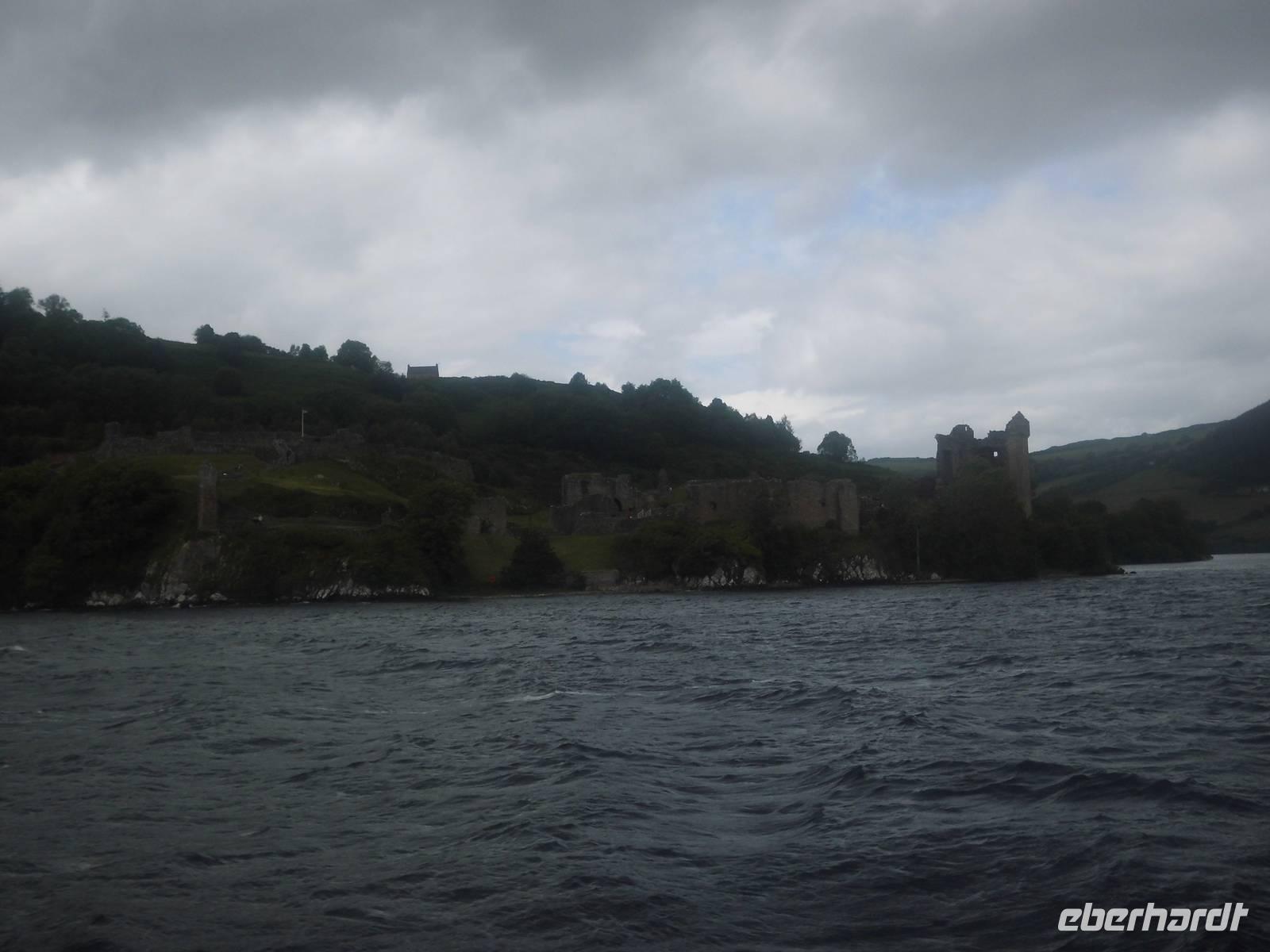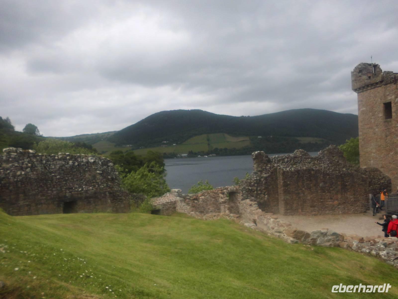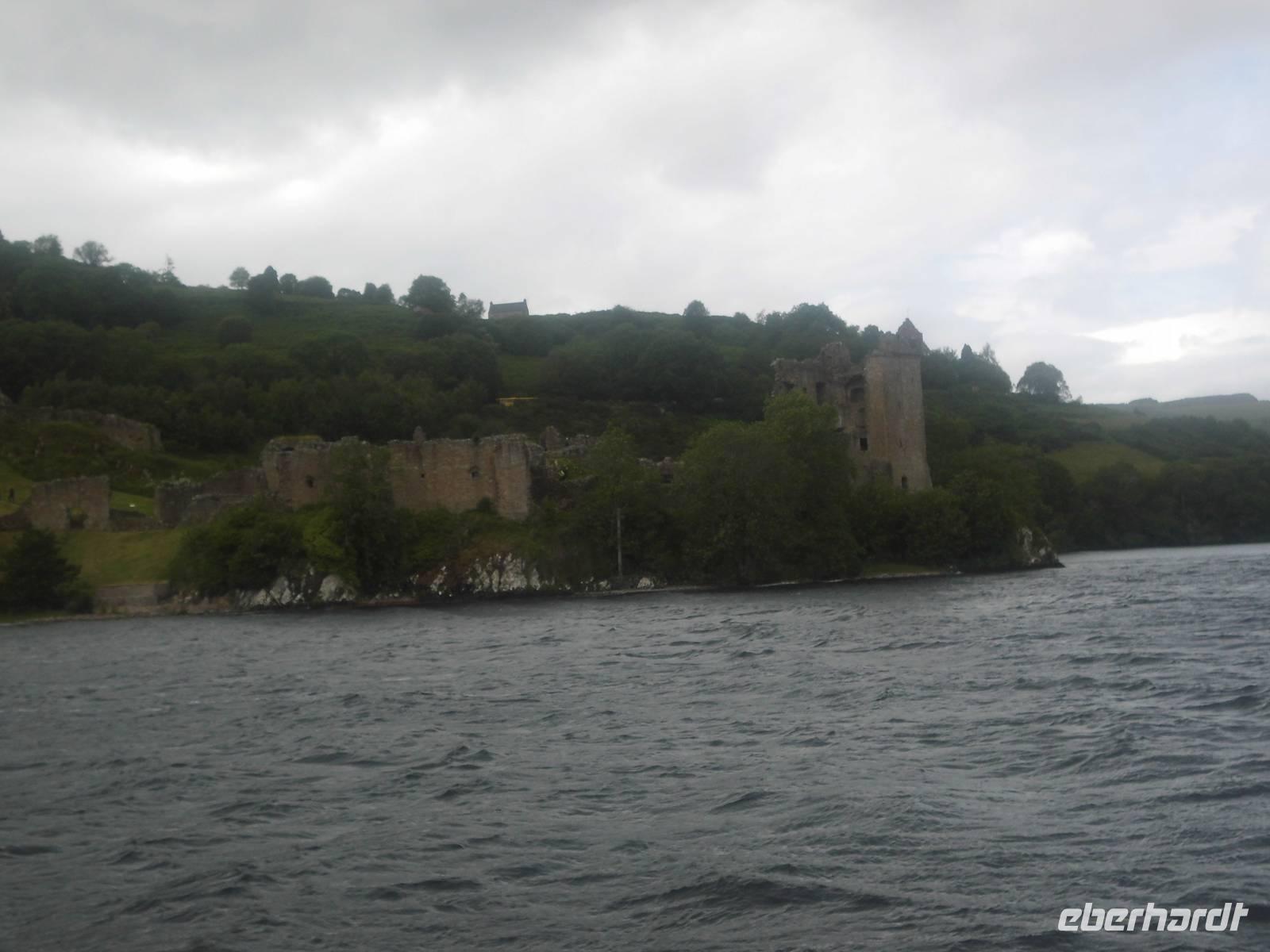 Seeoberfläche wirkt abweisend und geheimnisvoll - der Stoff, aus dem Legenden sind! Unsere Hoffnungen, das Original-Monster mal kurz zu sehen wurden aber enttäuscht, bis auf die Wellen im See sahen wir nichts. Ein kleines Nessie-Foto im Hafen war aber möglich, denn die Nachbildung eines Plesio-Sauriers steht hier als Modell, da die meisten Menschen sich das Ungeheuer von Loch Ness als Saurier vorstellen. Unseren Ausstieg nach der halbstündigen Bootsfahrt hatten wir an der Burgruine Urquardt Castle, die zu den malerischsten und meistbesuchten Burgruinen Schottlands gehört. Einst wichtiger Stützpunkt der schottischen Könige, war sie einige Zeit auch Verwaltungssitz des „norwegischen" Teils von Schottland. Die aus dem 13. Jahrhundert stammende Burg war lange Zeit wichtig, wurde aber nach Verlust dieser Bedeutung Ende des 17. Jahrhunderts endgültig verlassen.