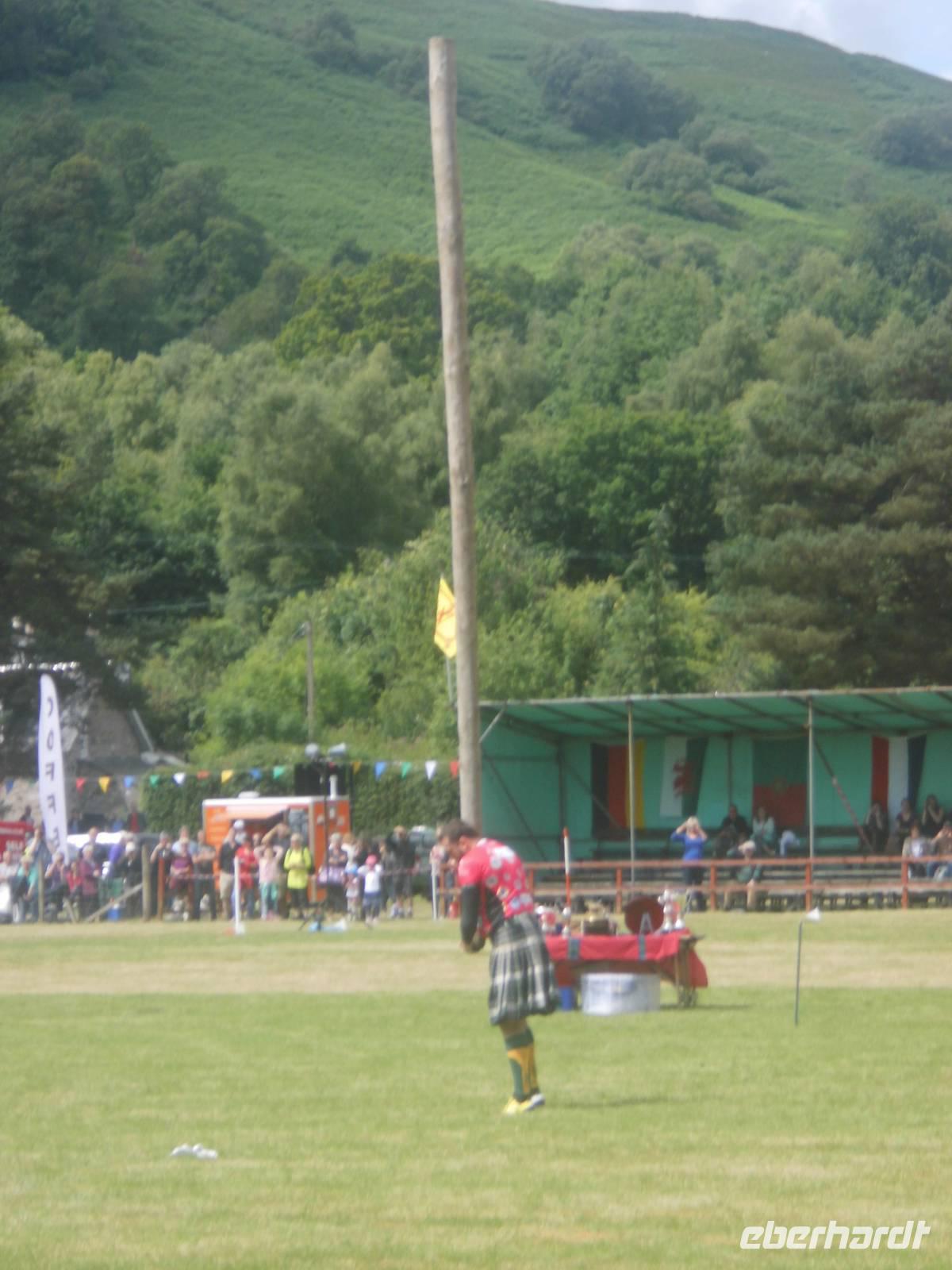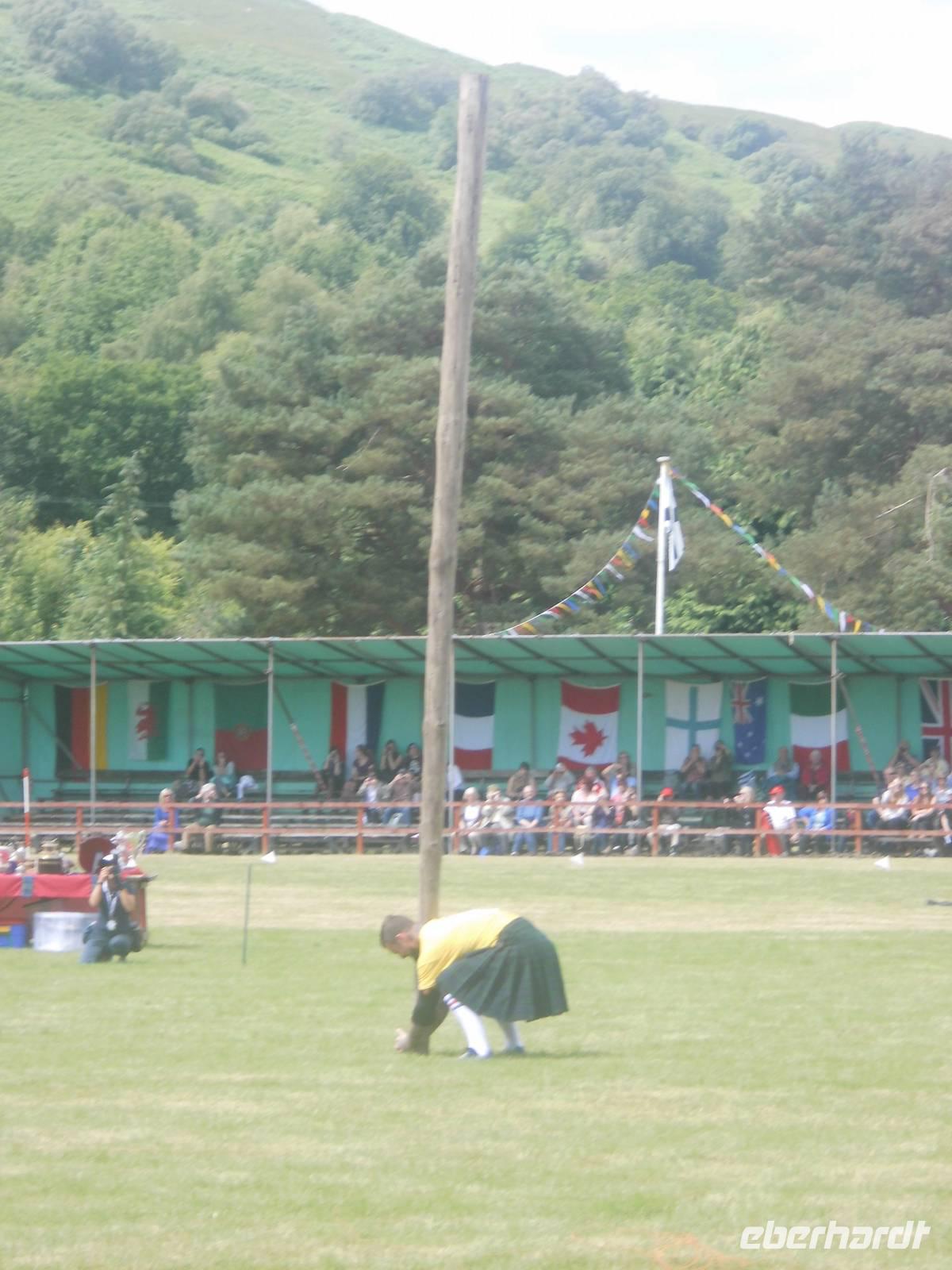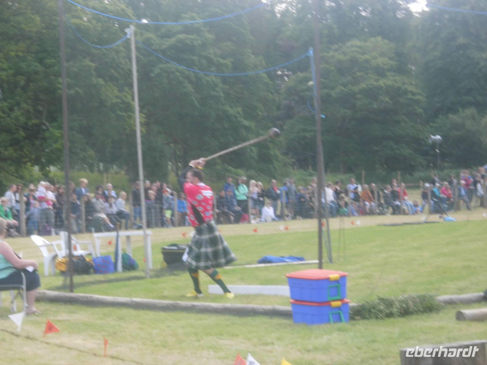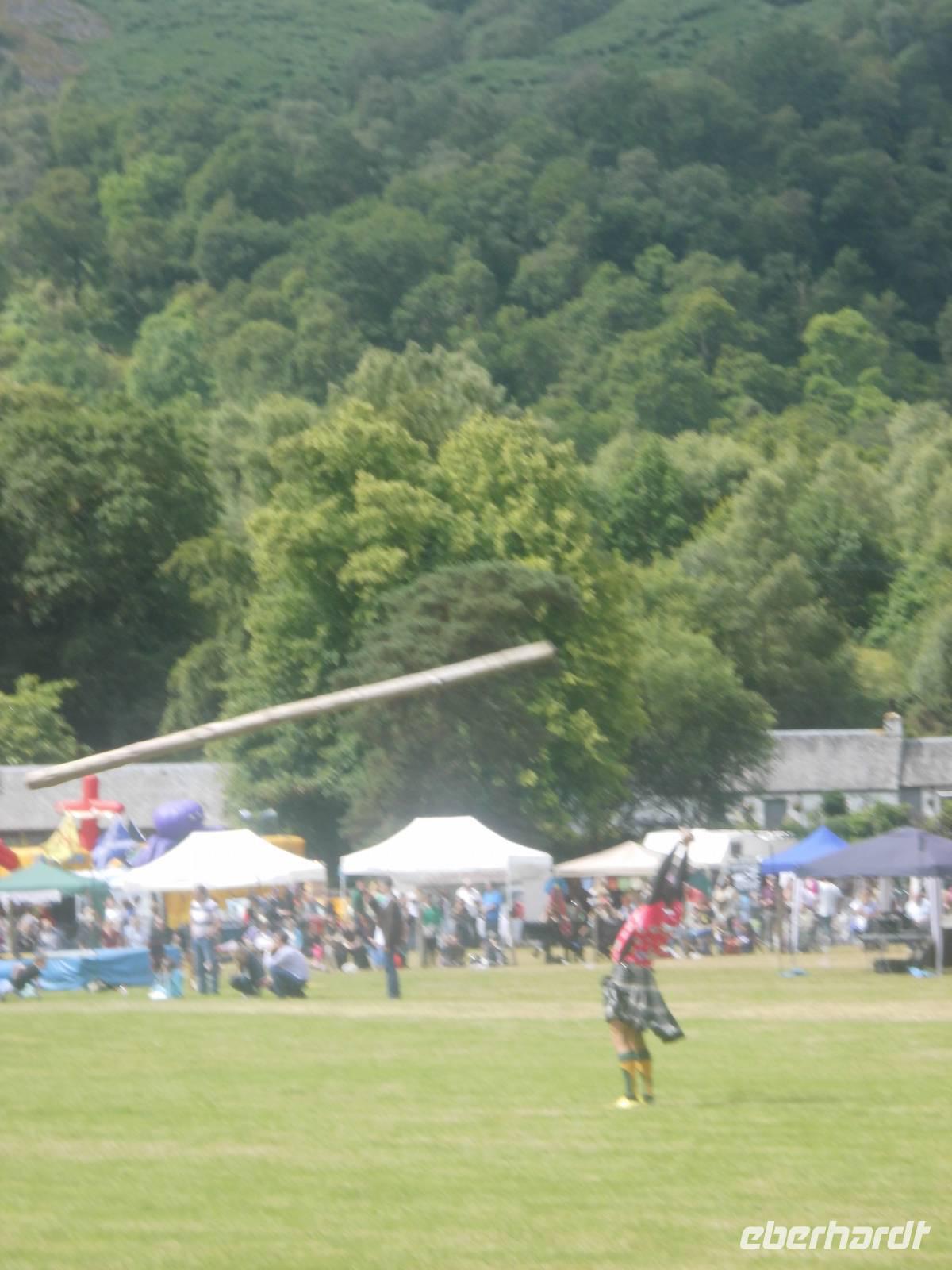 Als wir auf dem großen Parkplatz eintrafen, war schon reger Betrieb. Kurz vor der Eröffnung der Spiele bereitete sich eine Dudelsackkapelle auf ihren gleich zu erwartenden Einsatz vor. Es war alles genauso wie erhofft: wir waren „mittendrin statt nur dabei" und konnten nach Herzenslust Fotos machen. Als Clanchef Sir Malcolm Colquhoun eintraf, begann die Helensburgh Clan Colquhoun Pipe Band mit ihren Trommeln und Dudelsäcken und führten einen Marsch durch das Dörfchen Luss an - wir mittendrin! Einen Stopp und zwei Musiktitel gab es am kleinen Hafen, wo Loch Lomond-Boote mitunter an- und ablegen und dann zogen wir weiter unter klingendem Spiel zum Festplatz. Nach kurzem Anstehen war der Eintritt entrichtet und wir konnten uns ins Gewimmel stürzen. Zwar waren auch hier viele Menschen, aber der Andrang an Bars und „Fressbuden" war lange nicht so groß, wie er bei der Schlachtnachstellung in Bannockburn gewesen war. Schön übersichtlich angeordnet konnten wir uns für Zusehen und Fotografieren an den unterschiedlichsten Wettkampforten entscheiden: hier gab es eine Bühne, auf der die kleinen Mädchen - sogar die unter 6jährigen! In schottischen Kostümen traditionelle Tänze aufführten, während Kinder in Wettrennen und Weitsprung übten. An anderer Stelle verglichen sich die Schwerathleten im Wurf des „Schottischen Hammers" mit langem Stiel und dann schließlich fand auch der vielleicht spektakulärste Wettkampf statt: das Baumstammwerfen. Ein schwerer, telefonmastgroßer Stamm muss dabei über seine Längsachse kippen und in möglichst gerader Lage landen. Es war ganz erstaunlich, wie die Athleten im Schottenrock das meisterten - einigen gelangen tatsächlich spektakuläre Baumstammwürfe.