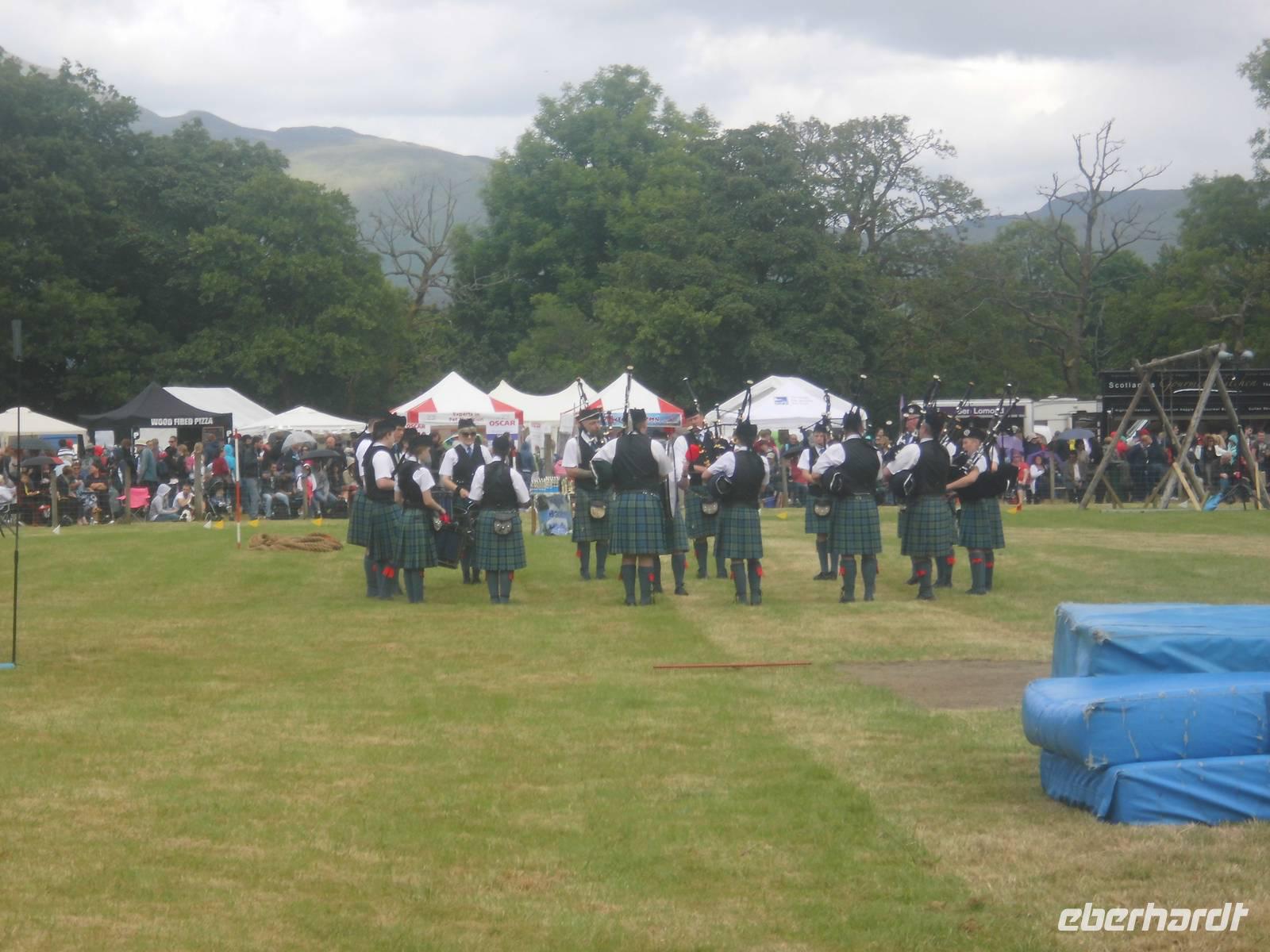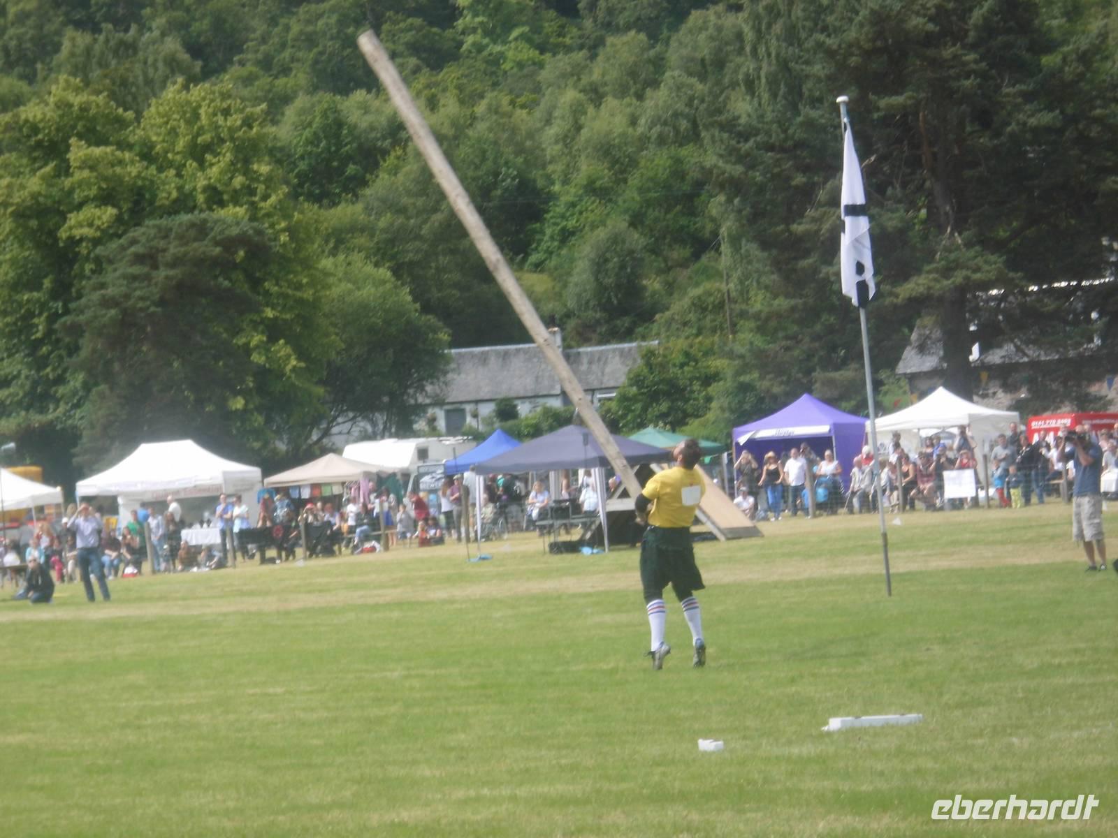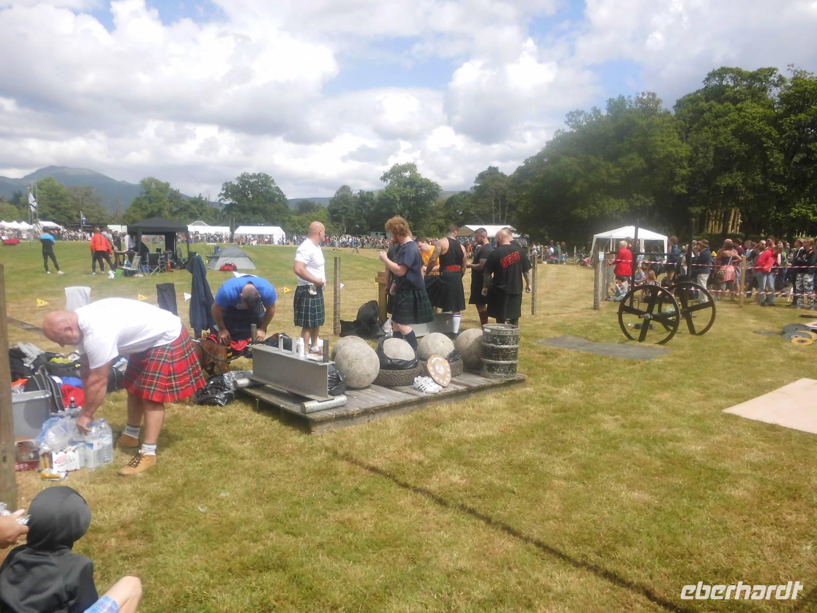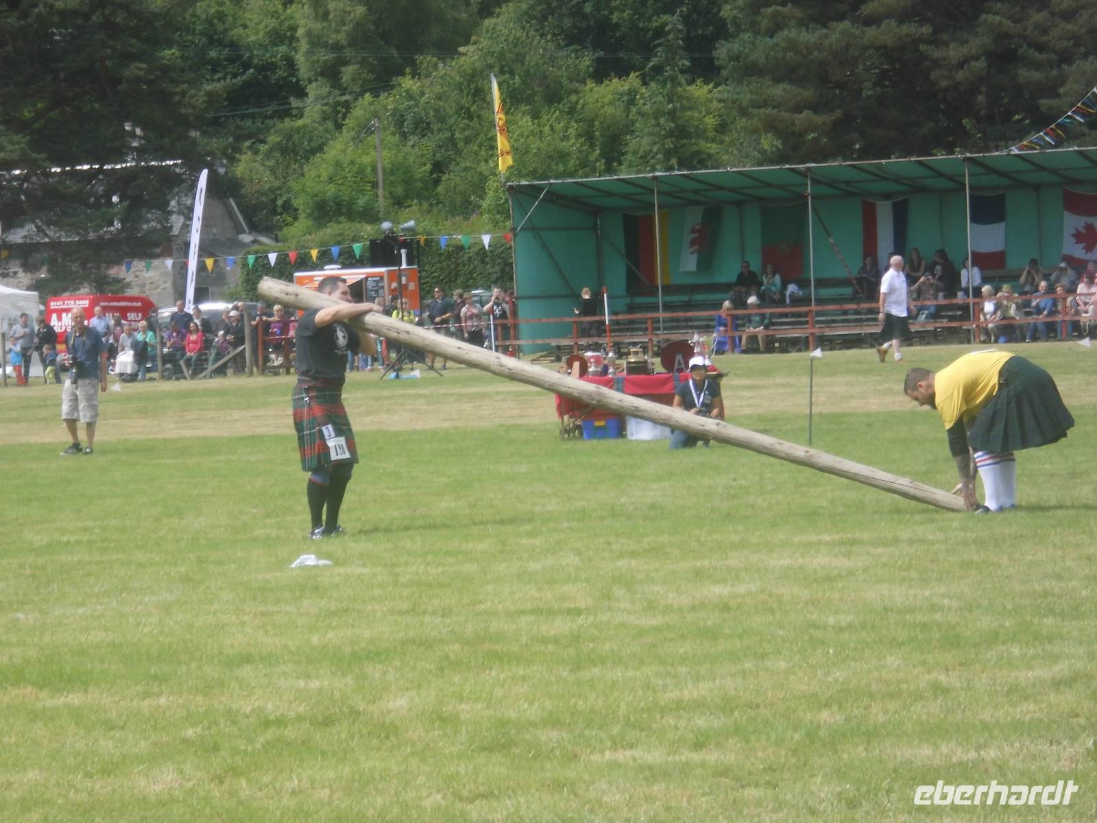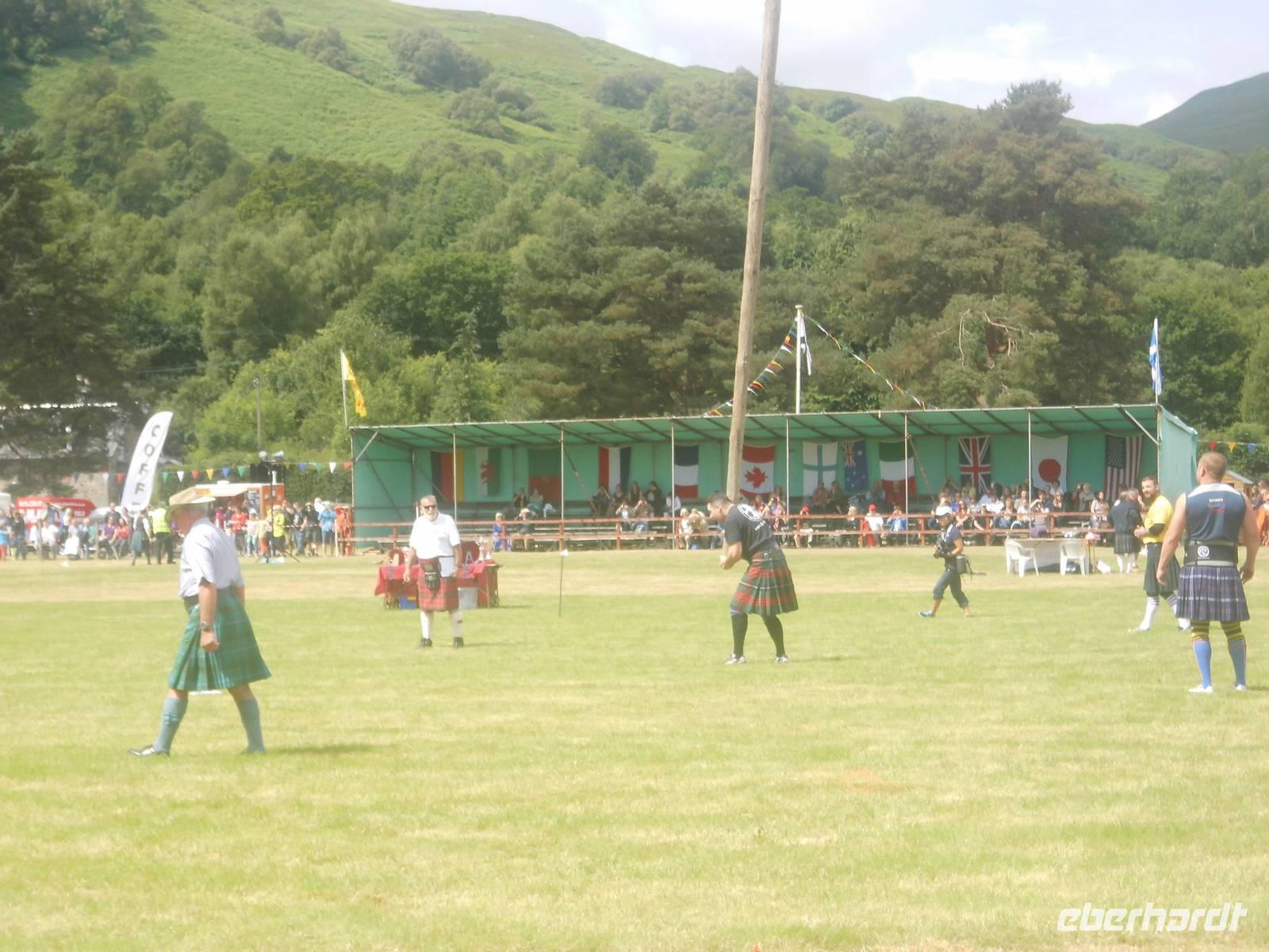 Als wir auf dem großen Parkplatz eintrafen, war schon reger Betrieb. Kurz vor der Eröffnung der Spiele bereitete sich eine Dudelsackkapelle auf ihren gleich zu erwartenden Einsatz vor. Es war alles genauso wie erhofft: wir waren „mittendrin statt nur dabei" und konnten nach Herzenslust Fotos machen. Als Clanchef Sir Malcolm Colquhoun eintraf, begann die Helensburgh Clan Colquhoun Pipe Band mit ihren Trommeln und Dudelsäcken und führten einen Marsch durch das Dörfchen Luss an - wir mittendrin! Einen Stopp und zwei Musiktitel gab es am kleinen Hafen, wo Loch Lomond-Boote mitunter an- und ablegen und dann zogen wir weiter unter klingendem Spiel zum Festplatz. Nach kurzem Anstehen war der Eintritt entrichtet und wir konnten uns ins Gewimmel stürzen. Zwar waren auch hier viele Menschen, aber der Andrang an Bars und „Fressbuden" war lange nicht so groß, wie er bei der Schlachtnachstellung in Bannockburn gewesen war. Schön übersichtlich angeordnet konnten wir uns für Zusehen und Fotografieren an den unterschiedlichsten Wettkampforten entscheiden: hier gab es eine Bühne, auf der die kleinen Mädchen - sogar die unter 6jährigen! In schottischen Kostümen traditionelle Tänze aufführten, während Kinder in Wettrennen und Weitsprung übten. An anderer Stelle verglichen sich die Schwerathleten im Wurf des „Schottischen Hammers" mit langem Stiel und dann schließlich fand auch der vielleicht spektakulärste Wettkampf statt: das Baumstammwerfen. Ein schwerer, telefonmastgroßer Stamm muss dabei über seine Längsachse kippen und in möglichst gerader Lage landen. Es war ganz erstaunlich, wie die Athleten im Schottenrock das meisterten - einigen gelangen tatsächlich spektakuläre Baumstammwürfe.
