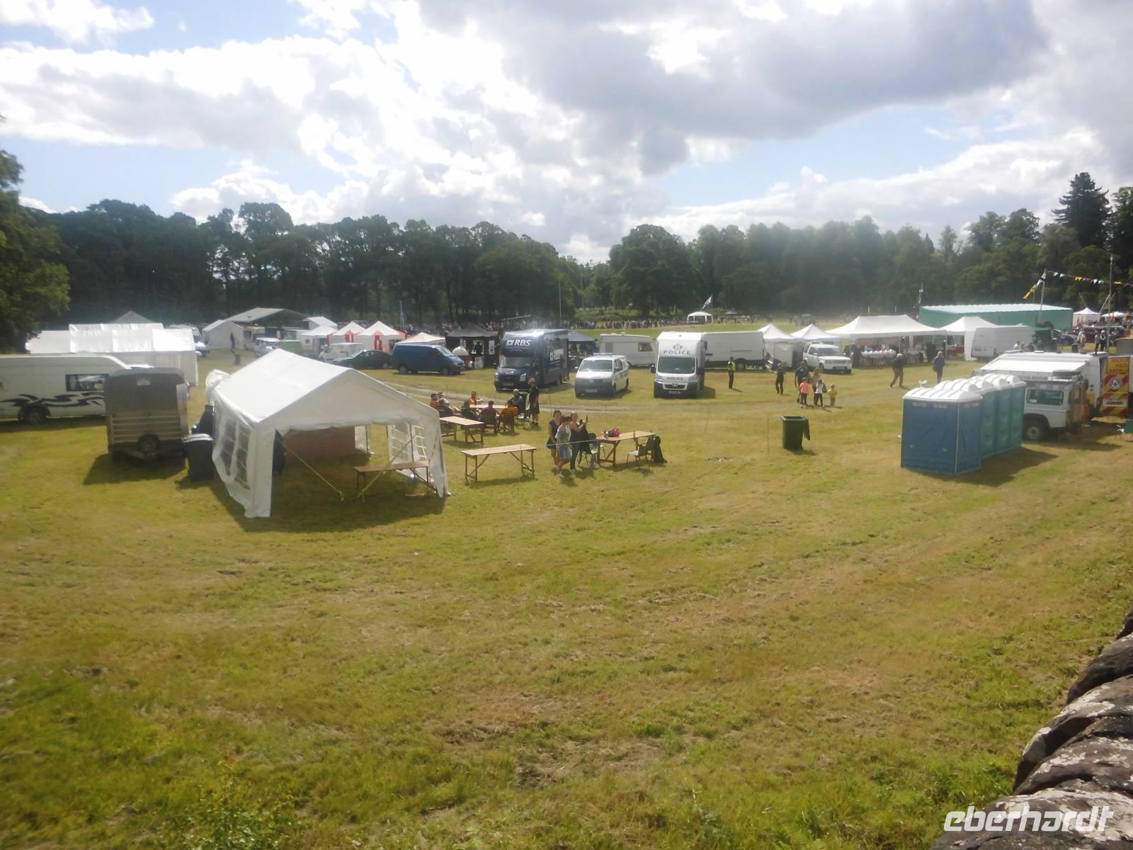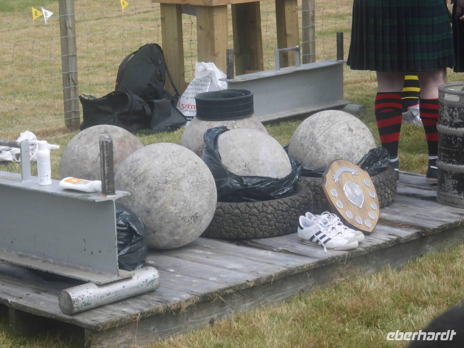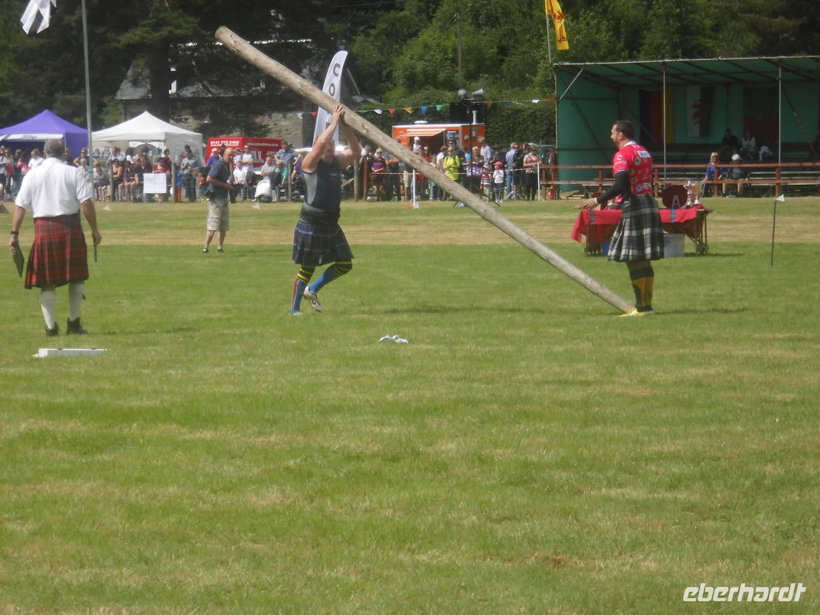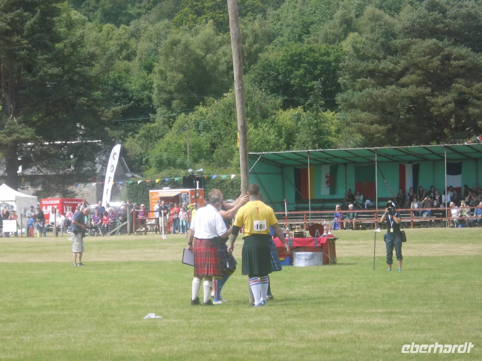 Als wir auf dem großen Parkplatz eintrafen, war schon reger Betrieb. Kurz vor der Eröffnung der Spiele bereitete sich eine Dudelsackkapelle auf ihren gleich zu erwartenden Einsatz vor. Es war alles genauso wie erhofft: wir waren „mittendrin statt nur dabei" und konnten nach Herzenslust Fotos machen. Als Clanchef Sir Malcolm Colquhoun eintraf, begann die Helensburgh Clan Colquhoun Pipe Band mit ihren Trommeln und Dudelsäcken und führten einen Marsch durch das Dörfchen Luss an - wir mittendrin! Einen Stopp und zwei Musiktitel gab es am kleinen Hafen, wo Loch Lomond-Boote mitunter an- und ablegen und dann zogen wir weiter unter klingendem Spiel zum Festplatz. Nach kurzem Anstehen war der Eintritt entrichtet und wir konnten uns ins Gewimmel stürzen. Zwar waren auch hier viele Menschen, aber der Andrang an Bars und „Fressbuden" war lange nicht so groß, wie er bei der Schlachtnachstellung in Bannockburn gewesen war. Schön übersichtlich angeordnet konnten wir uns für Zusehen und Fotografieren an den unterschiedlichsten Wettkampforten entscheiden: hier gab es eine Bühne, auf der die kleinen Mädchen - sogar die unter 6jährigen! In schottischen Kostümen traditionelle Tänze aufführten, während Kinder in Wettrennen und Weitsprung übten. An anderer Stelle verglichen sich die Schwerathleten im Wurf des „Schottischen Hammers" mit langem Stiel und dann schließlich fand auch der vielleicht spektakulärste Wettkampf statt: das Baumstammwerfen. Ein schwerer, telefonmastgroßer Stamm muss dabei über seine Längsachse kippen und in möglichst gerader Lage landen. Es war ganz erstaunlich, wie die Athleten im Schottenrock das meisterten - einigen gelangen tatsächlich spektakuläre Baumstammwürfe.