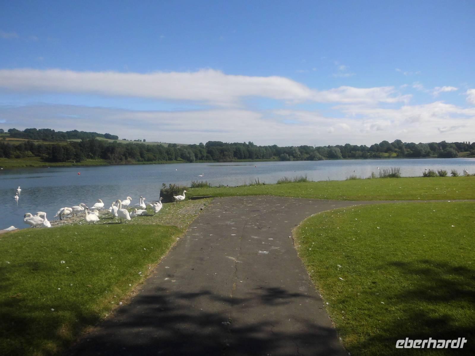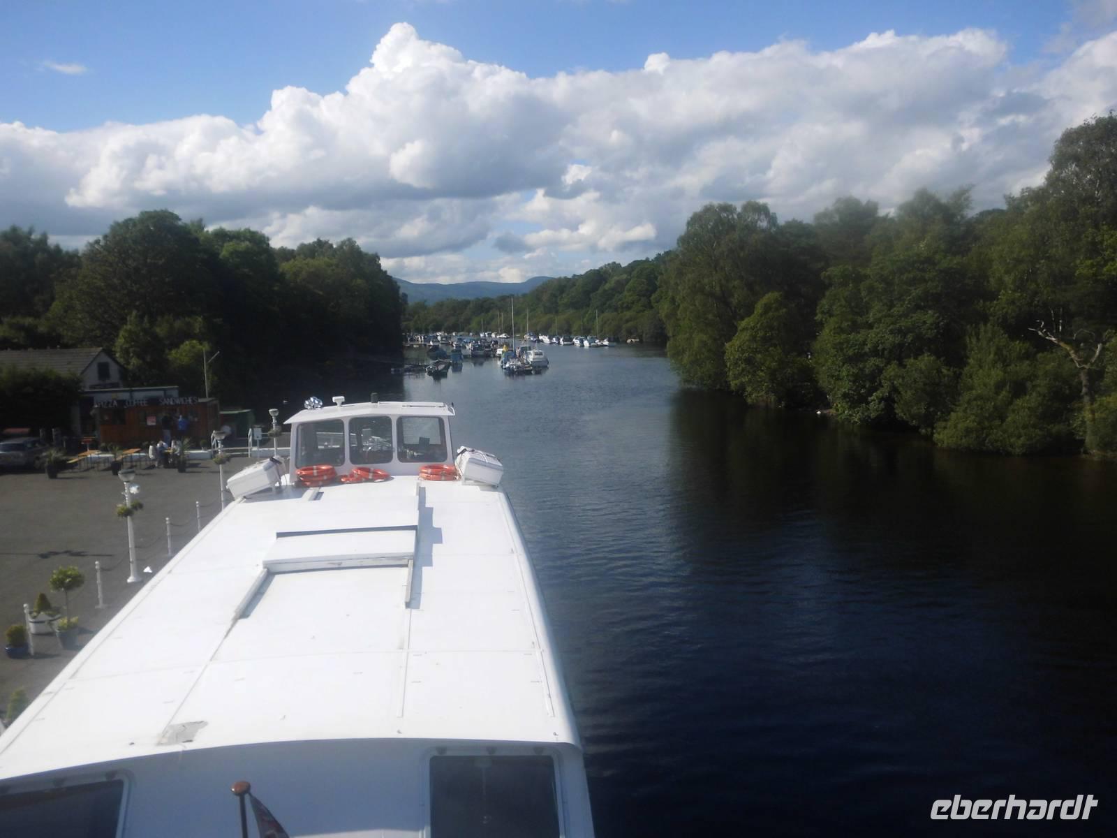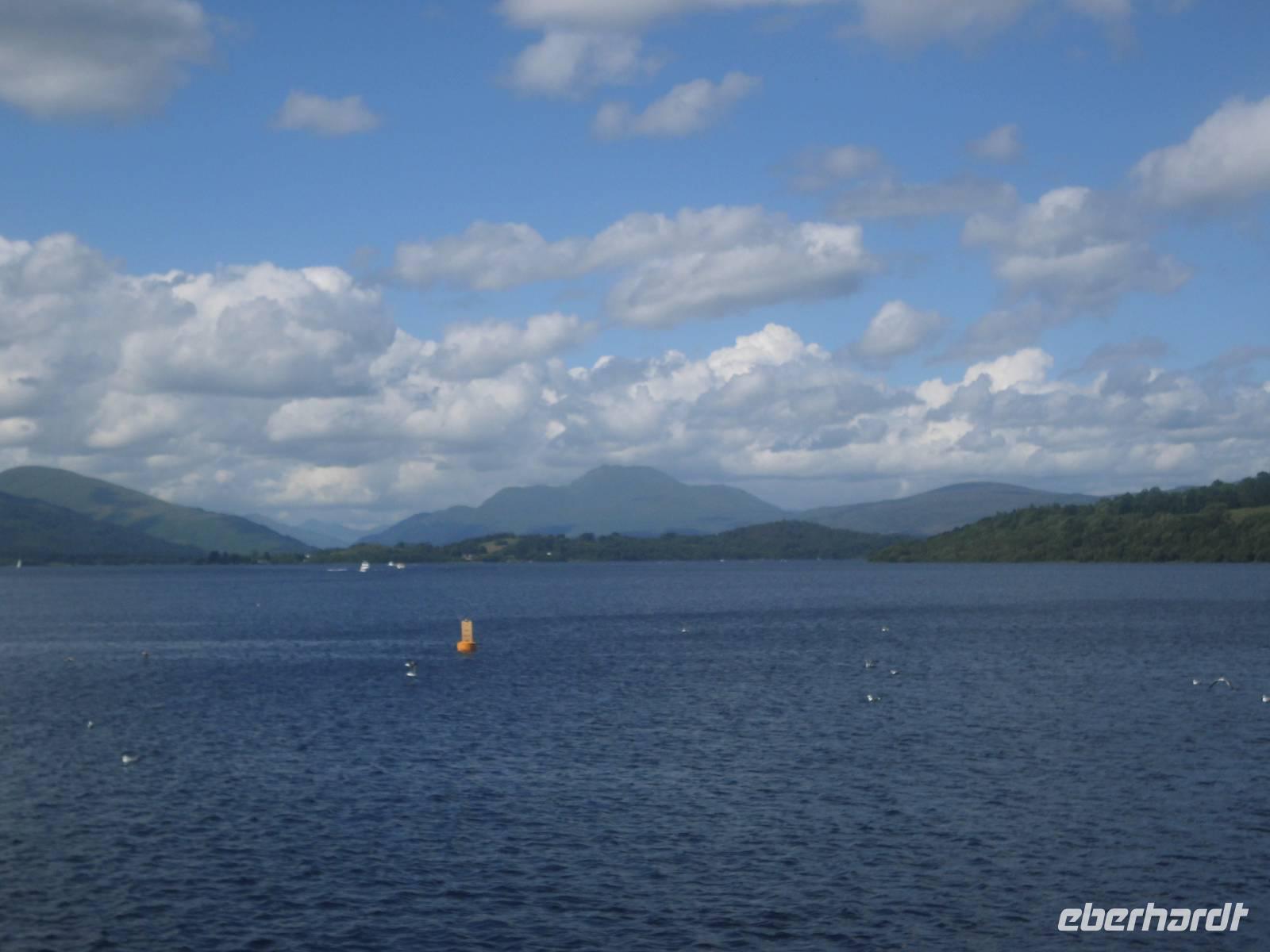 Das blieb auch so bis zum Abend, wobei wir am Nachmittag noch eine schöne einstündige Bootstour auf dem Loch Lomond hatten. Vom Pier in Balloch aus fuhren wir ein Stück den Fluß Leven entlang, bis wir die Wasserfläche des mit 44 Quadratmeilen (etwa 71 km²) größten schottischen Sees erreichten. Auch dieser 37 km lange und bis 8 km breite See ist sehjr tief - mit über 200 m der dtrittiefste in Schottland. Neben 200 Vogelarten, die an seinen Ufern und auf seinen 33 Inseln heimisch sind, gibt es einige interessante Fischarten - auch Lachs und Seeforelle, die aus dem Meer zum Laichen über die Flüsse hierherschwimmen - vor allem aber der „Powan", eine Art Süßwasserhering. Wir konnten die Fahrt bei strahlendem Sonnenschein genießen, bevor es nach kurzem Spaziergang im Dorf dann zu unserer letzten Schottland-Übernachtung ins Hotel ging.
