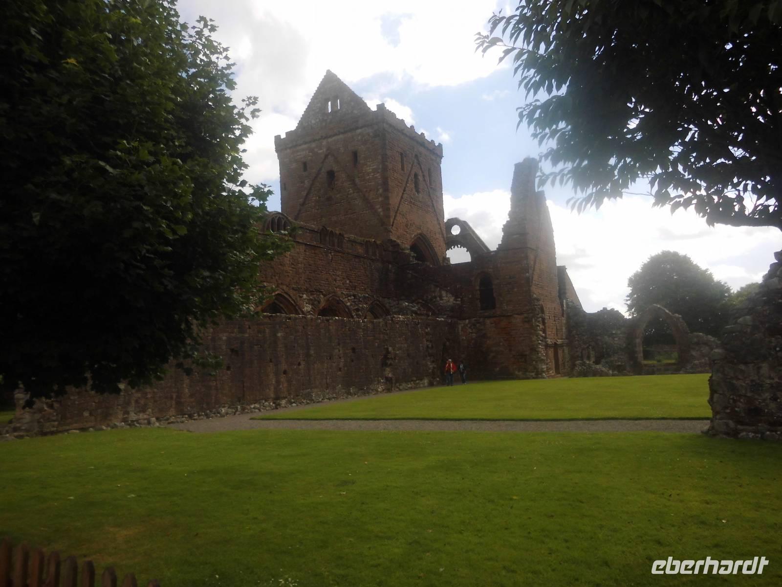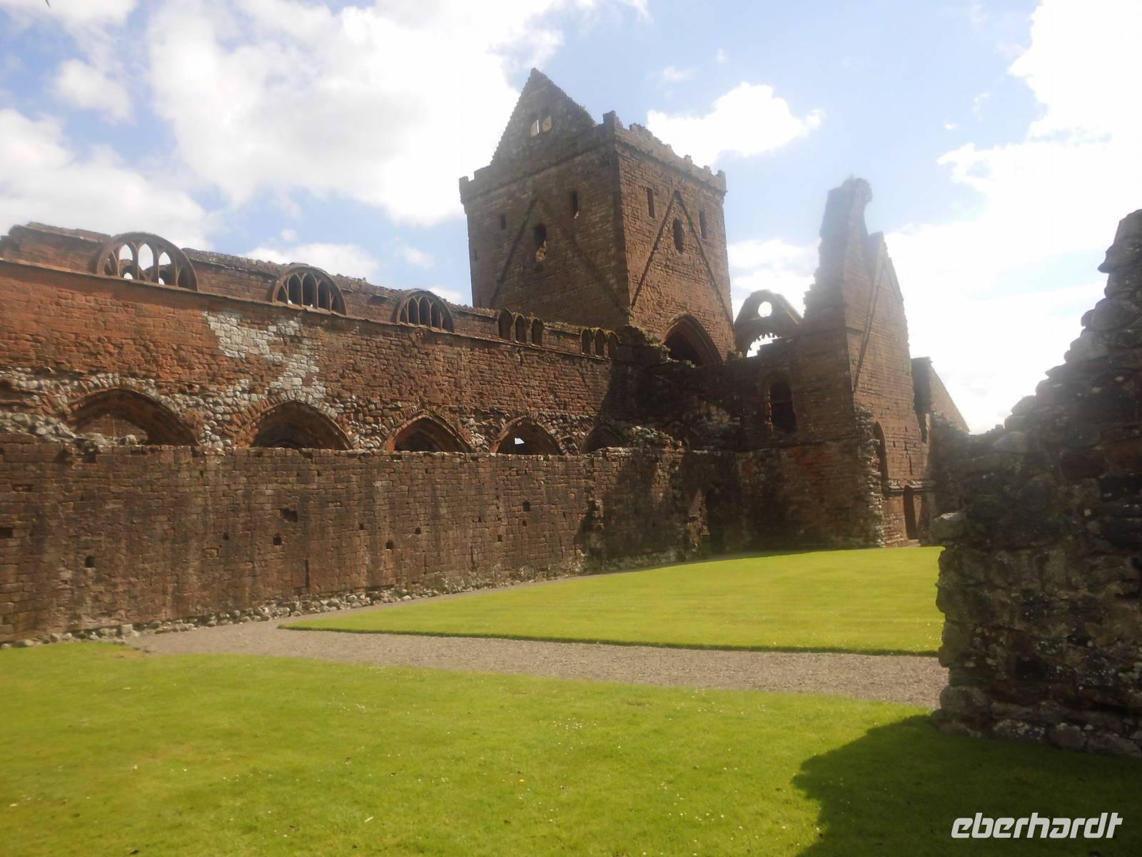 Der letzte Schottland-Tag unserer Reise war angebrochen, heute Nachmittag würde es auf das DFDS-Fährschiff und dann quer über die Nordsee zum Festlandhafen Ijmuiden gehen. Aber noch blieb etwas Zeit für Schottland und wir konnten noch ein oder zwei Besichtigungen „einschieben". So fuhren wir zunächst von Irvine nach Südosten und erreichten am Vormittag Dumfries, die Stadt, die mit Robert Burns, dem schottischen Nationaldichter, auf's Engste verbunden ist. Durch Dumfries ging es weiter nach Süden, bis wir bei schönem Wetter den Ort New Abbey erreichten, an dessen Ende sich die imposante Ruine der Sweetheart Abbey befindet. Dieses ehemalige Zisterzienserkloster war 1273 die letzte Gründung des Ordens in Schottland. Einst hatten sich die Zisterzienser - benannt nach ihrer Stammabtei Cistercium (heute Citeaux in Frankreich) - sehr schnell von den vier als erste von Citeaux aus gegründeten Primarabteien über fast ganz Europa ausgebreitet: das Stammkloster Clairvaux, bekannt durch seinen berühmtesten Abt, den Hl. Bernhard von Claivaux, hatte in Yorkshire in England die bedeutende und bekannte Rievaulx Abbey gegründet, von der aus wiederum Impulse zu Neugründungen auch nach Schottland ausgingen. So waren hier Zisterzienserabteien entstanden, unter anderem Dundrennan. Die einflußreiche Adelige Dervorgilla von Galloway veranlasste die Mönche zu einer weiteren Tochtergründung, de zunächst Neu-Dundrennan genannnt wurde, um eine Grablege für sich und ihren Mann zu haben. Ihr Gemahl, John Balliol - der Vater des später mit englischer Hilfe gekrönten Schottenkönigs John Balliol - war gestorben und in übergroßer Liebe hatte sie jahrelang sein einbalsamiertes Herz mit sich herumgetragen. Später wurde sie, zusammen mit dem Herzen ihres Mannes in der Abteikirche beerdigt, die aufgrund dieser Geschichte den Namen „Sweeheart Abbey" bekam.