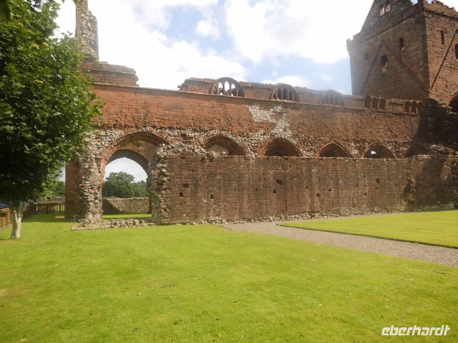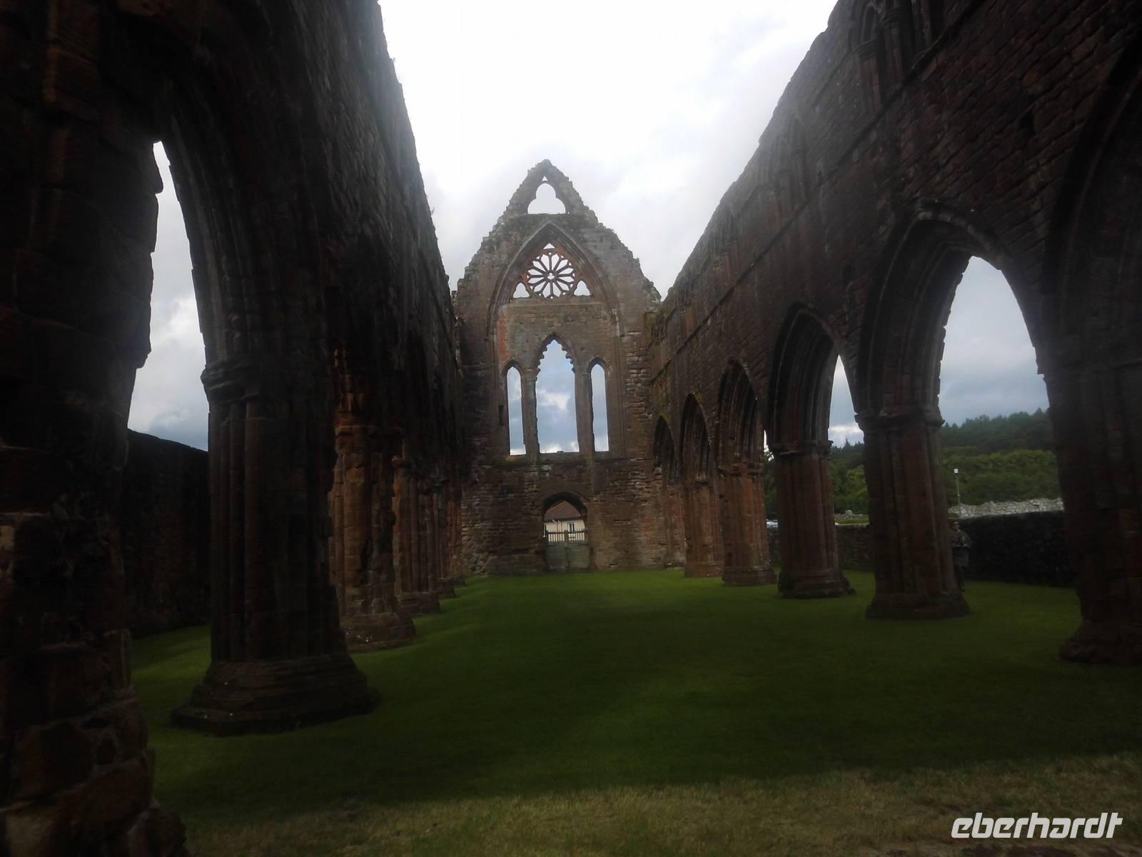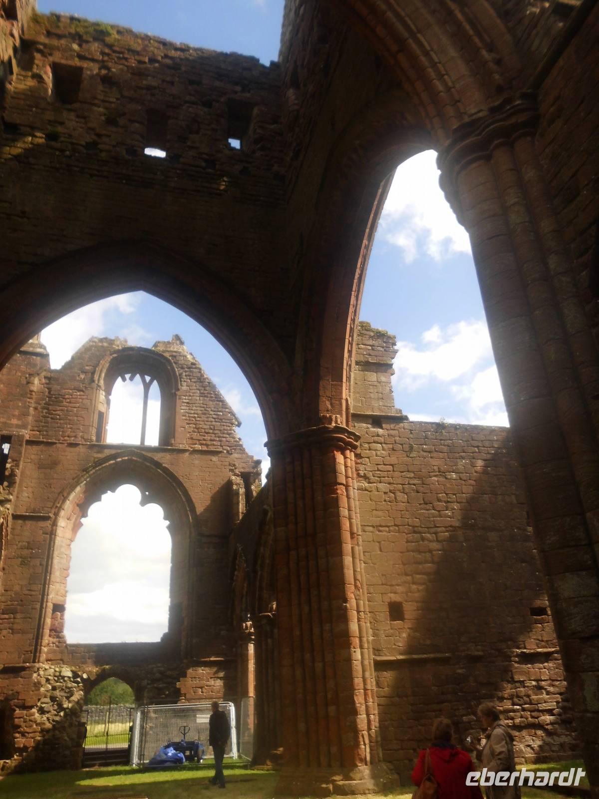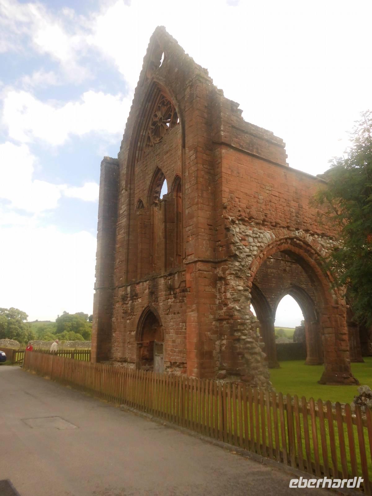 Wir besichtigten die interessante, ziemlich gut erhaltene Kirche, die noch reich verzierte Ansätze zu Fensterrosen und anderen gotischen Schmuckelementen zeigt und deren roter Sandstein gut mit den umgebenden grünen Hügeln und dem blauen Himmel kontrastierte. Mehrere Grablegen und Grabsteine sind noch zu finden, auch die inzwischen offenbar beiseite gerückte Grabtumba der Stifterin Dervorgilla. Trotz der schottischen Reformation, der die meisten katho Klöster zum Opfer fielen, die Heinrich VIII. von England noch nicht zerstört hatte, blieb das Kloster noch über 60 weitere Jahrte intakt und wurde erst 1624 aufgegeben.