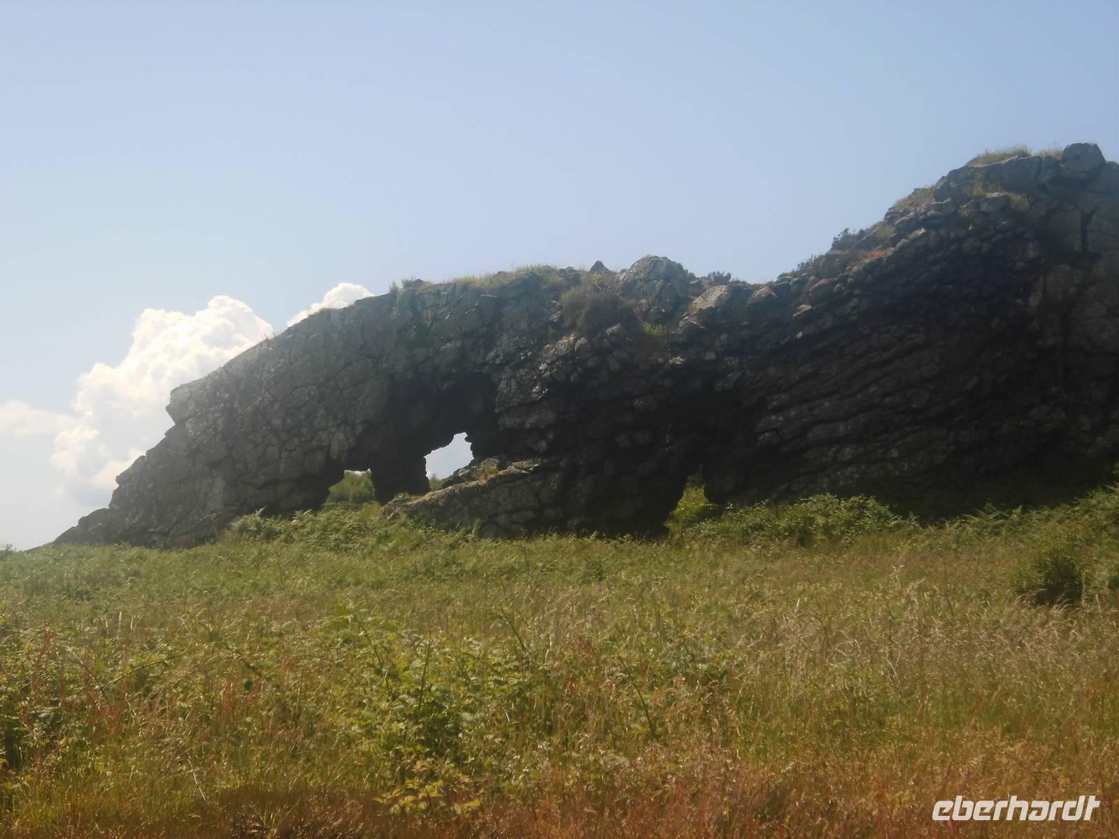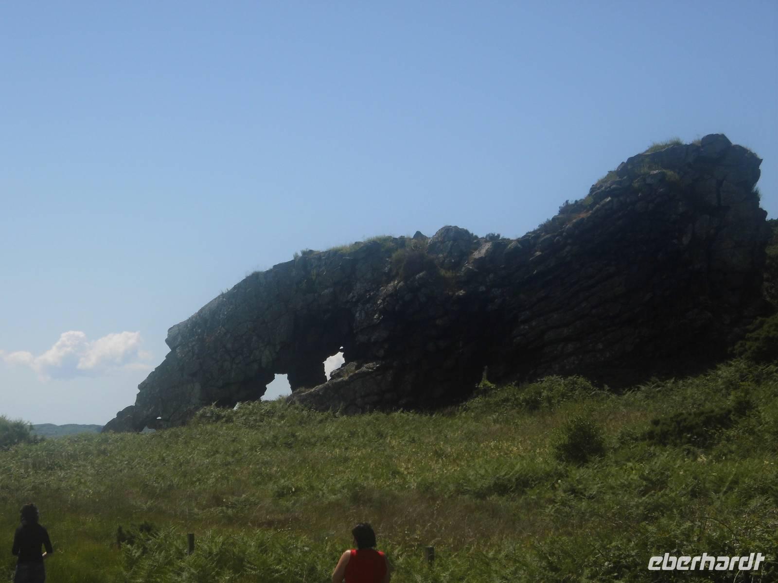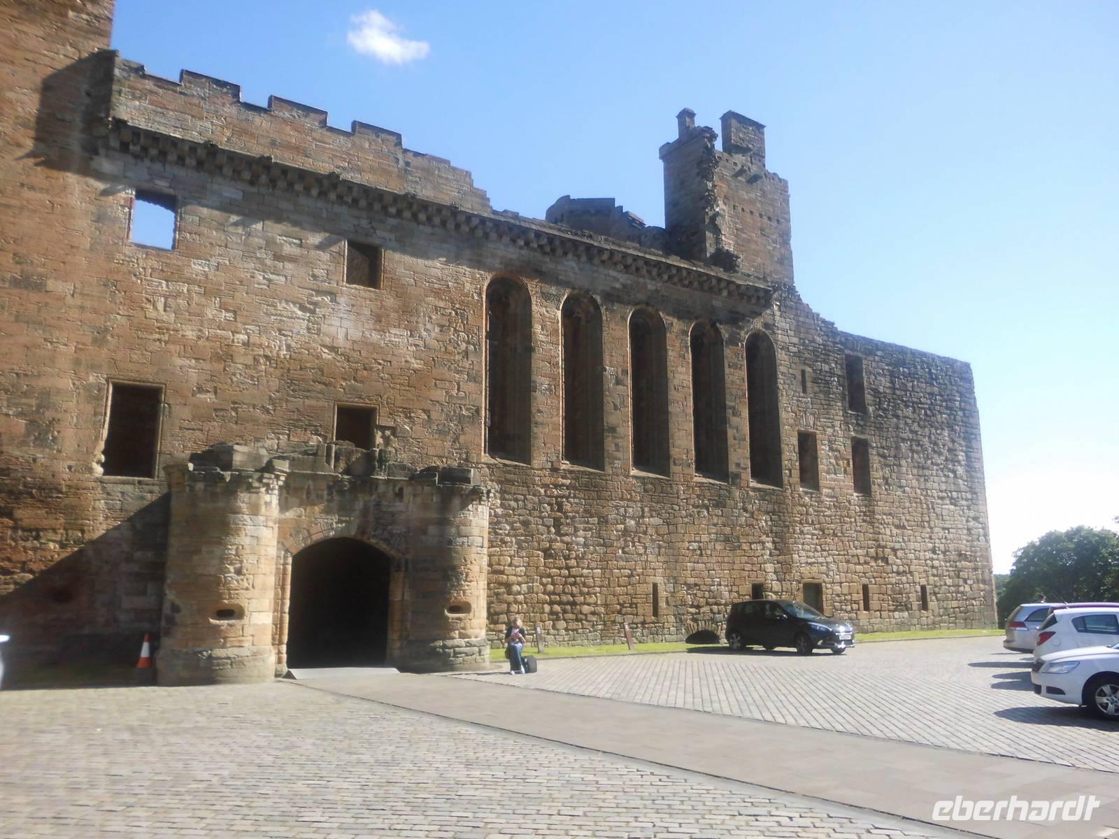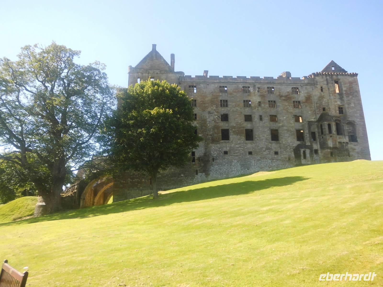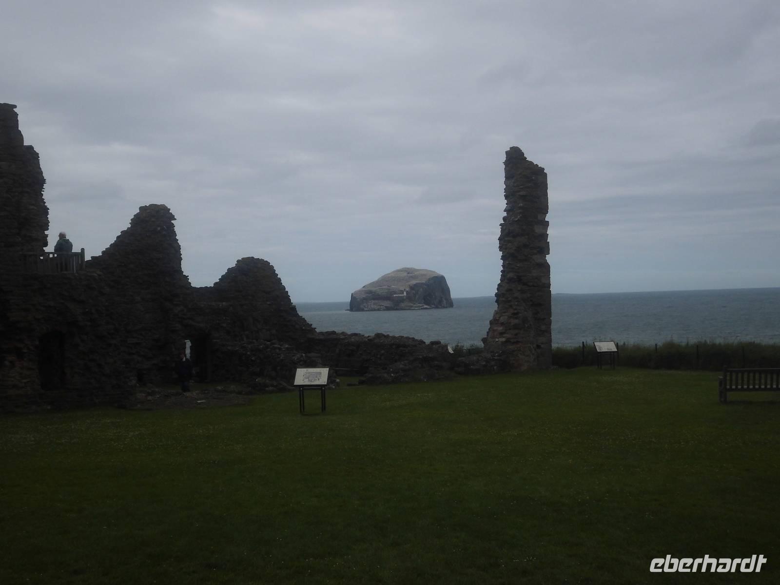 Nach Überschreiten der Grenze zu Schottland erreichten wir schon bald die erste schottische Burg. Hoch auf einer Klippe am Eingang des Firth of Forth wurde im 14. Jahrhundert vom Douglas Clan Tantallon Castle erbaut. Von drei Seiten natürlich durch die Steilküste und die rauhe See geschützt, vermittelt die Burg heute noch den Eindruck einstiger Wehrhaftigkeit. Schon im englischen Bürgerkrieg unter Cromwell im 17. Jahrhundert zerstört und mit Artillerie zur Ruine geschossen, kann man dennoch heute noch den wuchtigen Mittelturm mit Tor, die Palastanlagfe und die Außenwerke gut erkennen - sogar den gewaltigen einstigen Burggraben, der den Landzugang - die vierte Seite - schützte.