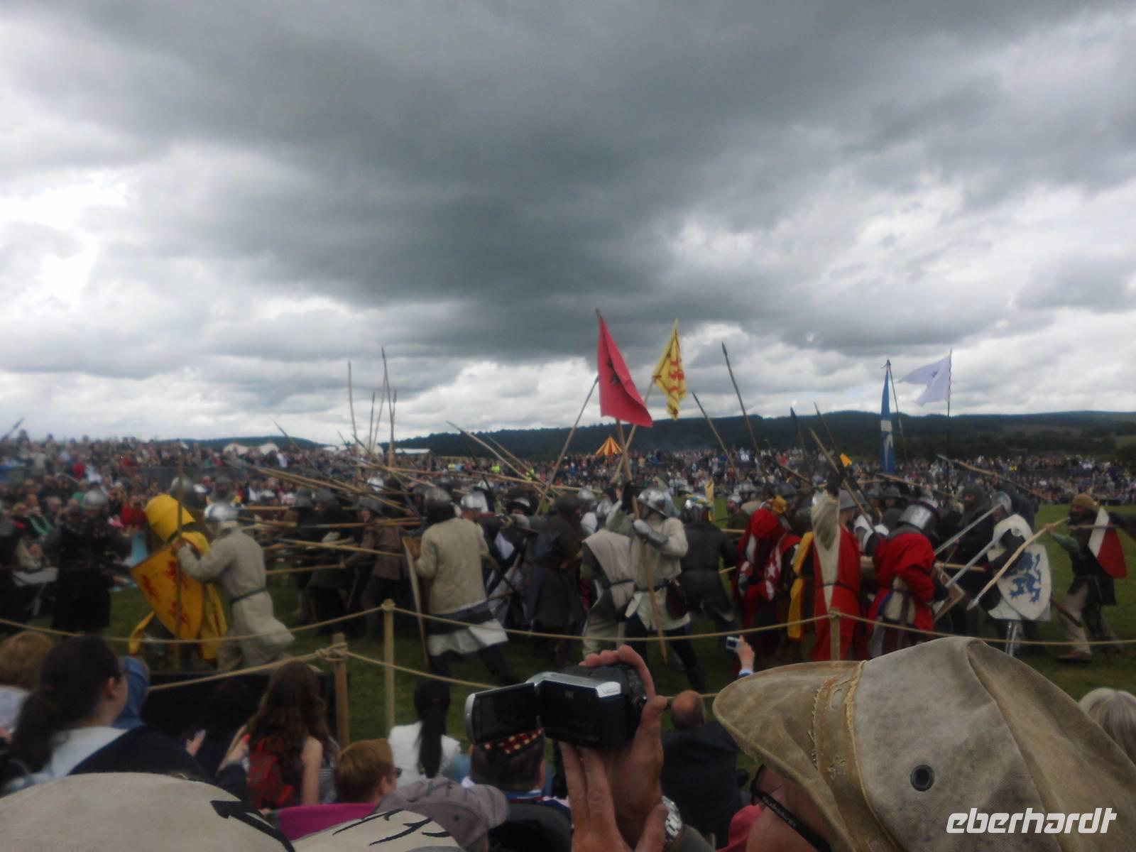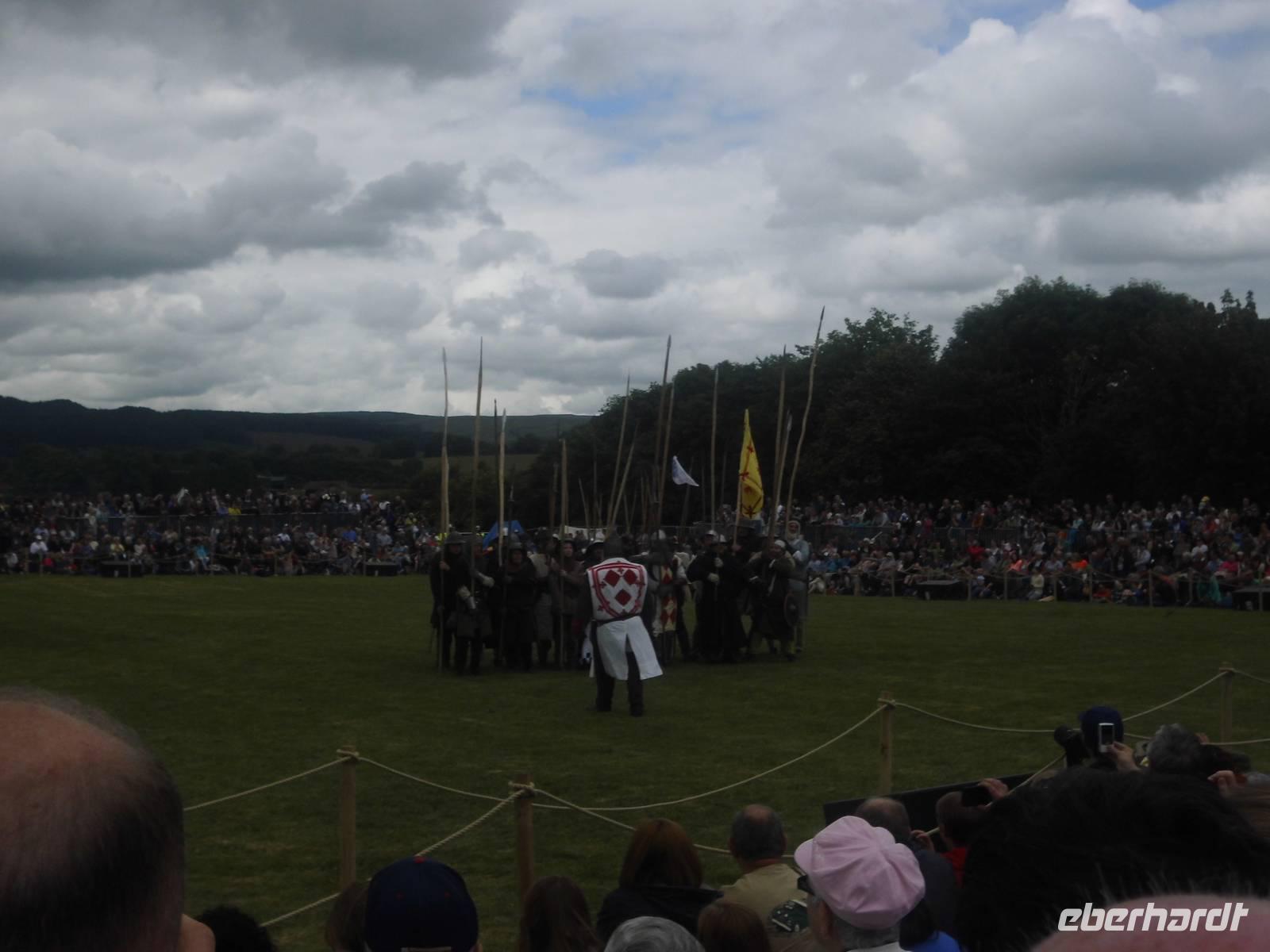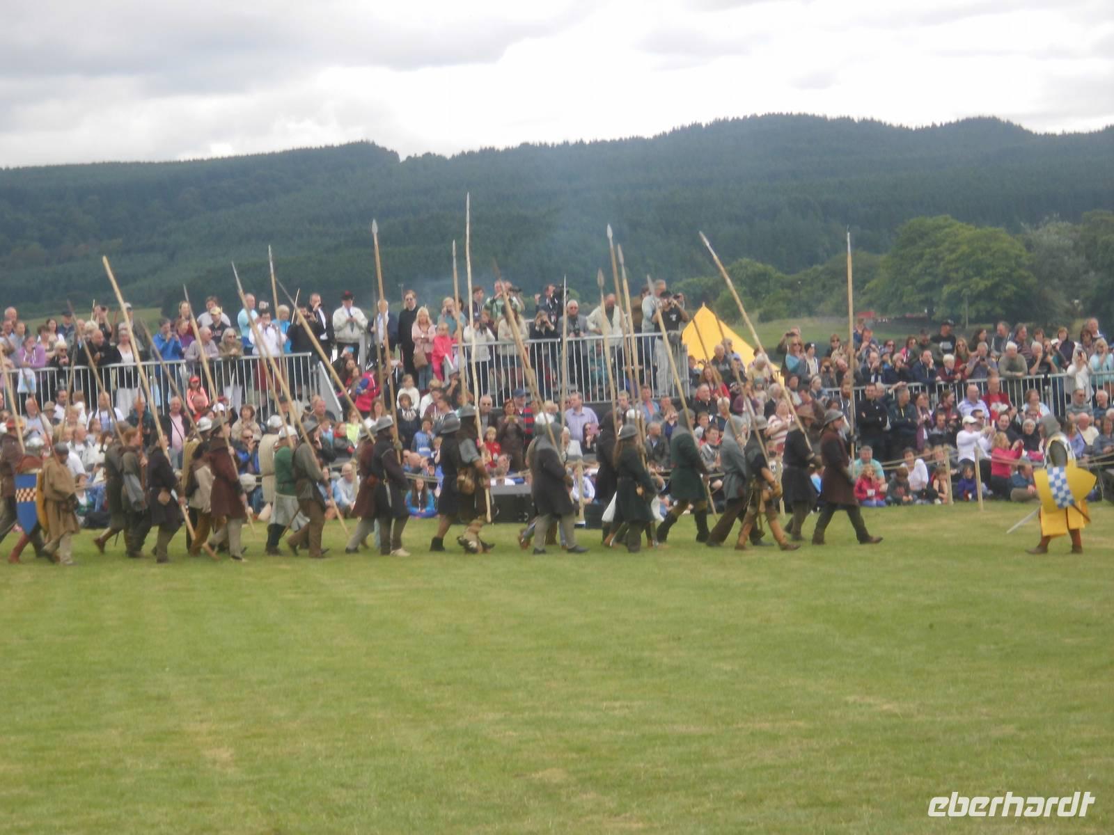 Heute befinden sich auf dem relativ kleinen damaligen Schlachtfeld zwischen den Flüssen Bannock und Forth ein gerade eingeweihtes Besucherzentrum und eine große Reiterstatue von Robert the Bruce. Und genau die stand während der diesjährigen Ereignisse Ende Juni im Mittelpunkt der „Geburtstagsfeier". 700 Jahre nach den damaligen Ereignissen sah das Schlachtfeld erneut unerwartete Turbulenz: tausende erwartungshungriger Menschen - Schotten und ihre Gäste - waren zu dem Spektakel erschienen, das die Nachstellung der historischen Schlacht bieten sollte. Zunächst allerdings fielen viele Reihen bunter Buden, Zelte und Kioske ins Auge - Niederlassungen und Präsentationsobjekte diverser schottischer Clans - denn das Ereignis sollte auch ein nationales Zusammentreffen originaler Clans sein - vor allem aber Verkaufsbuden, Imbiss- und Bierzelte. Am Rand des Geländes befand sich dann der abgeteilte Showgrund, auf dem die „Schlacht" vorgeführt werden sollte und der schon von tausenden von Zuschauern umlagert war. Gegen 12.00 Uhr kamen dann immer mehr historisch Gewandete und Bewaffnete am Rand der Arena zusammen, es erschien hoch zu Ross Robert the Bruce, später Robert I. von Schottland, dargestellt von dem Schauspieler Roy Ramsay, dem am Rande des Schlachtfelds die ersten Bewaffneten huldigten...