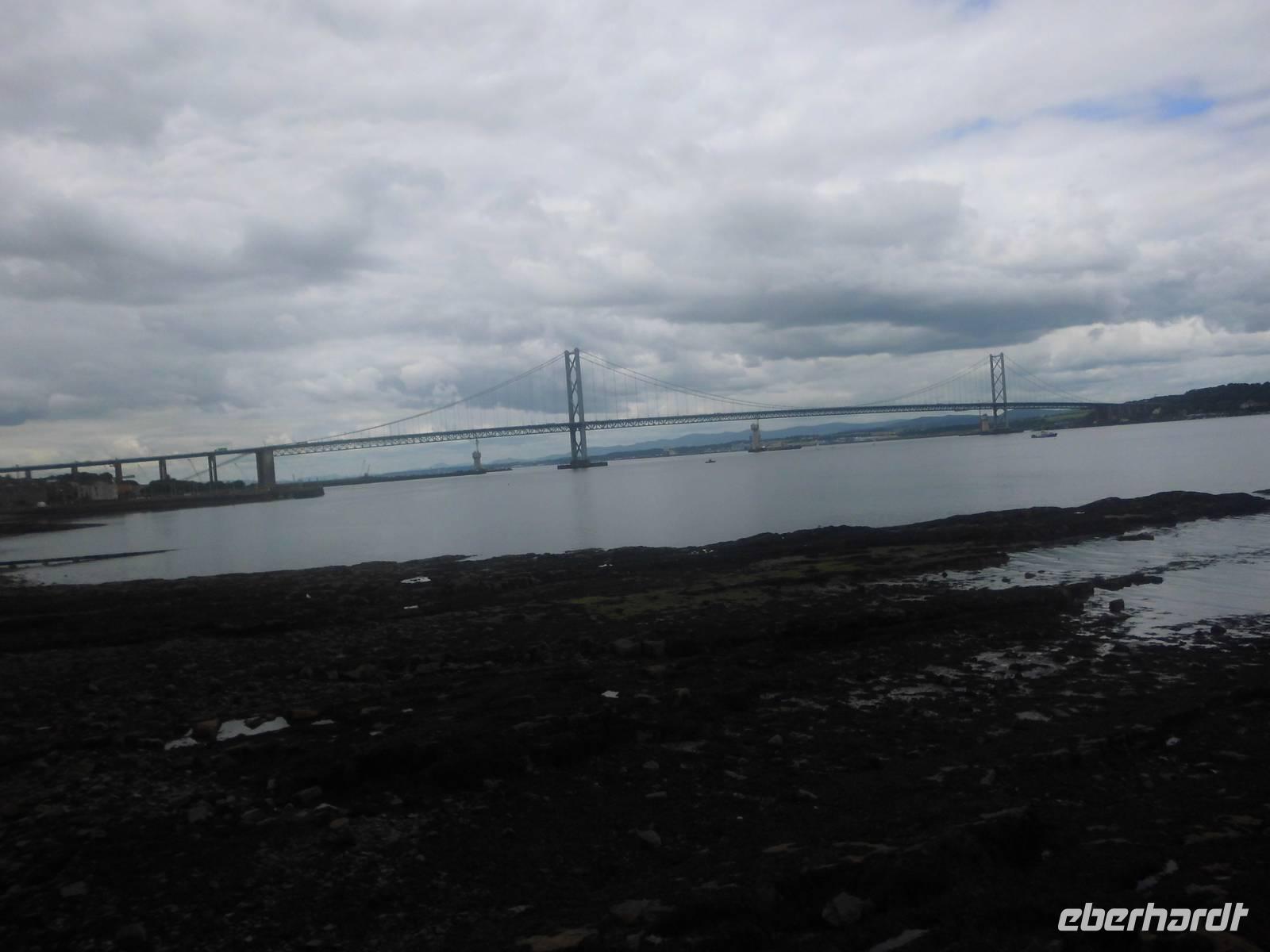 Weiter ging es dann nach Edinburgh, aber mit einer Unterbrechung unserer Fahrt für einen Fotostopp an den Forth-of-Forth-Bridges. Die Eisenbahnbrücke, nach siebenjähriger Bauzeit 1890 in Diens gestellt, gilt immer noch als ingenieurtechnische Meisterleistung. Mit markanten Formen ihrer Fachwerk-Stahlbögen, die in granitenen Unterbauen ruhen und jeweils mehr als 500 m überspannen, war sie einst die weltgrößte Brücke ihrer Art. Über 54.000 Tonnen Stahl wurden verbaut, um auf etwa 2,5 km Länge den Firth of Forth in 50 m Höhe zu überspannen und ungehinderten Schiffsverkehr darunter durchzulassen. Die danebenliegende Straßenbrücke, seit 1964 in Betrieb und die längste Großbritanniens, überspannt ebenfalls auf mehr als 2 km die fjordähnliche Flussmündung! Am besten kamen die beiden gewaltigen Brückenbauwerke bei unserem Halt zu ihren Füßen im historischen Ort South Queensferry zur Geltung.