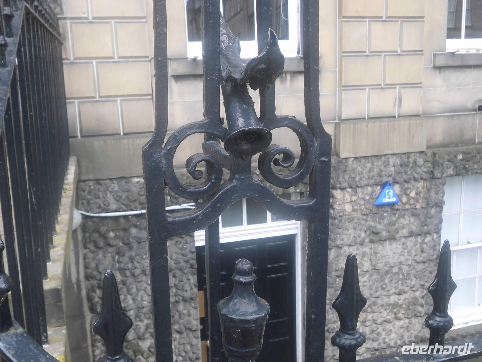 Der heutige Nachmittag war dann aber ganz der schottischen Hauptstadt gewidmet. Wir begannen die Stadtrundfahrt in Edinburgh mit Stadtführerin Friederike am Charlotte Square, einem der Hauptplätze der Neustadt, die im 18.Jahrhundert in komplett gregorianischem Stil errichtet worden war. Viele der charakteristischen Stadtpaläste - mit kleinen Balkons und gusseisernen Balustraden - enthalten noch alte Vorrichtungen, deren Sinn man heute nur noch versteht, wenn man die sich die Verhältnisse der damaligen Zeit vor Augen führt. Da gibt es etwa noch Tüllen zum Fackellöschen, Kratzer zum Stiefelabtreten und mitunter auch noch den erhöhten Trottoirstein, der es gutgekleideten Gentlemen oder Damen in Reifröcken ermöglichte, leichter auf's Pferd oder in die Kutsche zu steigen.