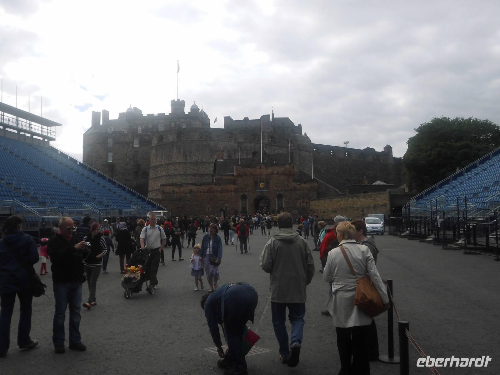 Später durchfuhren wir Teile der Altstadt, passierten beispielsweise die in Schottland bekannte Hunde-Statue „Greyfriars Bobby", sahen den Haymarket (Heumarkt) mit dem berühmten Pub „Last Drop" (Zum letzten Tropfen) neben der ehemaligen Galgen-Stätte und parkten dann mit dem Bus gleich neben dem Aufgang zum Castle. Wie immer musste man sich hier durch Menschenmassen bewegen, zumal schon der größte Teil des Platzes vor der Burg, die „Esplanade", von den Einrichtungen des „Military Tattoo" eingenommen, das dann erst im August stattfindet. Friederike führte uns noch ein paar Minuten durch die Burg, die auch heute immer noch Militärgelände ist. Nach Erläuterungen zum ältesten Gebäude Edinburghs, der Margaretenkapelle im ältesten Teil von Edinburgh Castle, den Befestigungsanla-gen und Hinweisen für die Freizeitgestaltung endeten wir auf dem Platz vor dem Haus der Kronjuwelen. Dann gab es Freizeit den Rest des Nachmittags - entweder die Burg ausgiebiger besehen, trotz des Sonntags shoppen gehen oder sich die sehenswerte Altstadt - wie immer voller Menschen und mit Schaustellern und Gelegenheitskünstlern überfüllt - zu Gemüte führen. Danach ging es dann mit dem Bus zu Abendessen und Übernachtung in unser etwas außerhalb gelegenes Hotel.