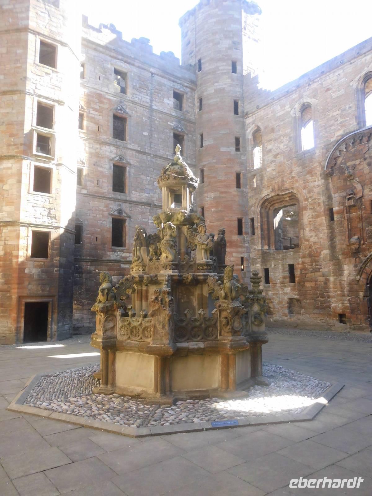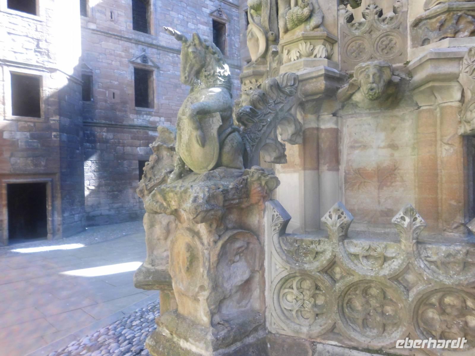 Mehr als 500 Jahre lang war Stirlings Burg eine der Hauptresidenzen der schottischen Könige und neben Edinburgh die wichtigste Festung. Befestigt war der steil aufragende Burgfelsen, der die Wehranlage von drei Seiten zuverlässig schützt und ihr den Nimbus der Unbezwingbarkeit verleiht, wohl schon in sehr früher Zeit, um 1100 gab es hier bereits eine starke Burg. Immer wieder umgebaut, zusätzlich befestigt und im Inneren mit Palastbauten „verfeinert". Die letzte „Haupt-Bauphase fiel in die Mitte des 16. Jahrhunderts und ergab eine Mischung aus Spätgotik und Renaissance. Am königlichen Palast, an dem mehr als hundert Jahre gebaut und umgebaut wurde, lässt sich die Stilentwicklung der Bauphase(n) recht gut ablesen. Prunkstück des Castles ist zweifellos die spätgotische Festhalle, durch seinen beigefarbenen Anstrich das hellste Gebäude des Oberen Hofs und der gesamten Burg. Hier fanden nicht nur des Königs Feste statt, sondern hier tagte auch das schottische Parlament. Der Autor des unsterblichen „Robinson Crusoe", Daniel Dafoe, meinte, es wäre der „majestätischste Bau, den ich je in Europa sah". Mehrere Dinge - Palast, Festhalle, Regimentsmuseum... konnten wir während unseres Aufenthaltes in Stirling Castle besichtigen, bevor es weiterging zum nächsten Programmpunkt.