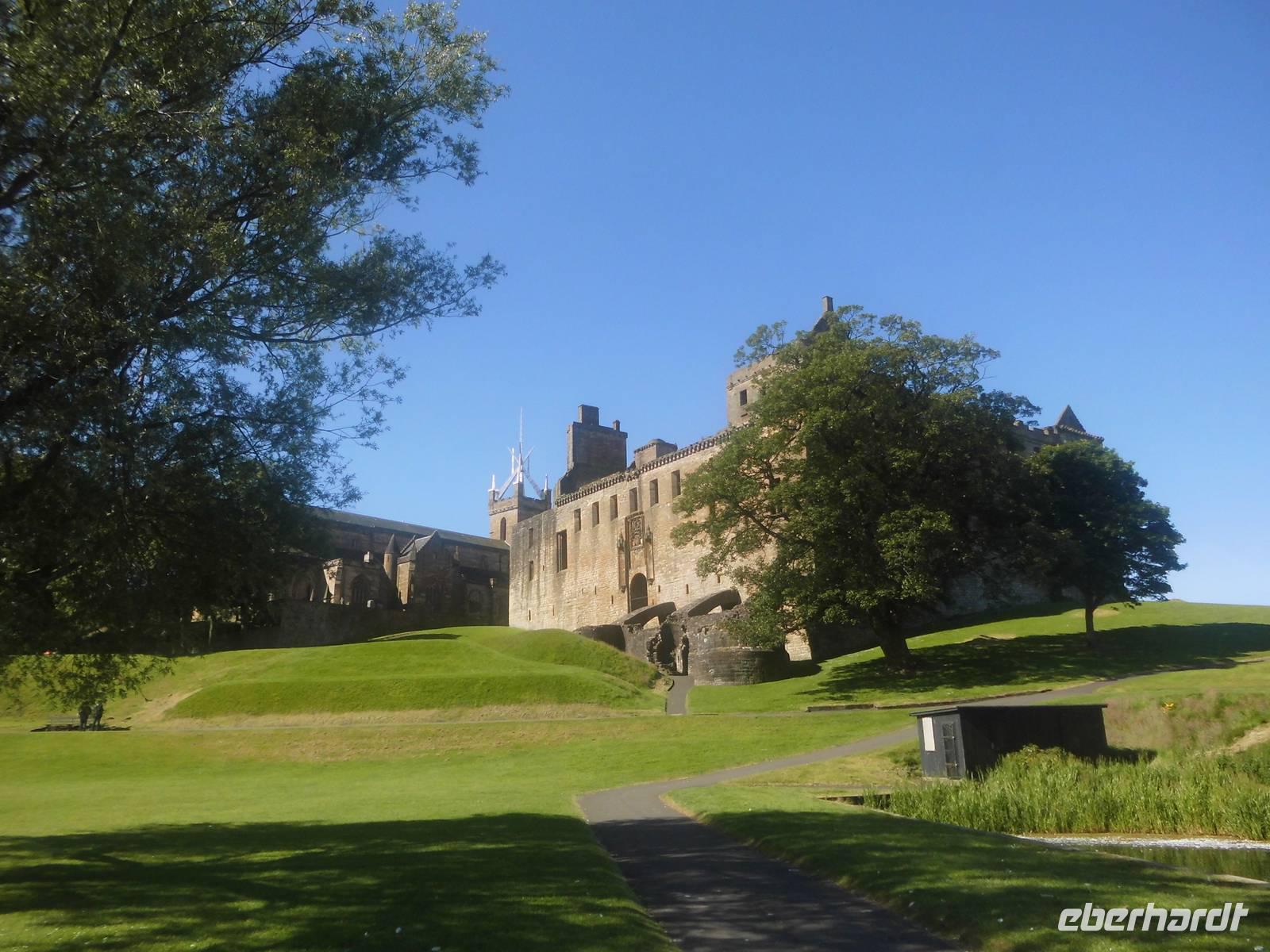 Unser erstes Ziel heute war der Besuch einer alten Residenz der schottischen Könige. Linlithgow Palace wurde als leicht befestigtes Wohnschloss überwiegend im 15. und frühen 16. Jahrhundert errichtet und durch seine schöne Anlage am idyllischen See Linlithgow be-vorzugter Wohnsitz mehrerer Könige und Königinnen, später Witwensitz. Bekannt ist der durchaus malerisch wirkende Palast - den Theodor Fontane übrigens sehr uncharmant als „einer aufgelassenen chemischen Fabrik nicht unähnlich" beschrieb - natürlich auch als Ge-burtsort von Maria Stuart, der unglücklichen schottischen Königin mit einem schwierigen Le-benslauf. „Mary, Queen of Scots", wie sie in der Bevölkerung heute noch genannt wird, wur-de schon mit 21 Witwe des französischen Thronfolgers, kehrte nach Schottland zurück und wurde - in den beginnenden Religionsstreitigkeiten zwischen Protestanten und Katholiken und belastet mit zwei unklug eingegangenen Ehen - aus Schottland vertrieben. In England Zuflucht suchend setzte ihre Rivalin Elisabeth I. sie gefangen und ließ sie schließlich hinrich-ten. Der Tag unseres Besuches war begleitet von „makellosem" Wetter, das die Idylle des Platzes so richtig zur Geltung kommen und uns unsere folgende Freizeit so richtig genießen ließ.