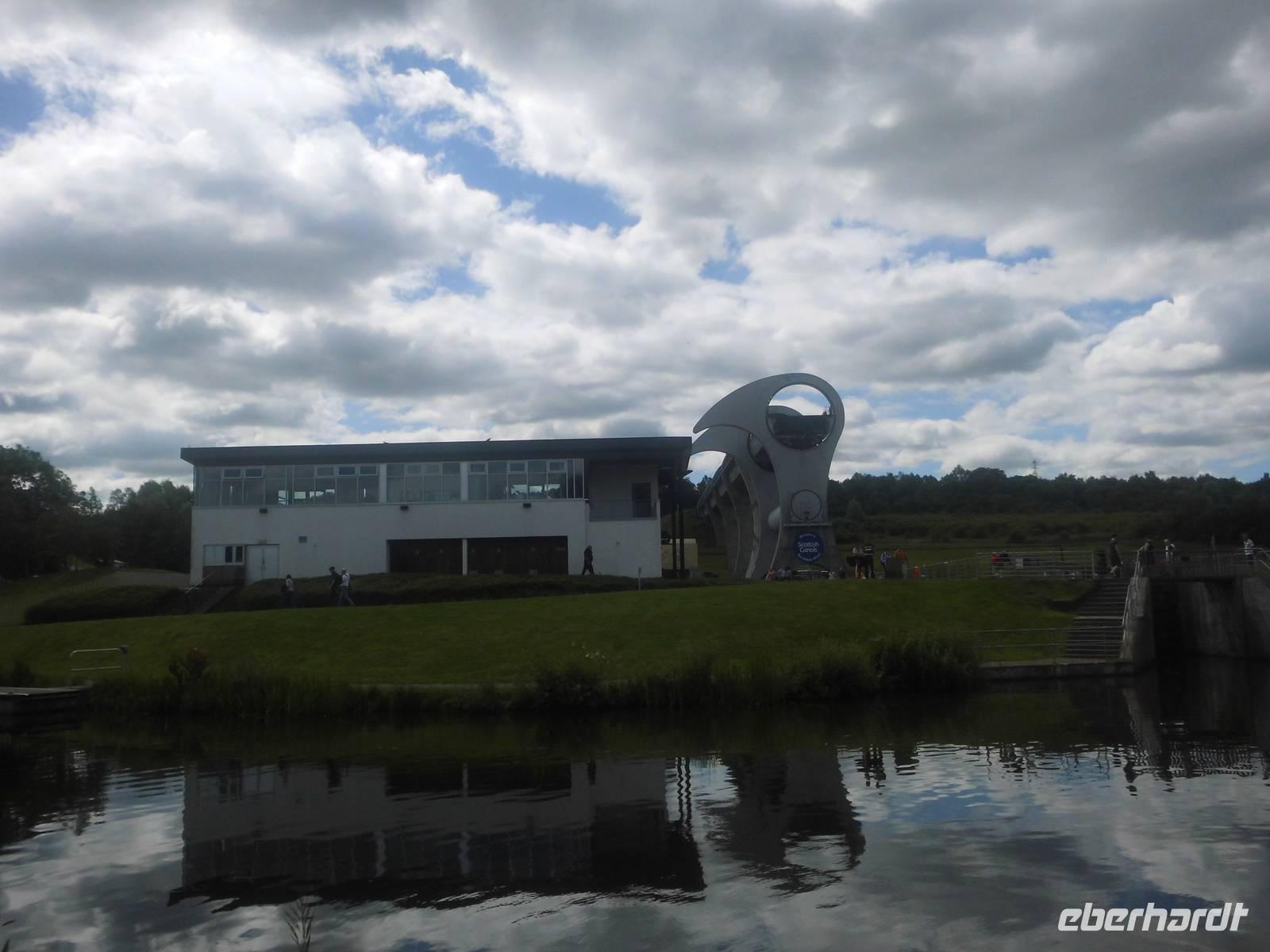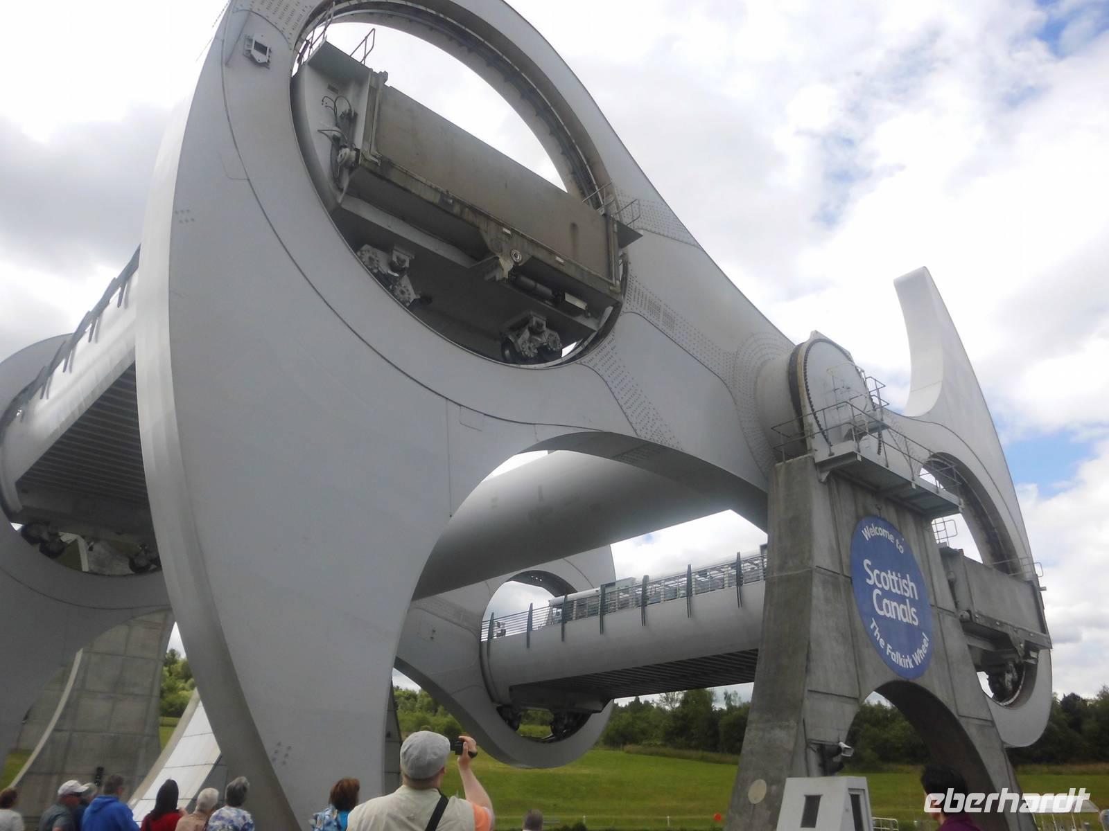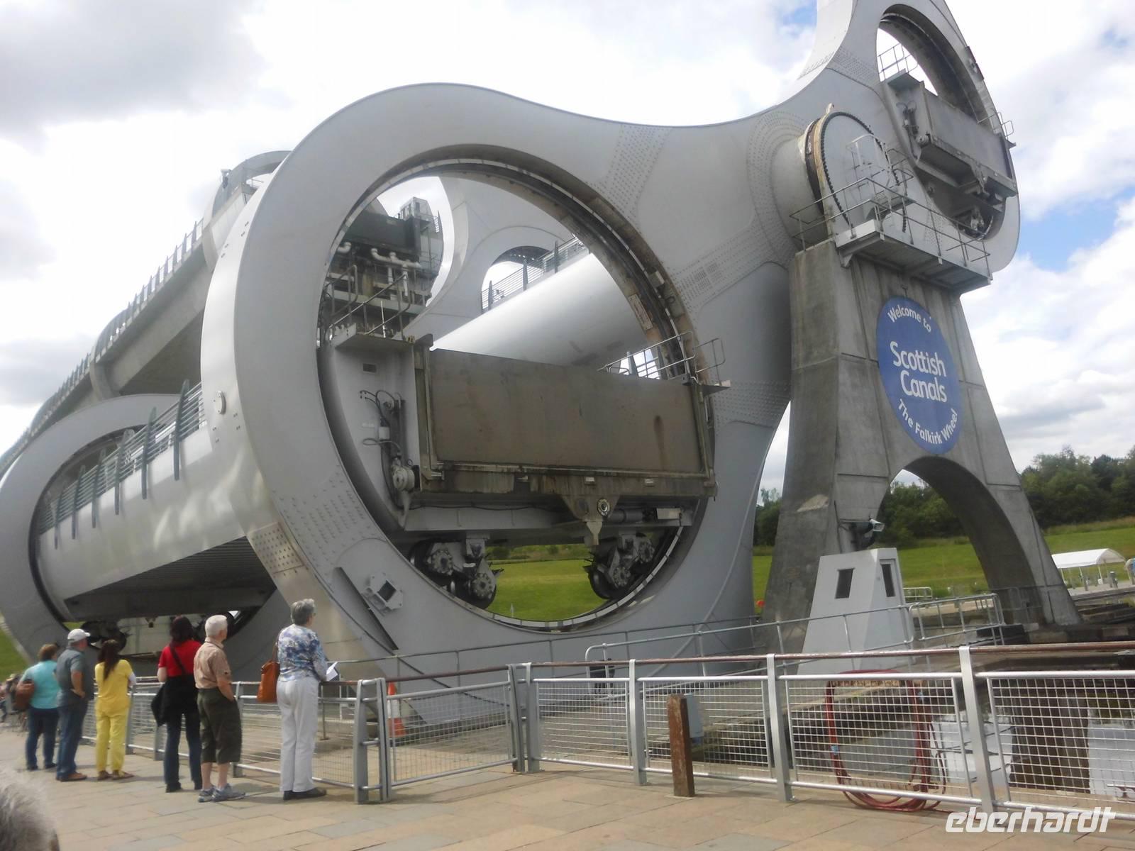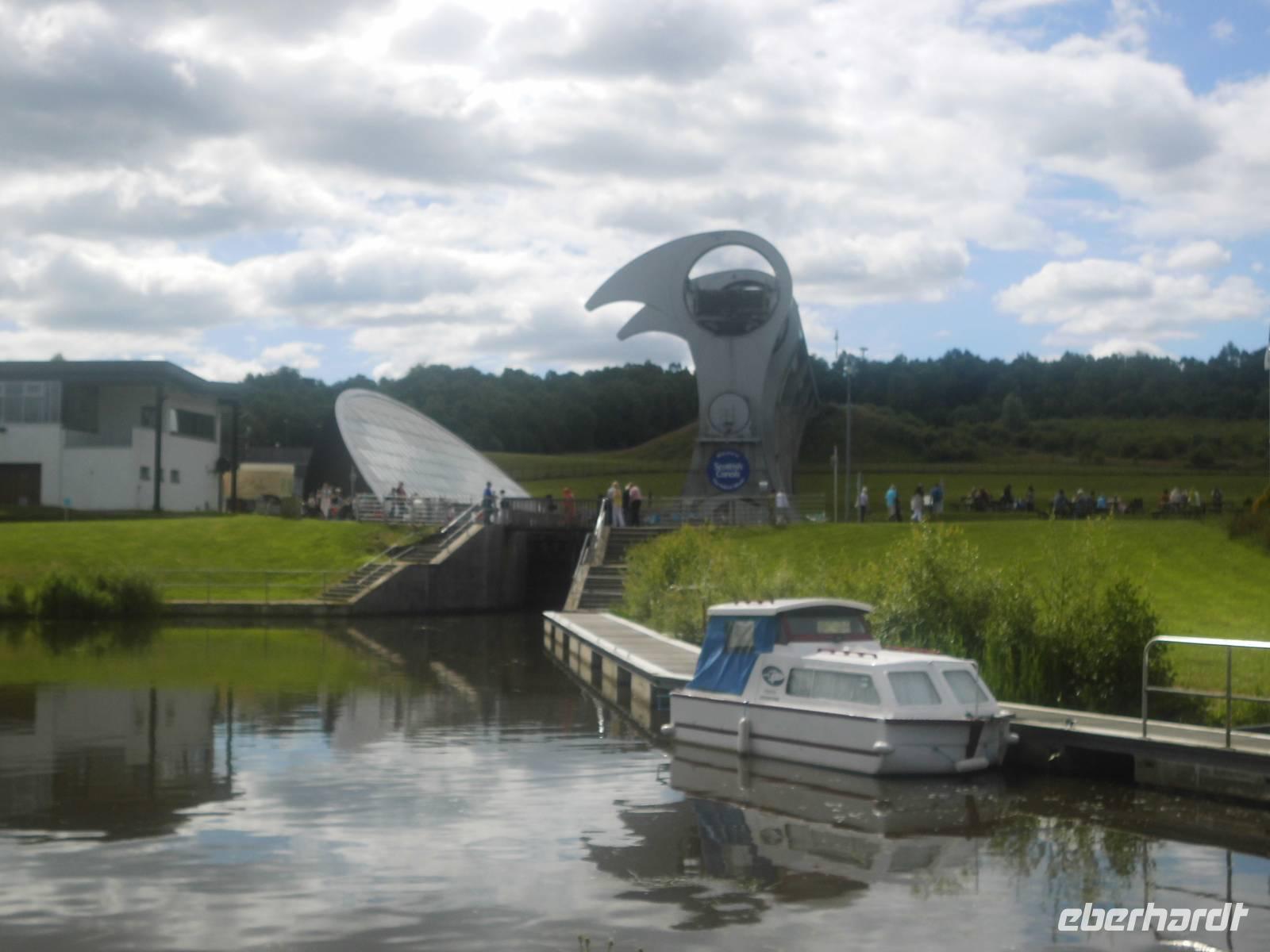 Nach Verlassen von Linlithgow Palace konnte ich ein schönes „Richtig reisen!"-Extra ein-bauen: das „Millenniumbauwerk" des Falkirk Wheel. Dieses moderne Schiffshebewerk ist erst seit 2002 in Dienst und bisher in seiner Konstruktion als eine Art Riesenrad einmalig auf der Welt: Die ungeahnt leichte Gesamtkonstruktion wiegt nur etwa 1800 Tonnen, das Rad, das zwei Gondeln mit Trögen mit jeweils 250 t Wasserinhalt enthält, hat 35 m Durchmesser. Die zwei gewaltigen Wassertröge, auf Rollen im Inneren der kreisförmigen Aussparung der Gondeln laufend, werden durch eine halbe Drehung des Förder-Rades innerhalb von etwa drei Minuten in ihrer Position getauscht. Die in sie hineingefahrenen Boote werden dabei eine Ebene gehoben oder gesenkt und überwinden damit einen Höhenunterschied von 24 Metern. Das Hebewerk ist Teil eines Kanalsystems zur Durchquerung Schottlands in West-Ost-Richtung, stellt eine Verbindung zwischen den Flüssen Clyde und Forth her und ersetzt eine frühere, inzwischen stark veraltete Schleusentreppe von elf Schleusen