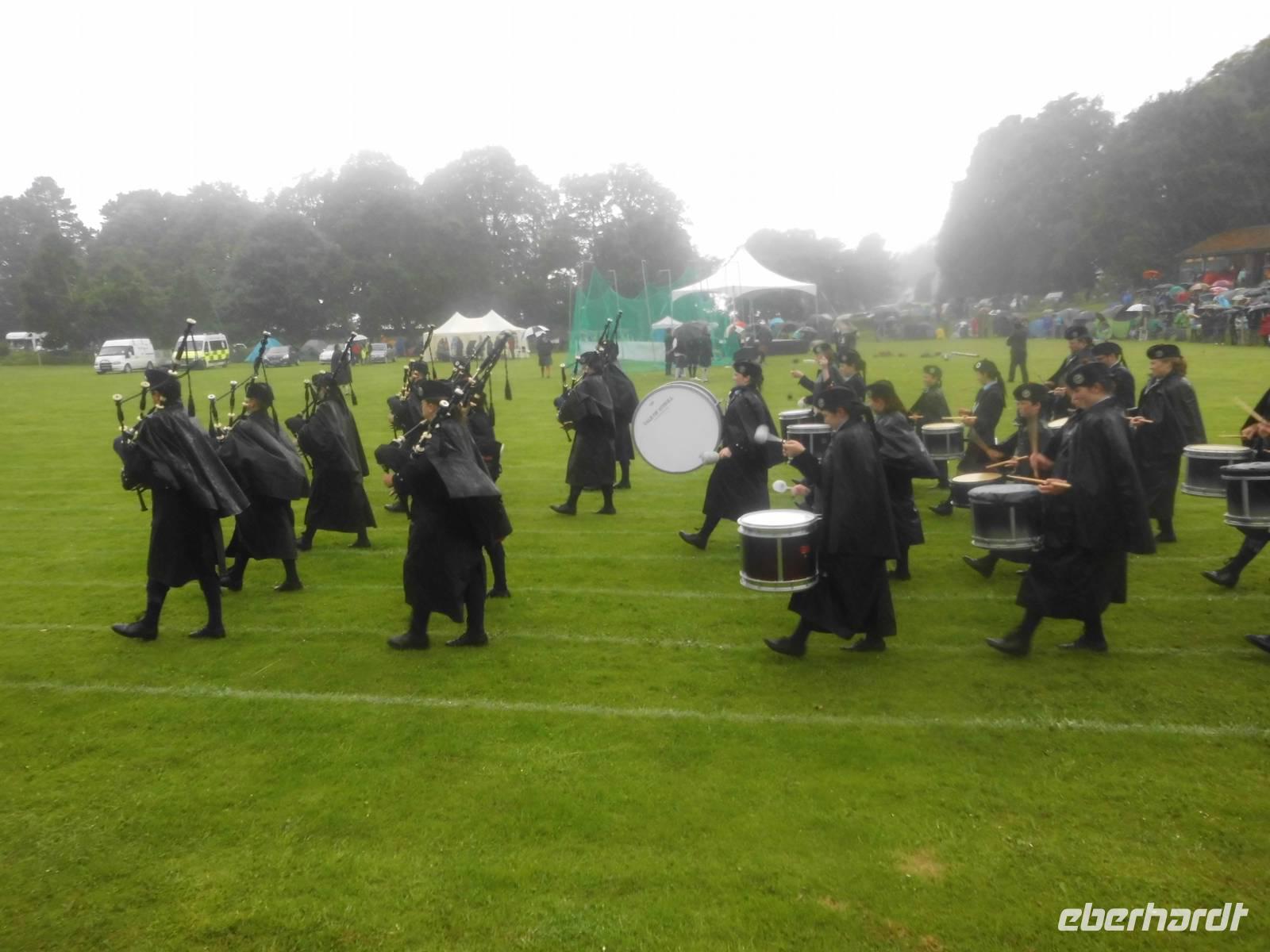 Der Höhepunkt des Tages sollten aber die Highland Games von Kenmore werden, einem kleinen Ort am Ostufer des Loch Tay. Diese sportlichen Wettkämpfe der schottischen Clans sind schon sehr alt. Man sagt, die frühen schottischen Könige hätten auf diese Art die schnellsten und stärksten jungen Männer gesucht, um Leibwächter und Boten zu rekrutieren. Besondere historische Disziplinen wie „Highland Daning" - traditionelle Tanzwettbewerbe für Frauen und Mädchen - Baumstammwerfen und Steinestoßen für die kräftigsten Männer und auch „Pipe Band Contest" - der Wettbewerb der Dudelsack-Kapellen, gehören immer noch zum Repertoire dieser Wettbewerbe, die oft mit einem „gathering", einem Clantreffen, verbunden sind und jährlich tausende Besucher anlocken. Dieses Jahr waren auch wir dabei - aber Petrus meinte es nicht besonders freundlich mit uns. Die Kenmore Games sind die einzigen Abendspiele, aber schon kurz Eröffnung begann es heute zu regnen und hielt auch konsequent während der zwei Stunden an, die wir die Spiele besuchten. So konnten wir in strömendem Regen nur einen spärlichen Eindruck erhaschen und einen Blick auf die unter einem Pavillon-Zeltdach tanzenden Schottinnen werfen - aber wir hatten ja eine weitere Chance auf Highland-Games.