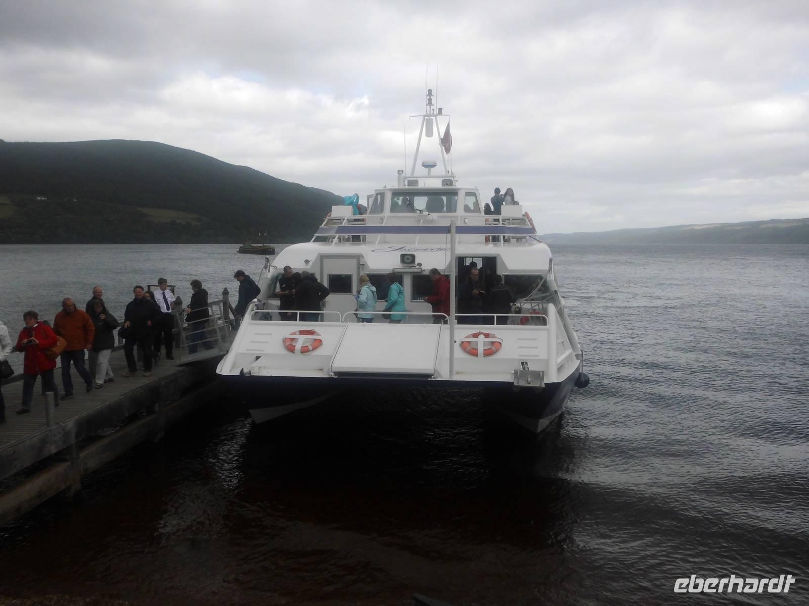 Wir hielten uns einige Zeit hier auf, ließen die Geschichte und Geschichten rund um die Schlacht auf uns wirken und fuhren dann in die Hauptstadt der Highlands, nach INverness, wo Zeit für einen - leider recht kurzen - Stadtbummel blieb. Dann ging es zu einem kleinen Hafen am Ufer von Schottlands bekanntestem See, an den schwarzen Wassern des Loch Ness. Dieser langgestreckte, knapp 40 km lange, nur etwa eineinhalb Kilometer breite und überaus tiefe Rinnensee ist sicher am besten bekannt für seine Legenden um das Ungeheuer von Loch Ness. Von Urquhart Castle, unserem Ziel nach der bevorstehenden Bootsfahrt, sollen die meisten Nessie-Beobachter fündig geworden sein, weshalb die Burg fast als Wohnsitz des legendären Ungeheuers gilt, ebenso wie der kleine Ort Drumnadrochit mit seinem Besucherzentrum für „Nessie", das Seeungeheuer. Loch Ness ist mit seiner Fläche von über 56 km² der zweitgrößte See Schottlands und hat durch seine große Tiefe das bedeutendste Wasservolumen aller schottischen Seen. Während unserer Bootsfahrt konnten wir das nahezu schwarz wirkende Wasser sehen - durch die Schwebstoffe im Wasser, eingeschwemmt aus dem umliegenden Torfmooren durch die Zuflüsse des Sees, gibt es unter Wasser so gut wie keine Sicht und die